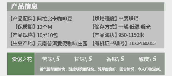 爱伲庄园 爱伲之花 有机精品挂耳咖啡 10包/盒 雨林联盟认证