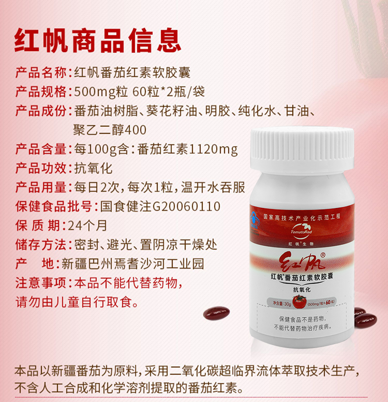 - 新疆红帆生物科技有限公司立足于利用高新技术研发生物抗氧化剂的科研领域,为广大消费者提供健康、安全、有生物学活性的保健食品,是目前为止国内最大、世界第二的天然番茄红素的生产厂家。