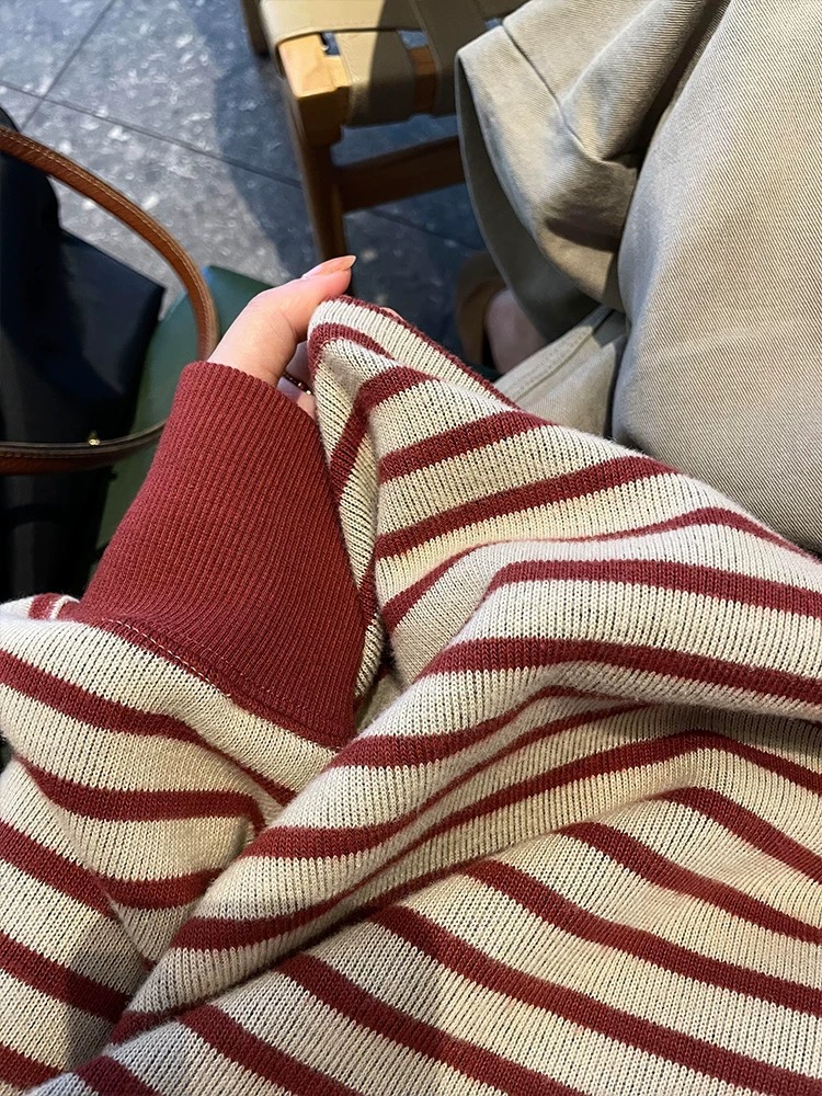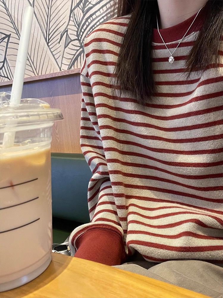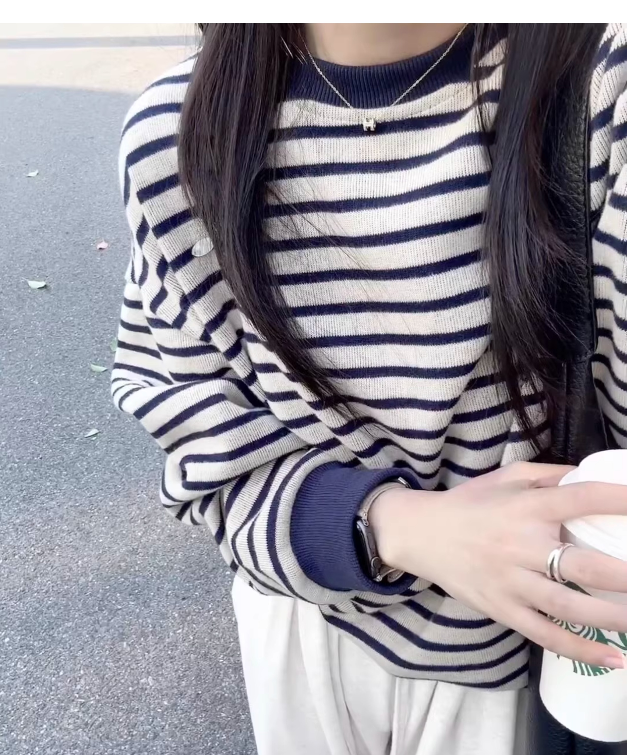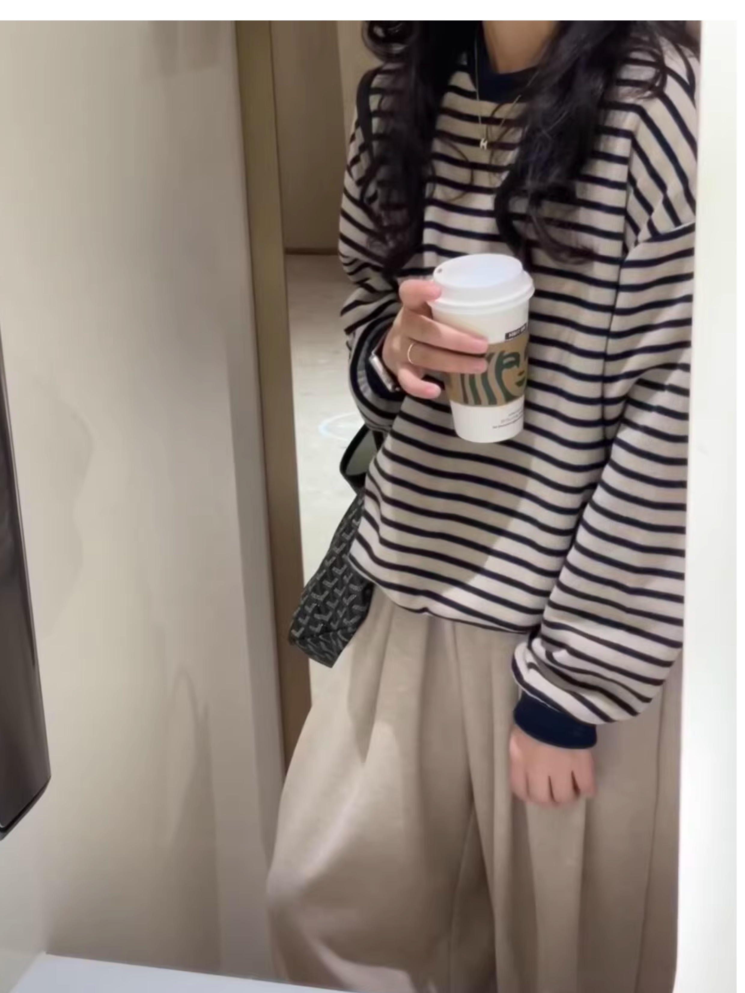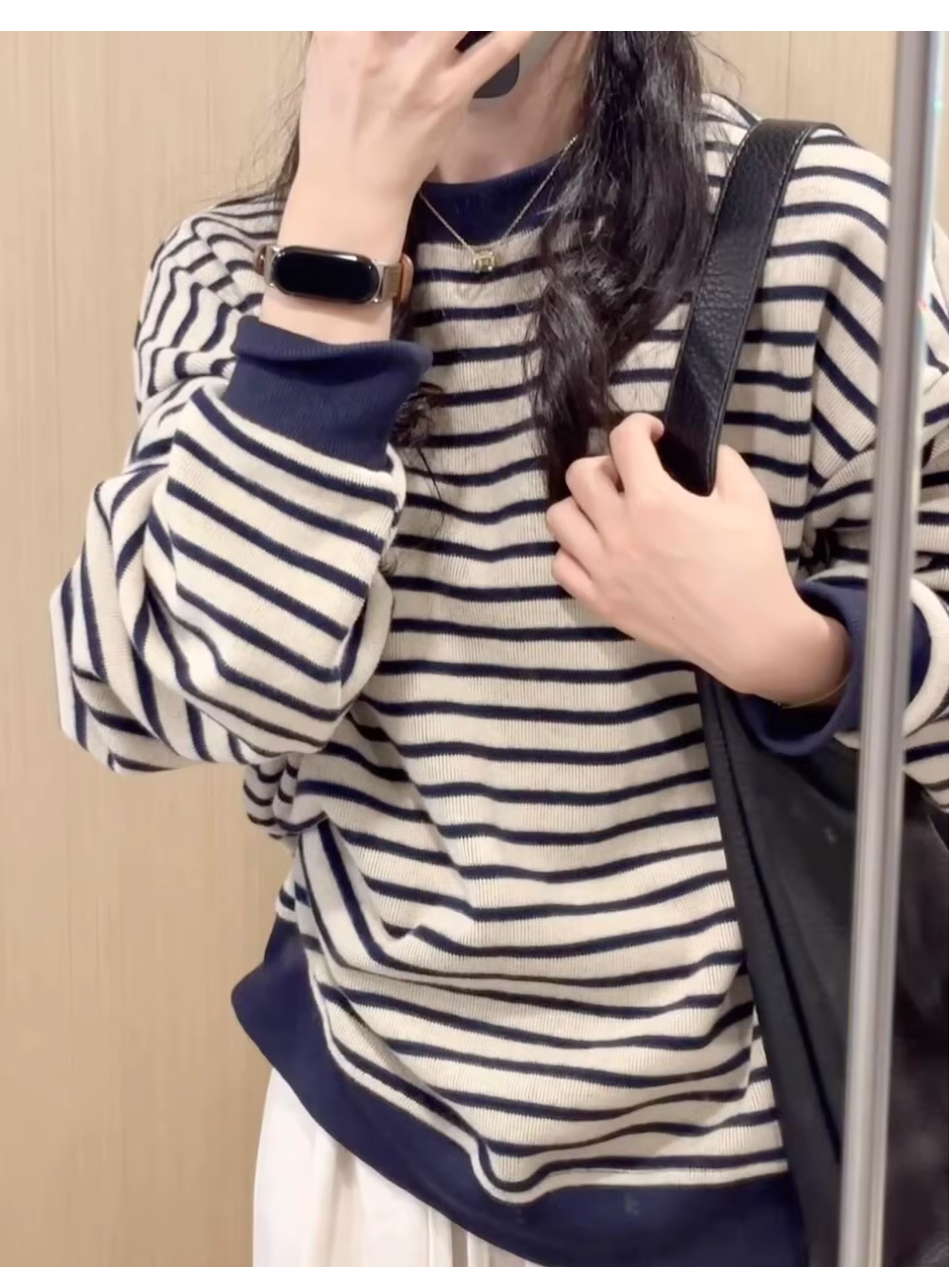 韩系复古撞色条纹卫衣 秋冬季宽松慵懒风内搭套头上衣