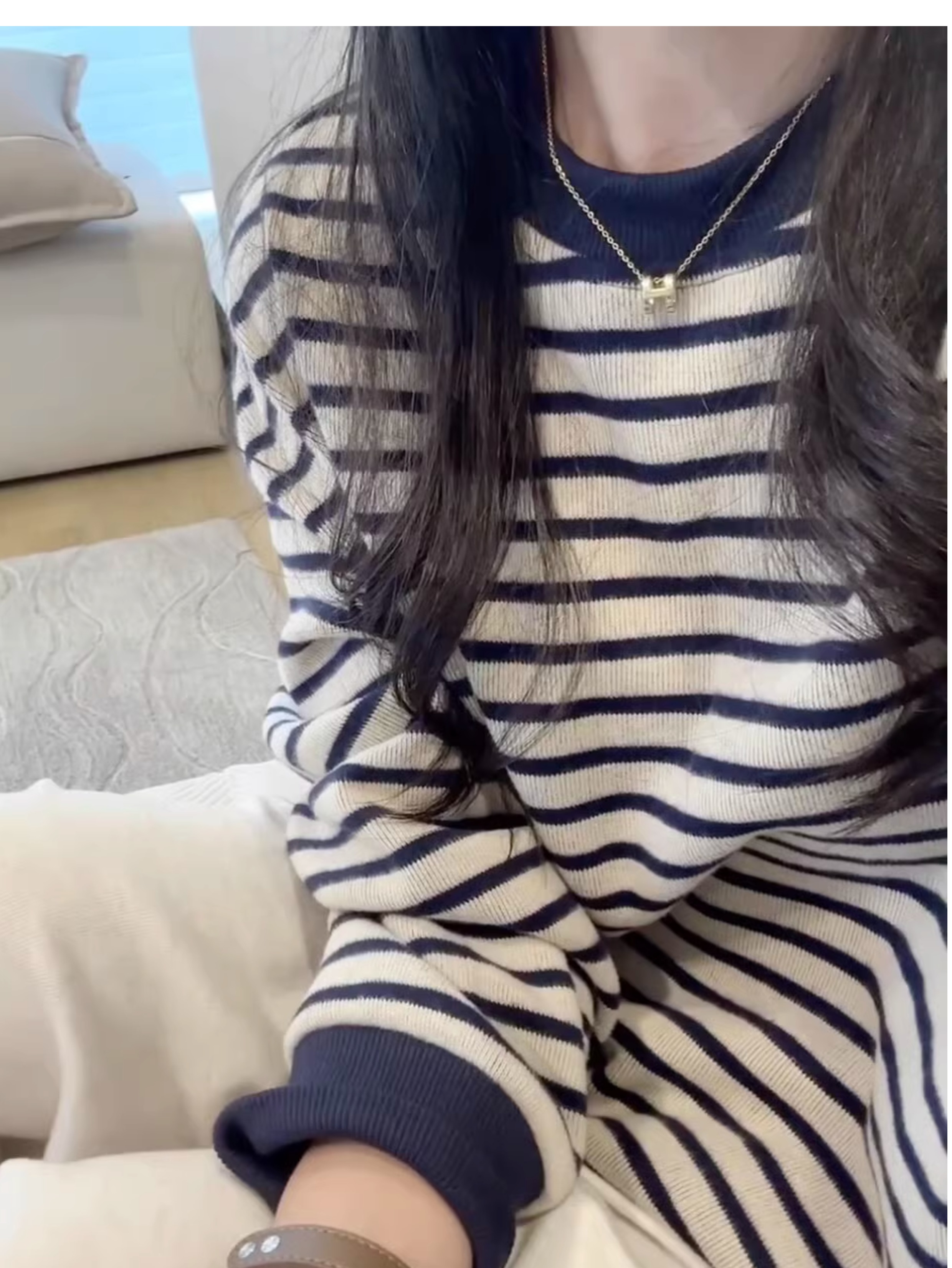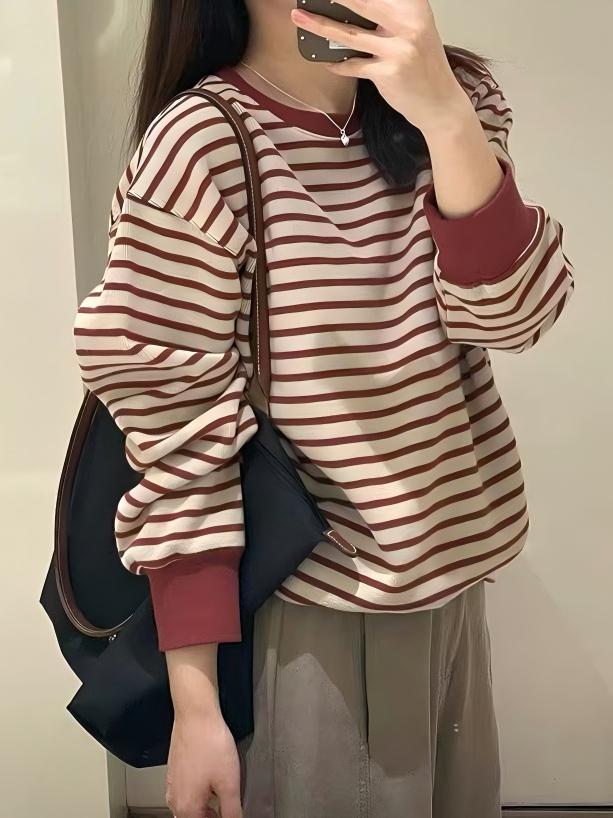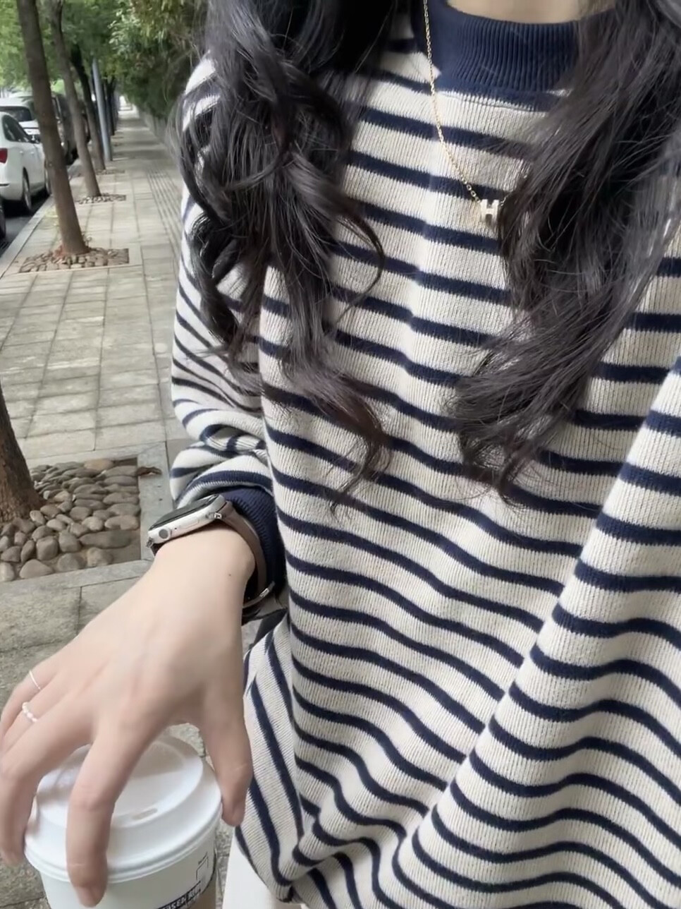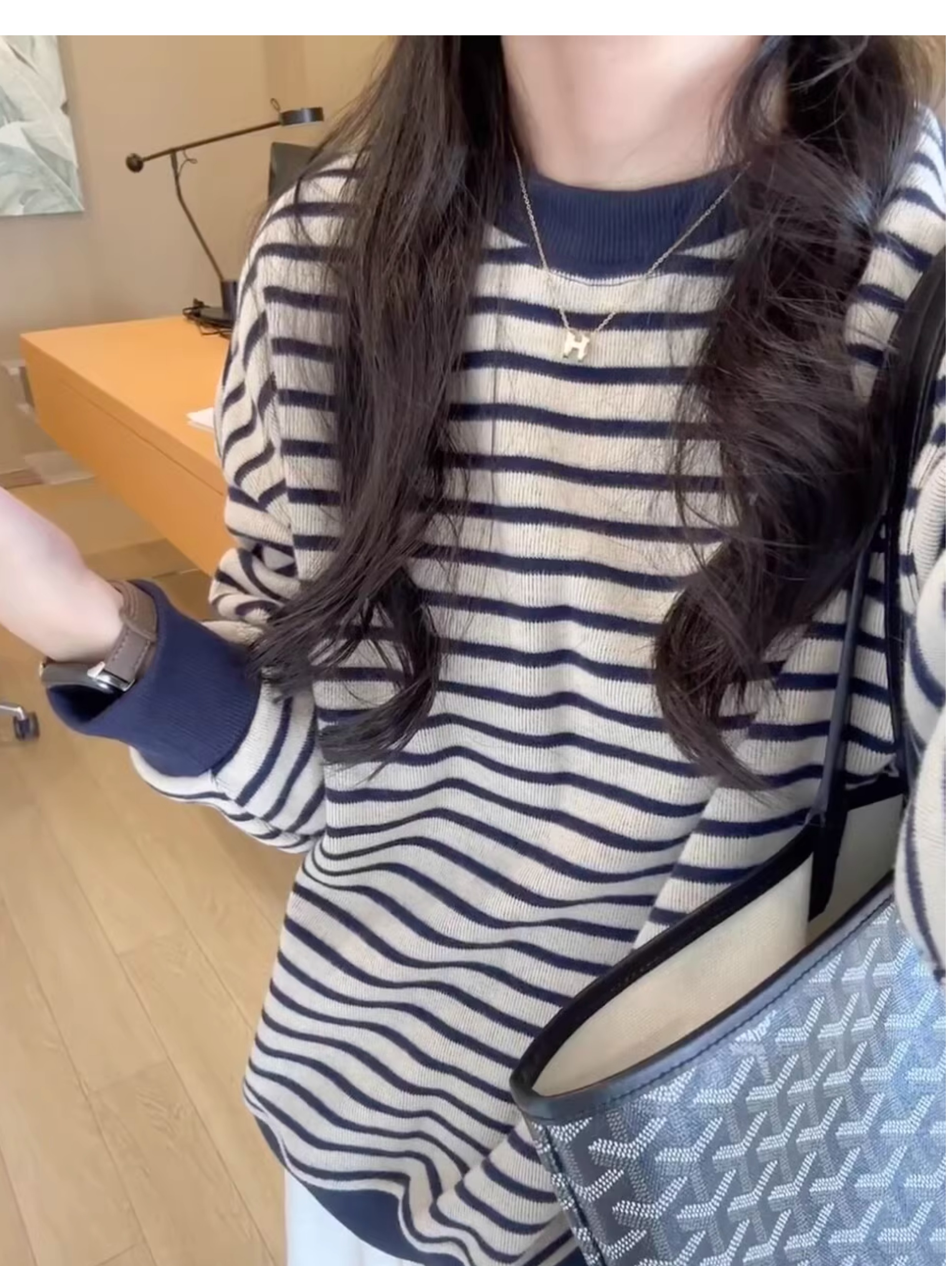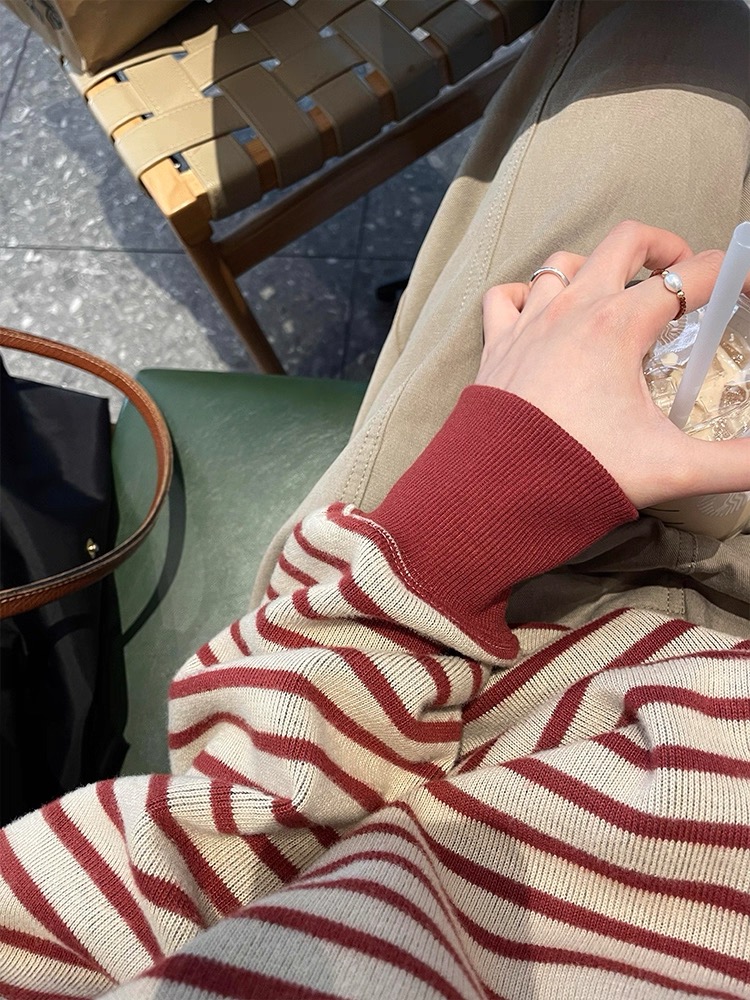 韩系复古撞色条纹卫衣 秋冬季宽松慵懒风内搭套头上衣