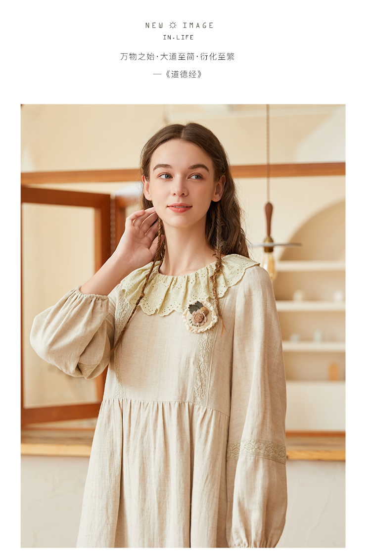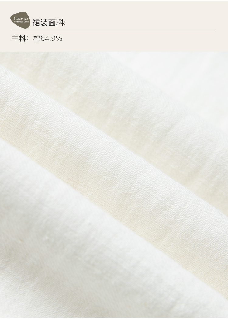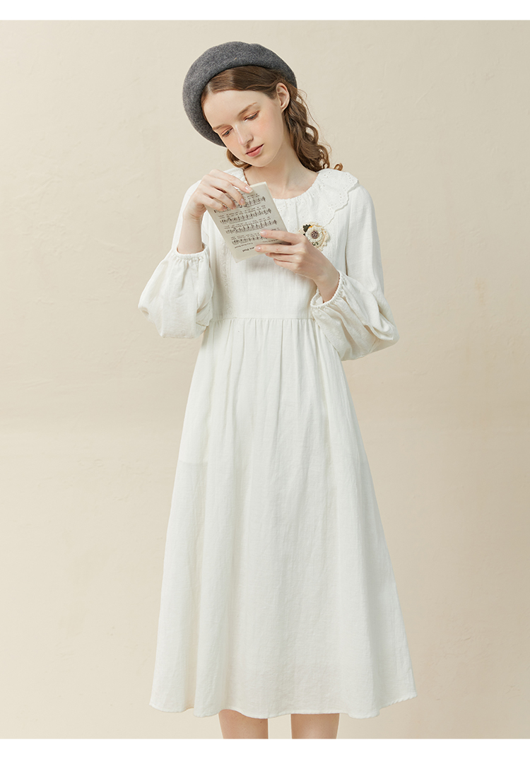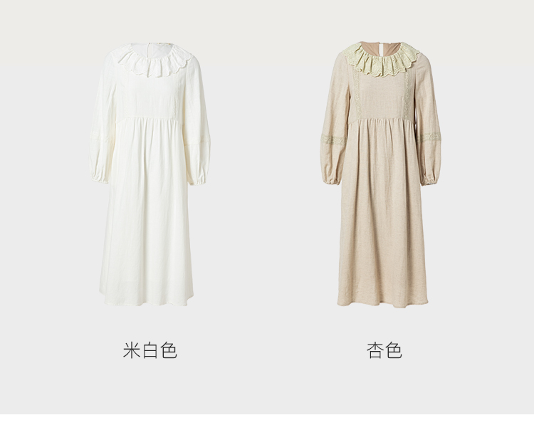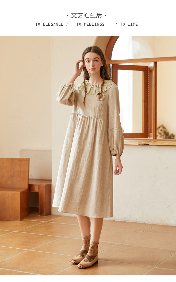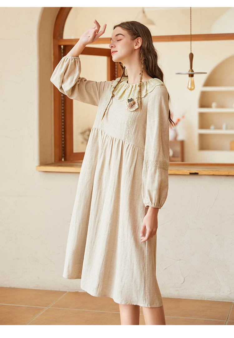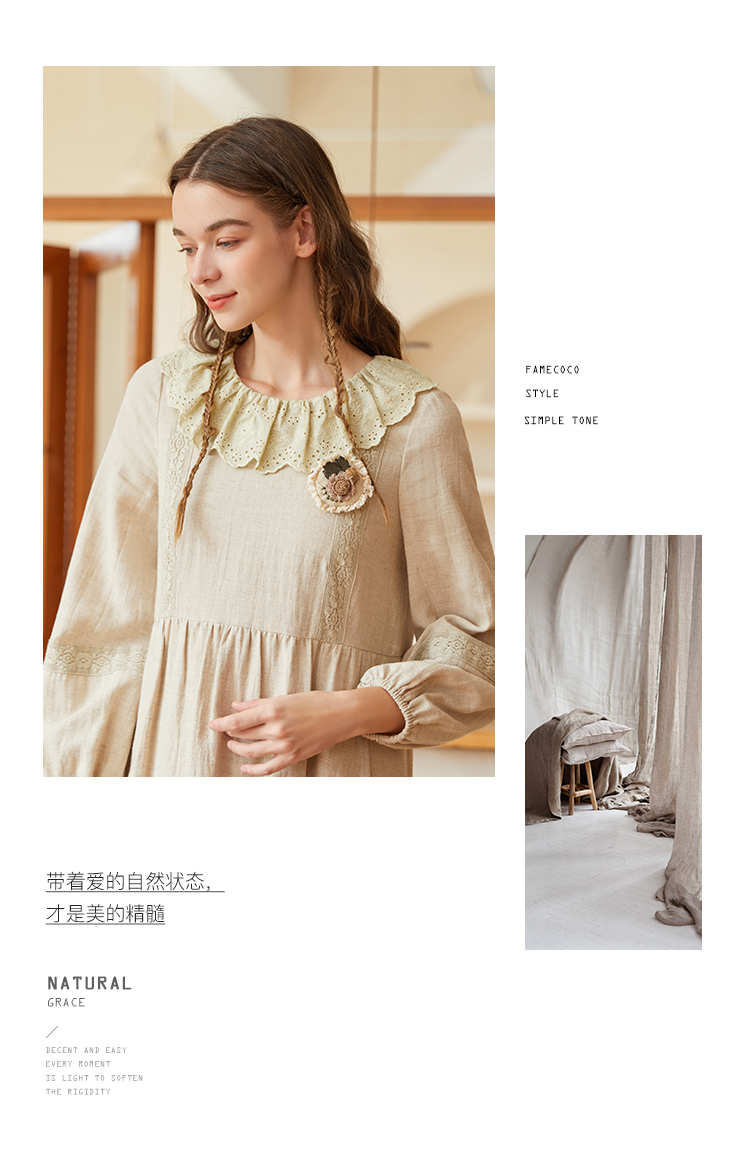 Famecoco范可儿棉麻娃娃领连衣裙泡泡袖宽松裙子遮肚子F228FA011