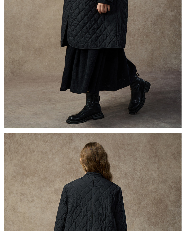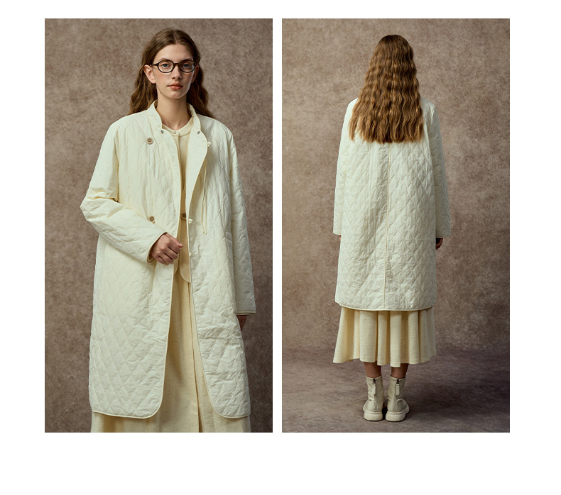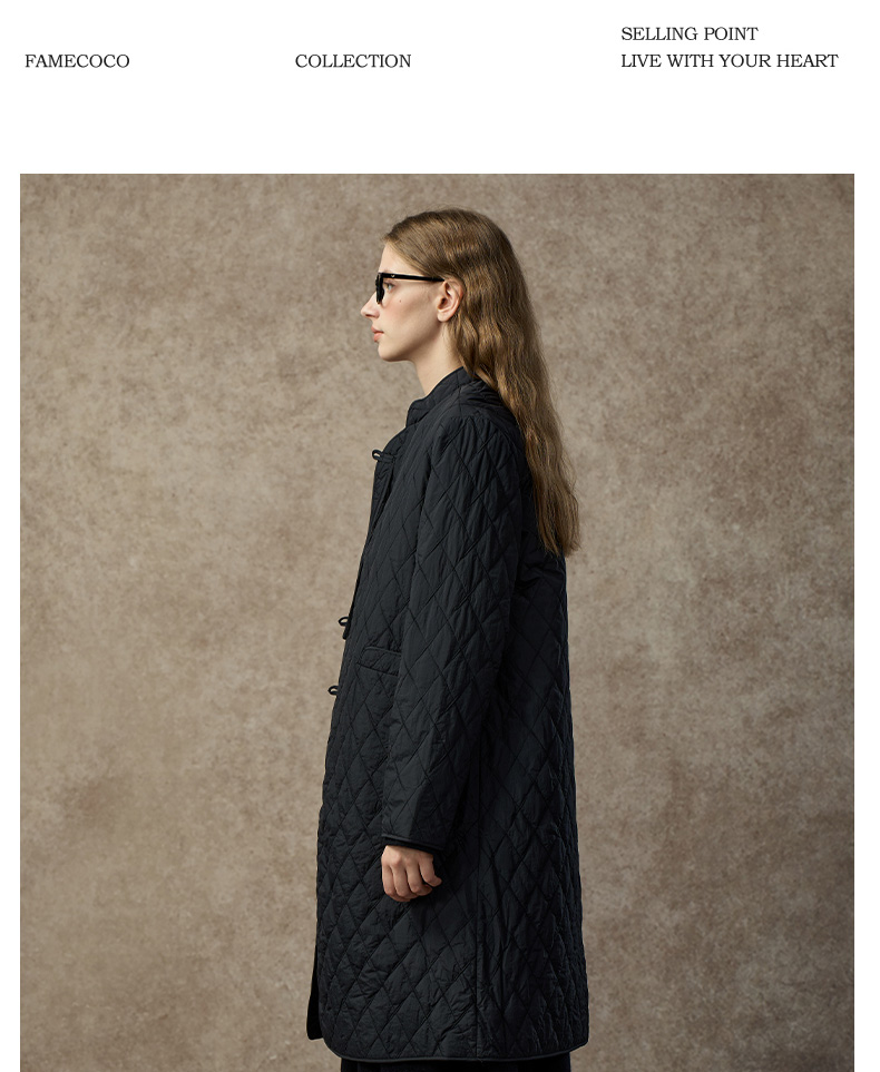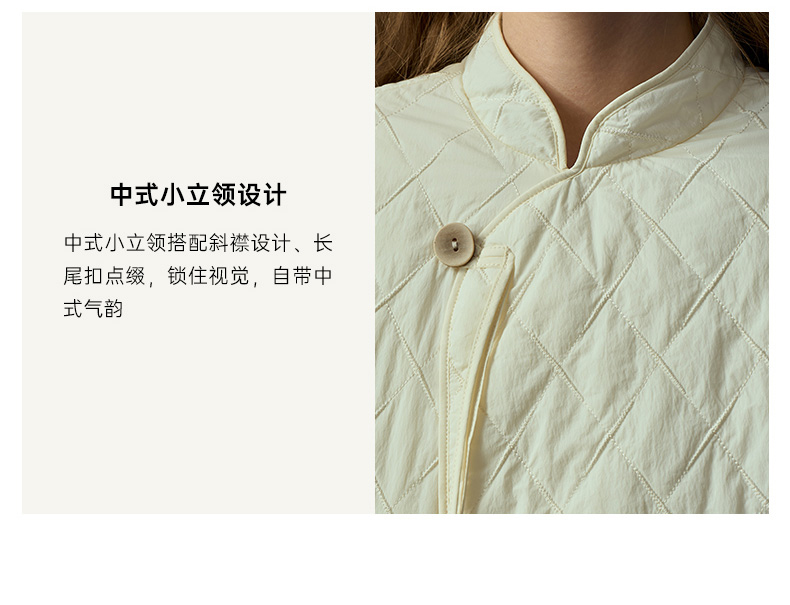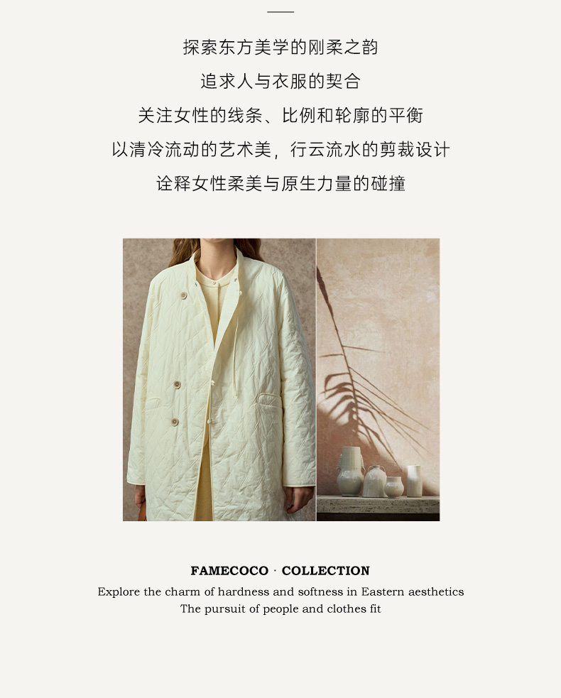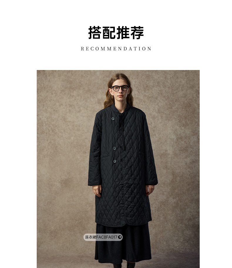 Famecoco范可儿小立领中式改良长款菱格纹轻薄棉服FAC8AE001