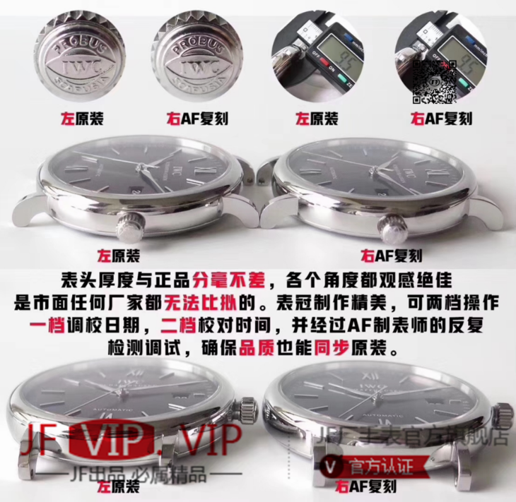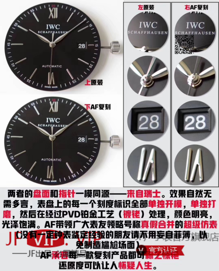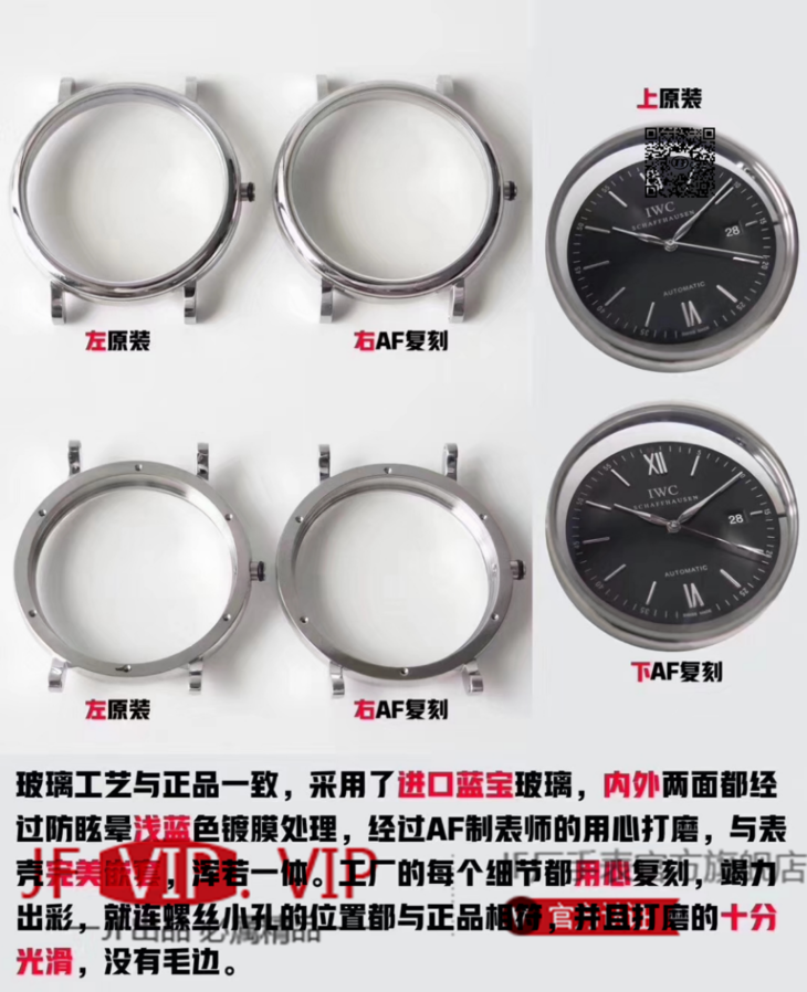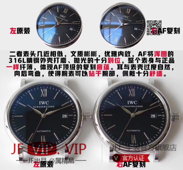 【睿智儒雅“菲”同凡响】AF精雕细琢,复刻经典——万国柏涛菲诺系列,简约纤薄,不受潮流左右,尽享从容时光【表壳】腕表尺寸40mmX9.5mm。返璞归真的设计,优雅内敛,浑圆型的表壳散发出AF复刻功底。整个表身与正品一样纤薄。表耳与表壳过度自然,佩戴舒适,方便收于袖口之中。【美洲短吻鳄】与原装一致采用美洲短吻鳄鱼皮表带,搭配AF制表师精心打磨的精钢针扣。完美与表头相融,呈现无敌质感。【精彩细节】1.采用逆时针调日历的TOP级瑞士2892机芯,实现所有功能和操作方式与原装一致 2.修正市面所有版本的任何不足,支持任何版本的较量,部分配件支持PK原版3.字面,指针,玻璃等高难度核心配件均可与原装通用。内外双修,无懈可击,AF出品,必属精品。