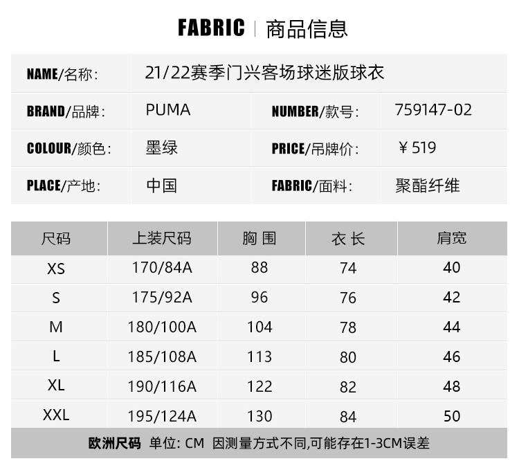 SFS彪马Puma 21/22门兴格拉德巴赫客场球衣球迷版足球服759147-02