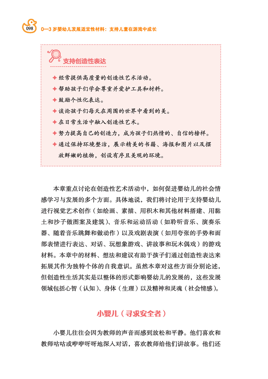 ·细致观察和敏感回应婴幼儿,在弹性课程中促进他们的认知、社会情感和身 体动作发展。