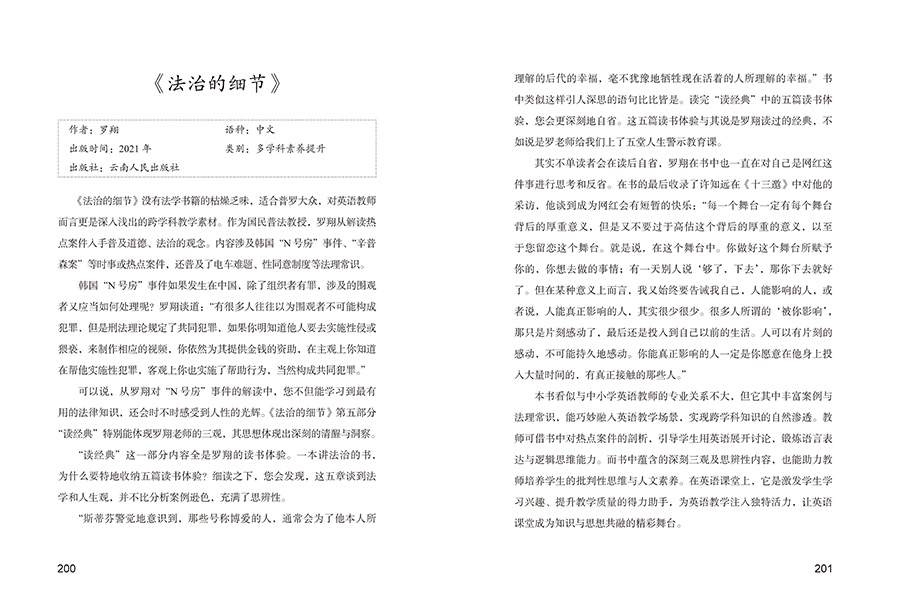 自2017年起,在朱永新教授和中国英语阅读教育研究院长、北京师范大学王蔷教授的亲自指导下,经过六年多的调研、征集、试读和评审,以及无数次的论证和修改,《中小学英语学科书目(教师版)》终于完成。《中小学英语学科书目(教师版)》包含30本基础阅读书目,70本推荐阅读书目,共100本图书。同时,书目从英语学科特色及英语学科教学实际需求出发,包括英语学科教学、语言能力提升、英语教学工具书、多学科素养提升四大类。为了帮助老师更好地了解每一本图书,我们为书目中的每一本图书都撰写了推荐理由,希望它能帮助英语教师更理性地认识到英语学科的重要性和进行专业阅读的意义,掌握科学的英语学科阅读教学方法,并拥有一张专业、全面、丰富的英语学科专业阅读地图。