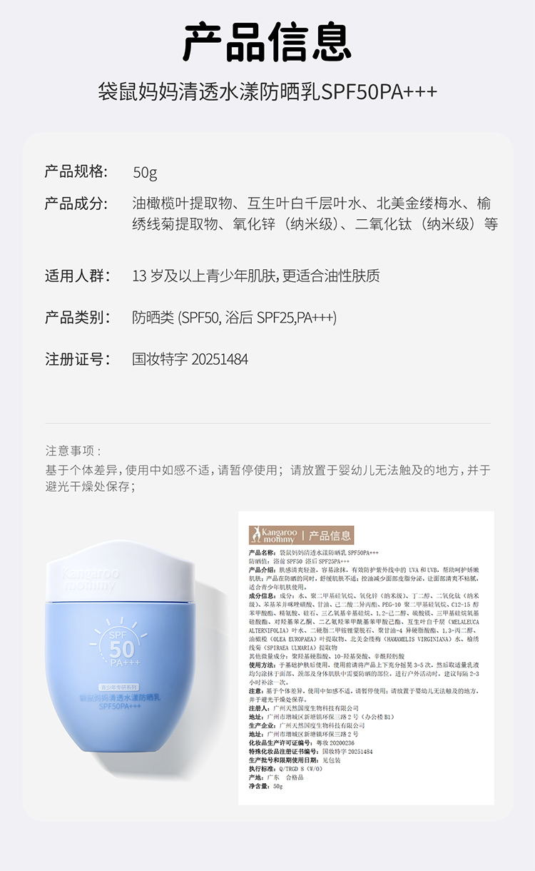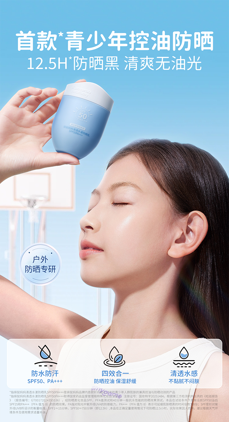 【青少年防晒乳】防晒控油清爽不闷痘 袋鼠妈妈清透水漾防晒乳50g