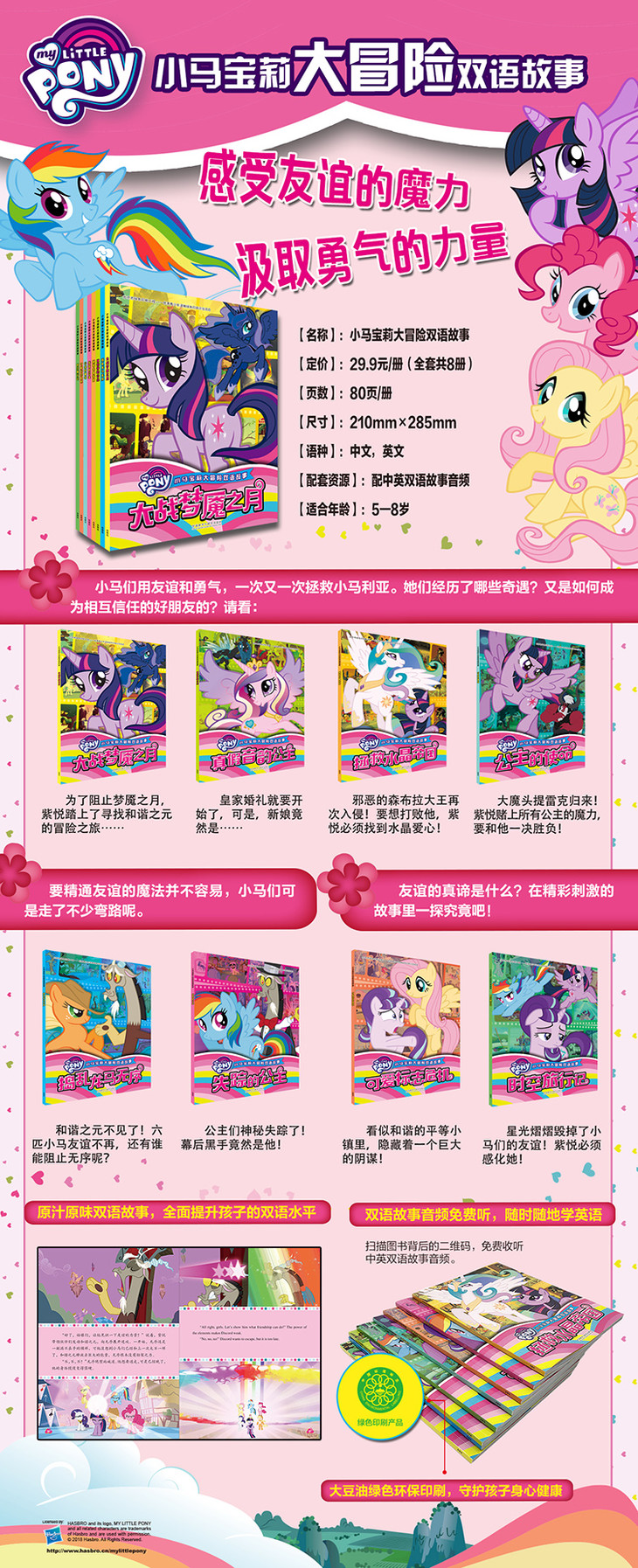 (6)绿色环保印刷,呵护孩子身心健康:《小马宝莉大冒险双语故事》采用绿色印刷标准印制,无异味,不伤手,符合人体健康要求,让孩子畅享环保健康阅读,呵护孩子身心健康!