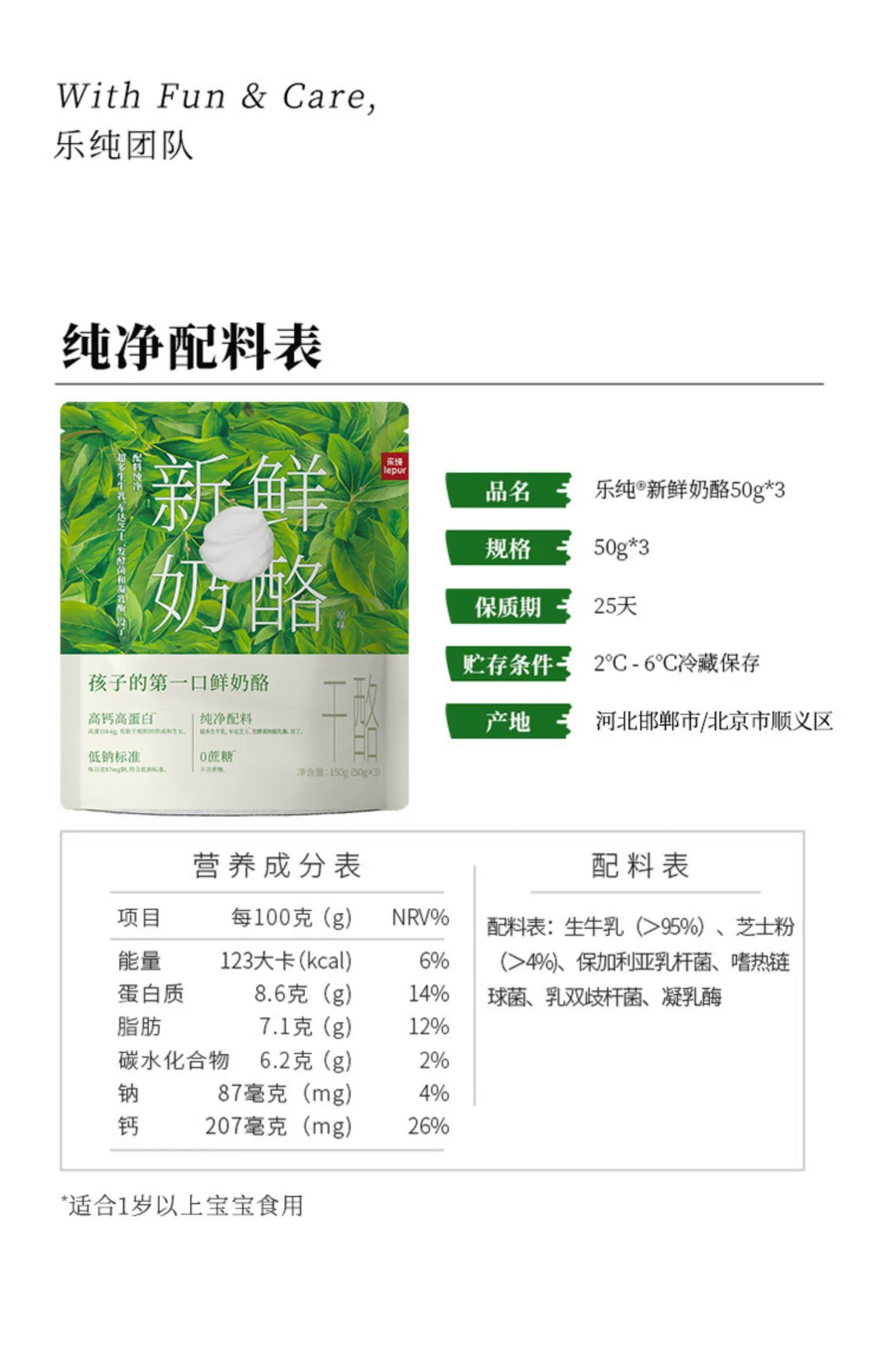 *【乐纯】低钠高钙新鲜奶酪50g*9支