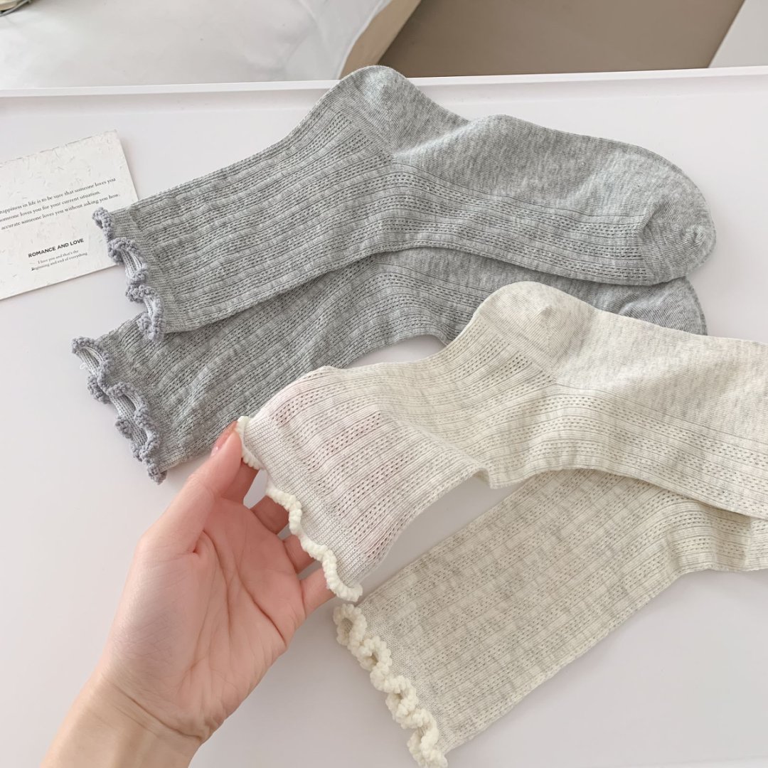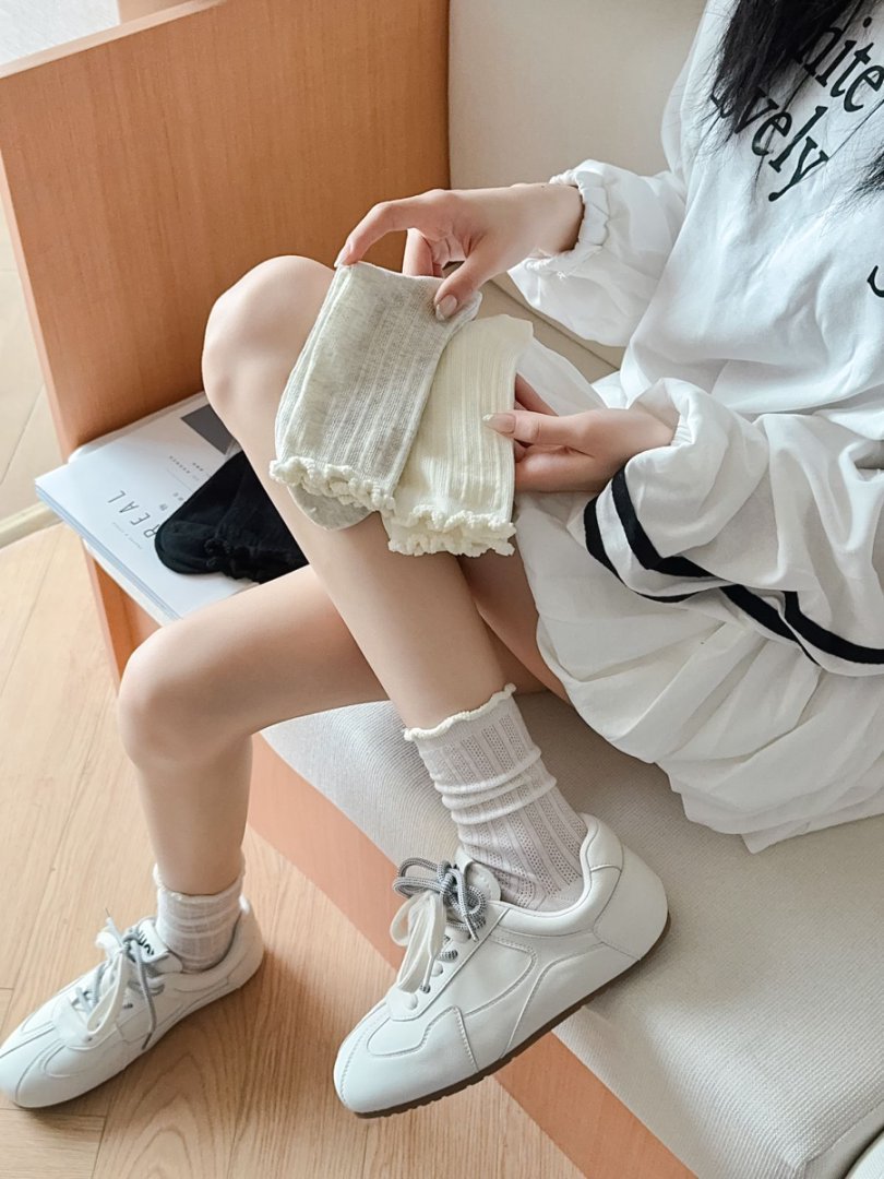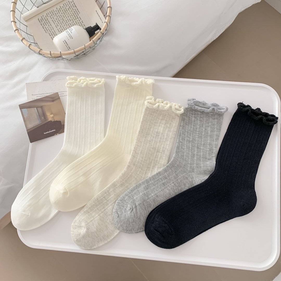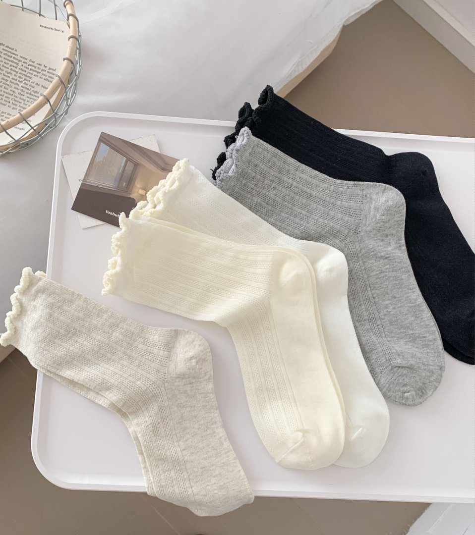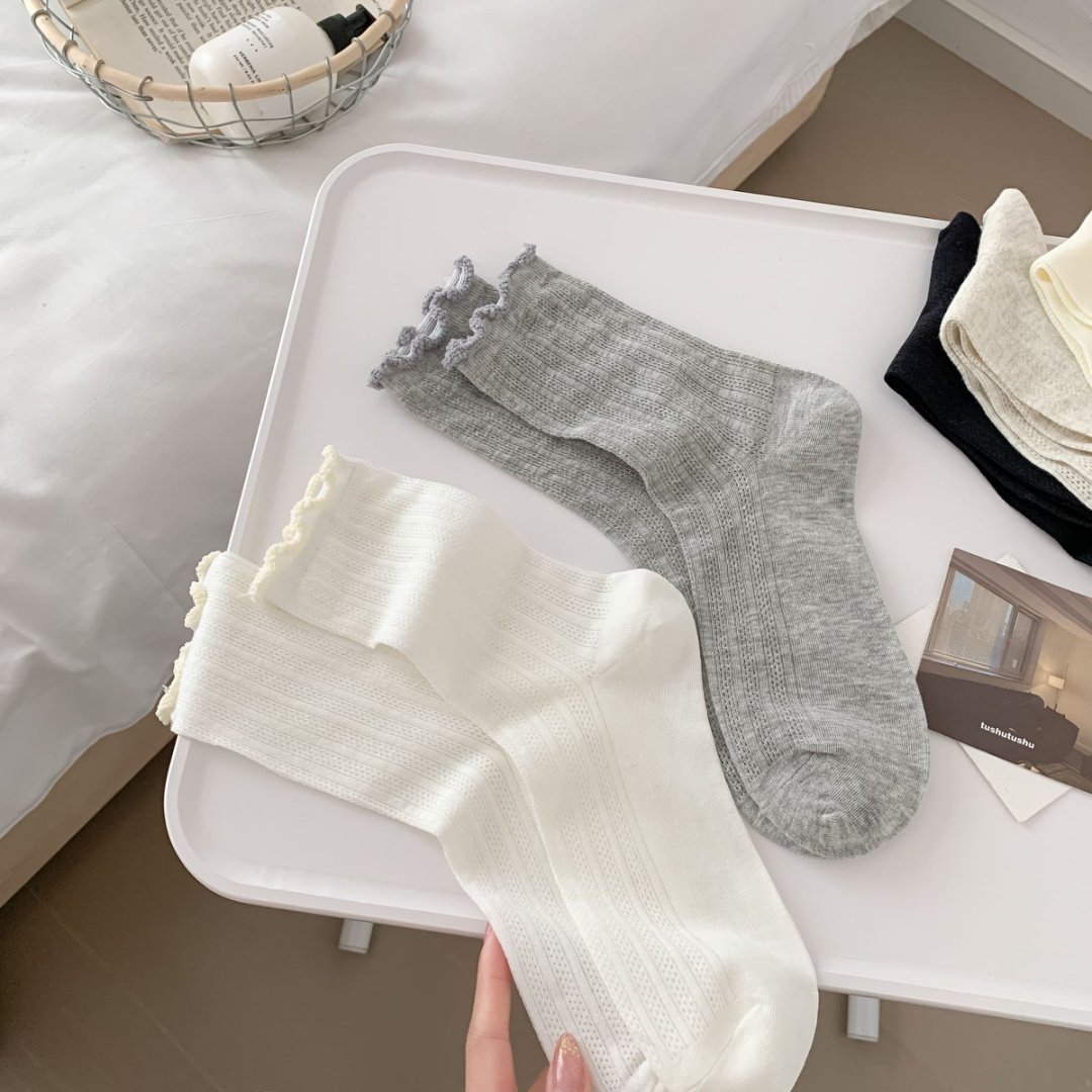 【39元5双,下单拍5】袜子女春夏季薄款中筒袜纯色网眼透气防臭木耳边学院风堆堆袜ZXFX2026