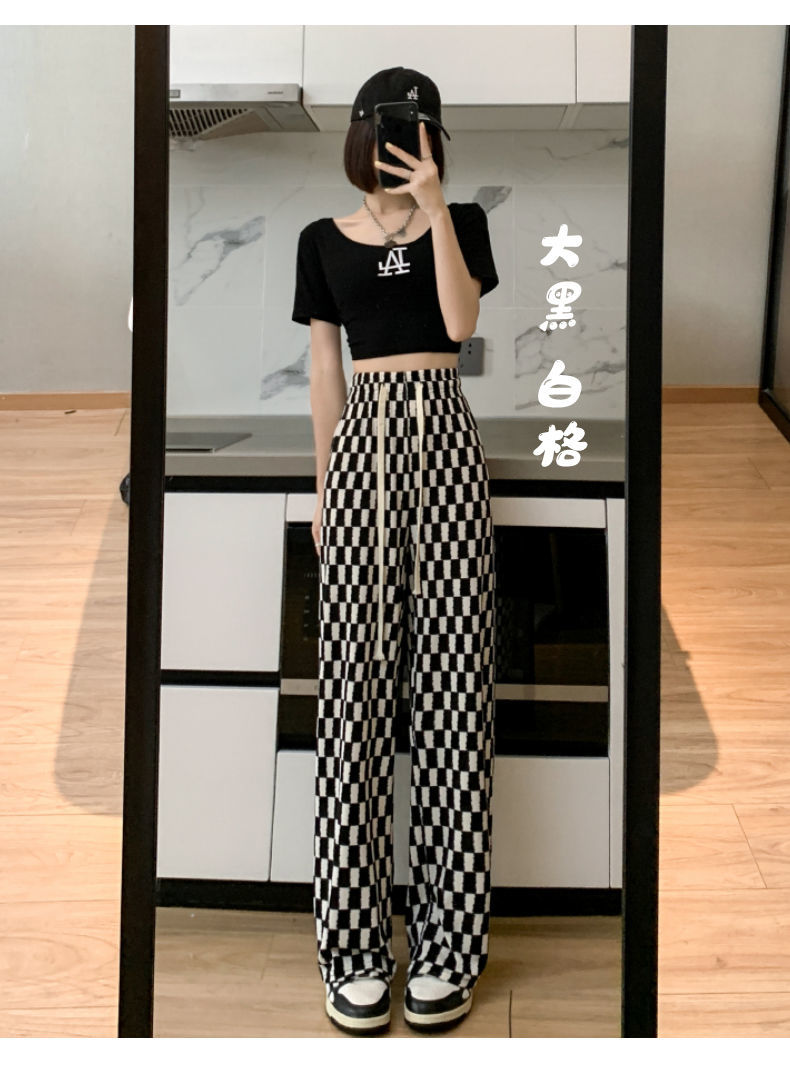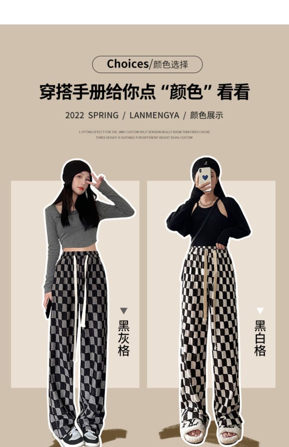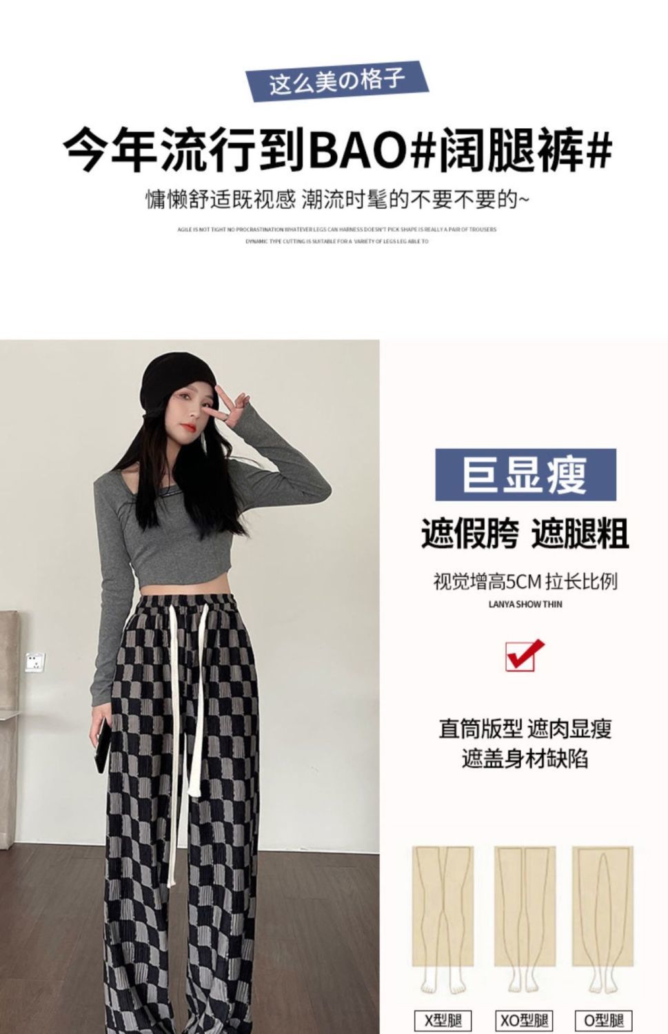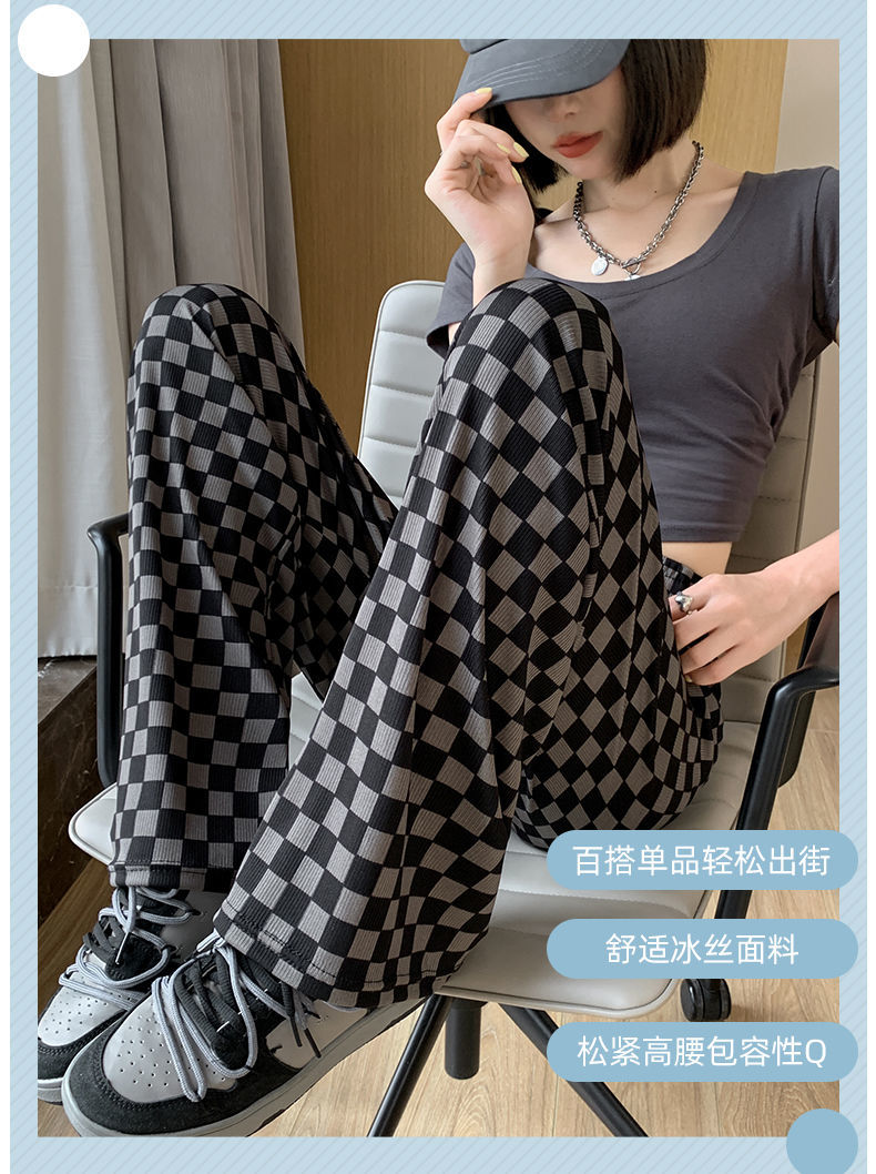 黛唯梵格子裤子女宽松韩版学生夏季薄款垂坠感冰丝休闲直筒阔腿裤