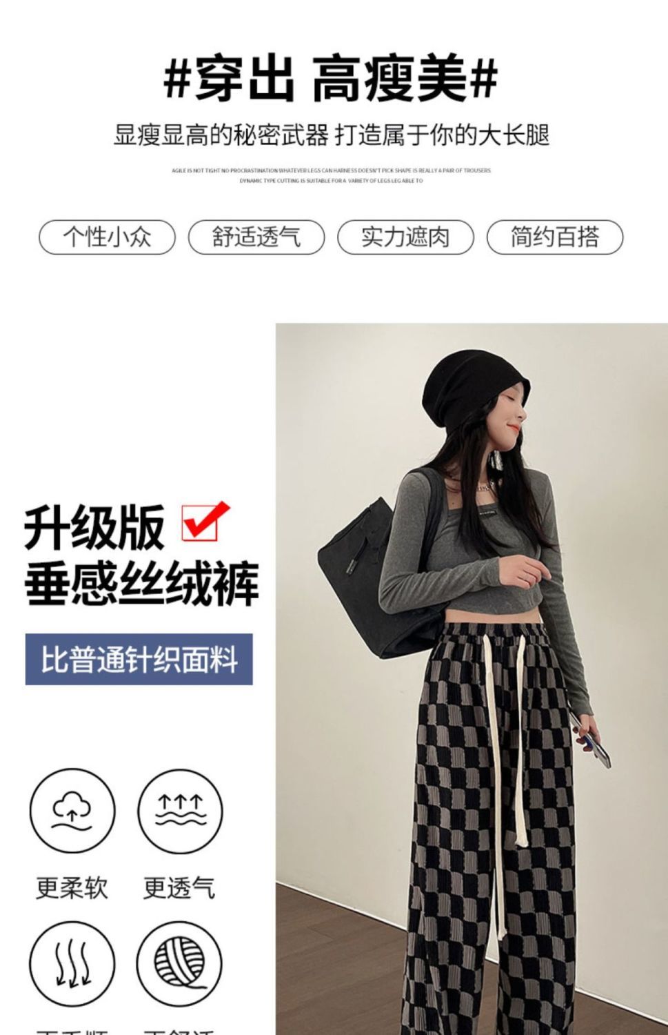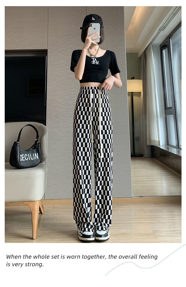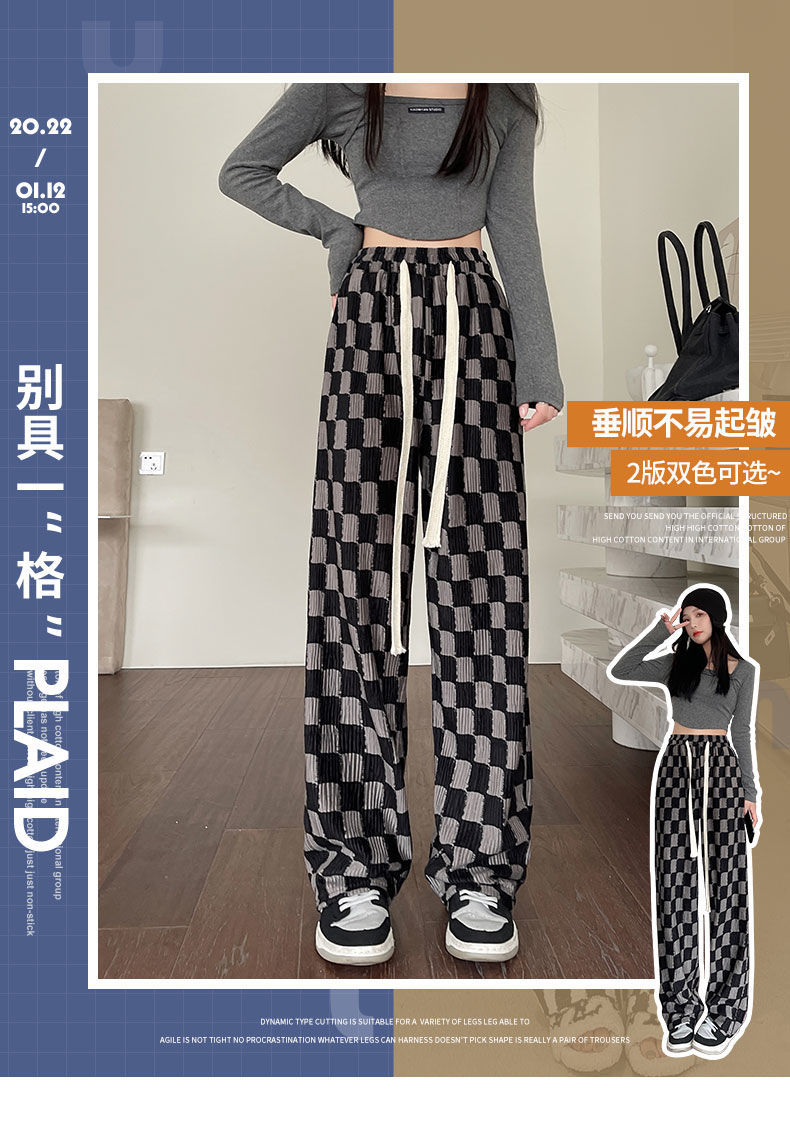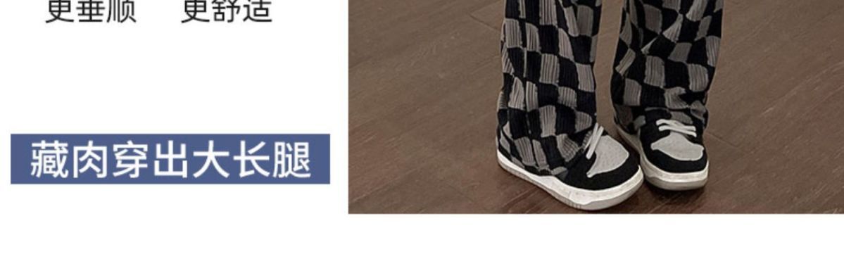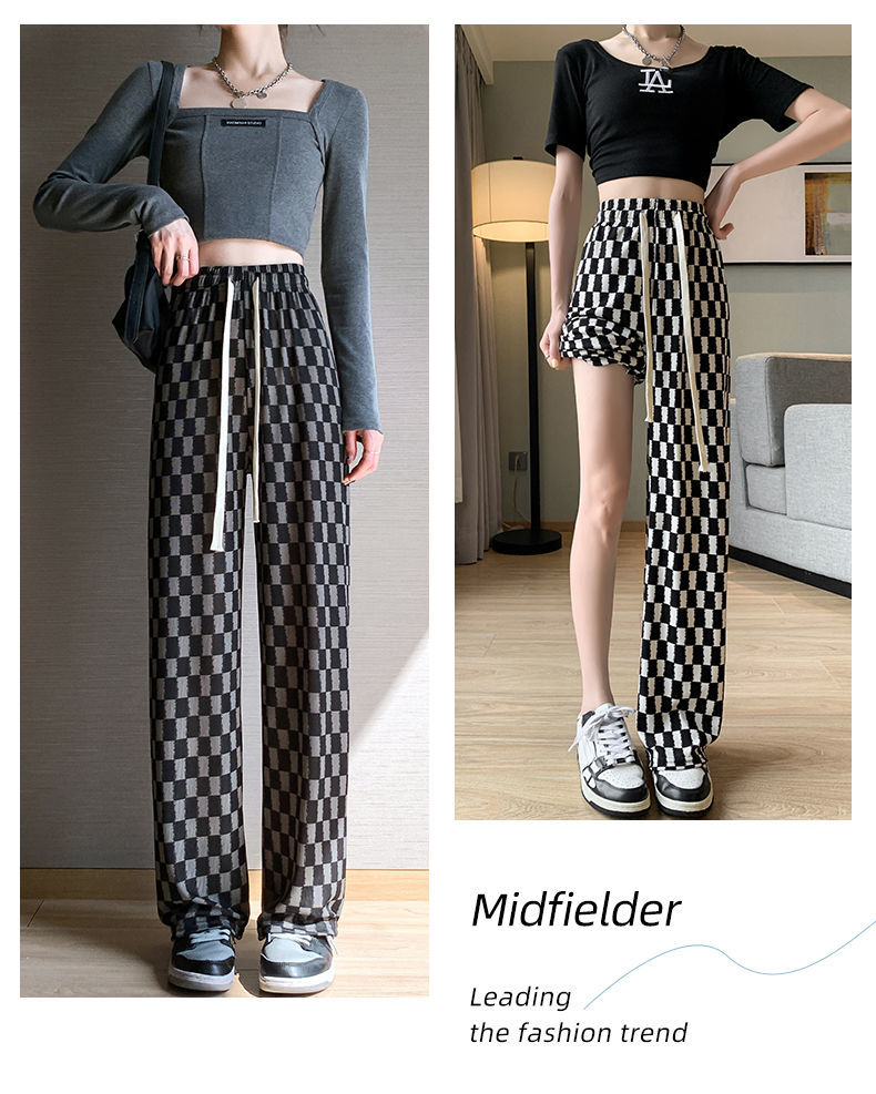黛唯梵格子裤子女宽松韩版学生夏季薄款垂坠感冰丝休闲直筒阔腿裤