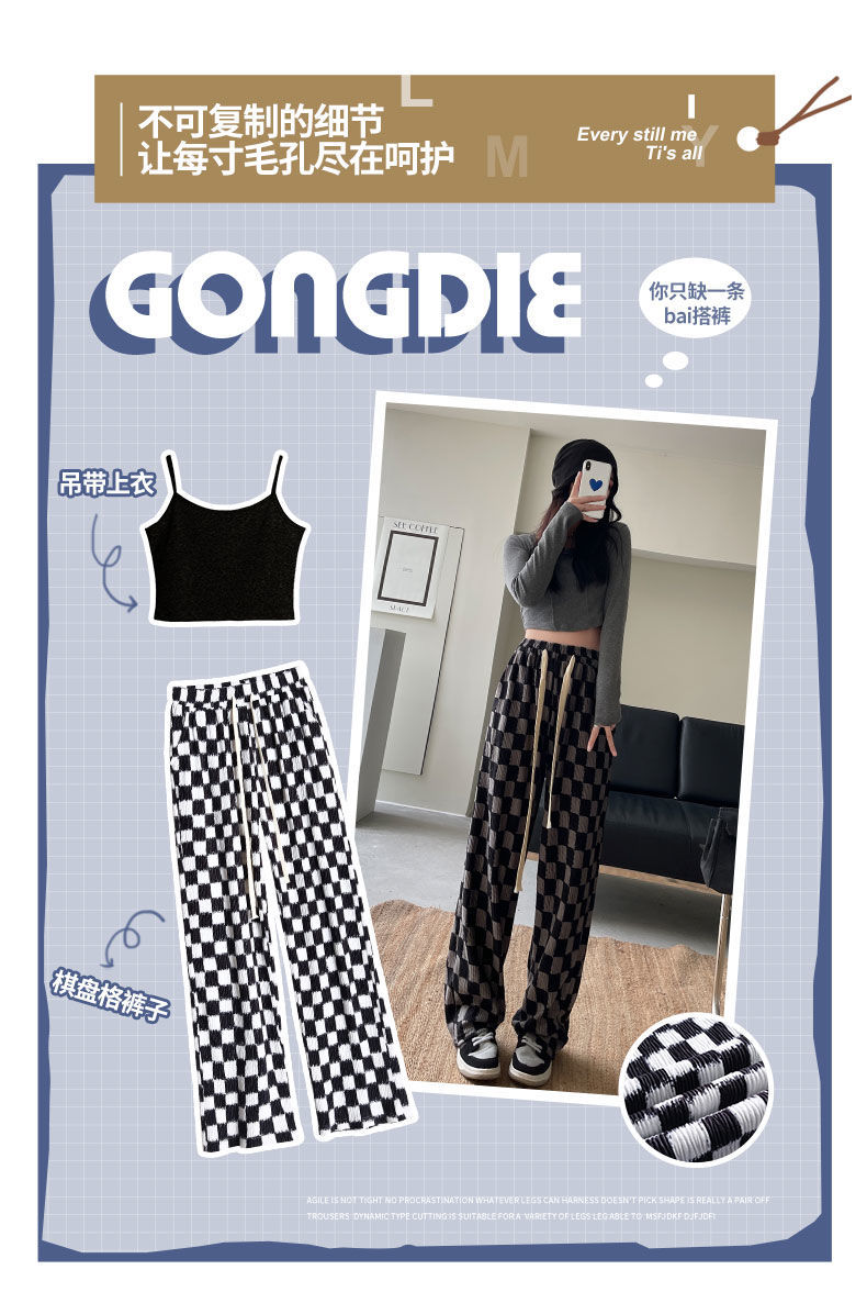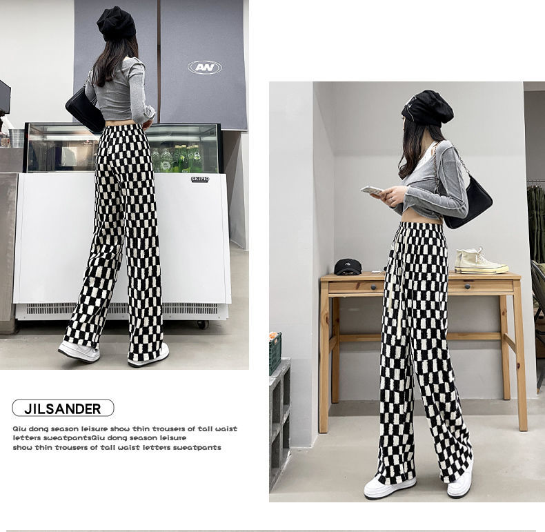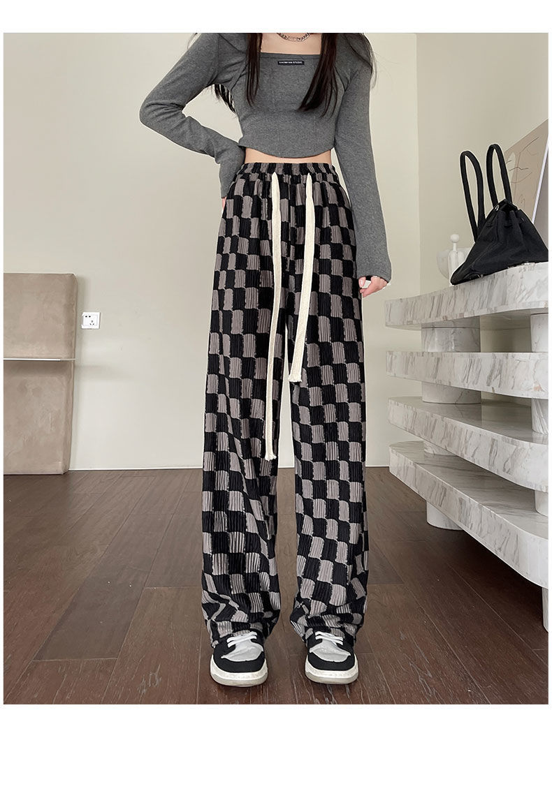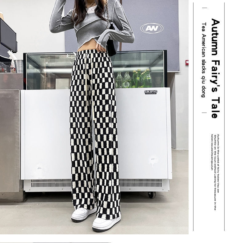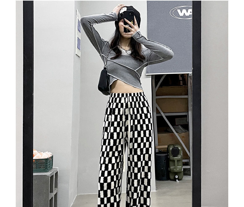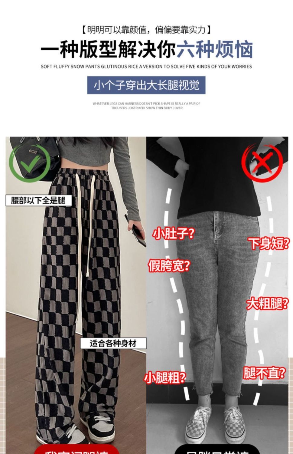 黛唯梵格子裤子女宽松韩版学生夏季薄款垂坠感冰丝休闲直筒阔腿裤