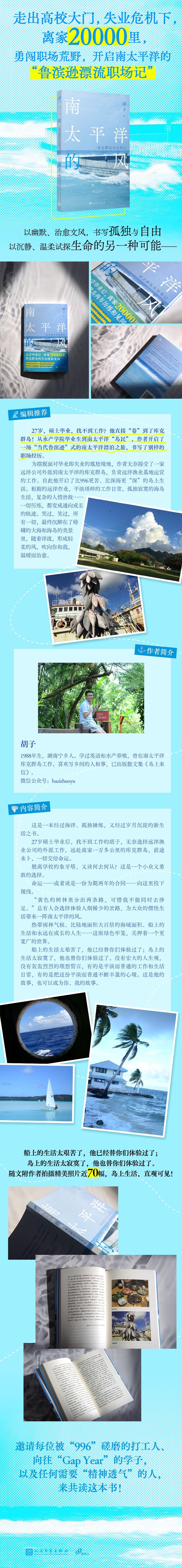 这是一本经过海洋、孤独锤炼,又经过岁月沉淀的新生活之书。 27岁硕士毕业后,找不到工作的胡子,无奈选择远洋渔业公司的外派工作,远赴离家一万多公里的库克群岛,前途未卜,一切交给命运。 脱离学校的象牙塔,又该何去何从?这是一个小众又勇敢的选择。 命运——或者说是一份为期两年的合同——向这里投下视线。 “黄色的树林里分出两条路,可惜我不能同时去涉足。”总有人会选择体验人烟稀少的岔路,为大众的惯性生活带来一阵南太平洋的风。 热带雨林气候、比陆地面积大百倍的海域面积、船上的生活和永远在成长的人生……这座绿色牢笼,关押着一个更宽广的世界。 船上的生活太艰苦了,他已经替你们体验过了;岛上的生活太寂寞了,他也替你们体验过了。没有宏大的人生观,没有轰轰烈烈的理想誓言,有的是平淡而普通的工作和生活日常,有的是把这份平淡而普通不断丰盈的心境。这是他的故事,也可以成为你、我的故事。