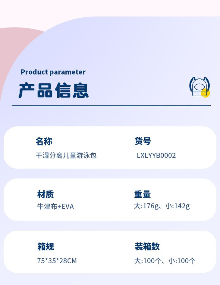 夏日炎炎,带上你家宝贝去游泳的时候,不妨备上这个泳包! 干湿分离,干净卫生,大容量,出门一包搞定 一起拥有美好夏日吧~