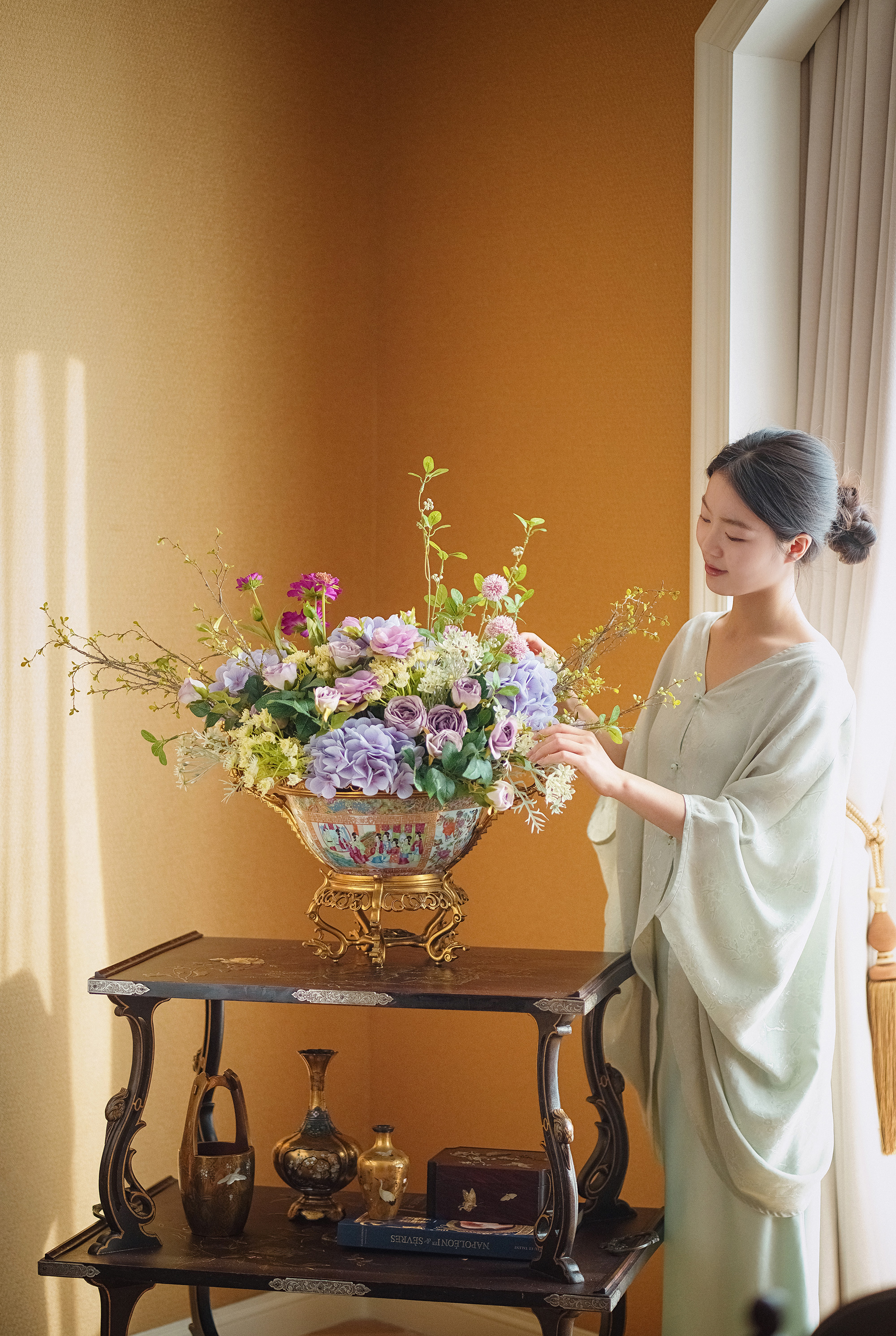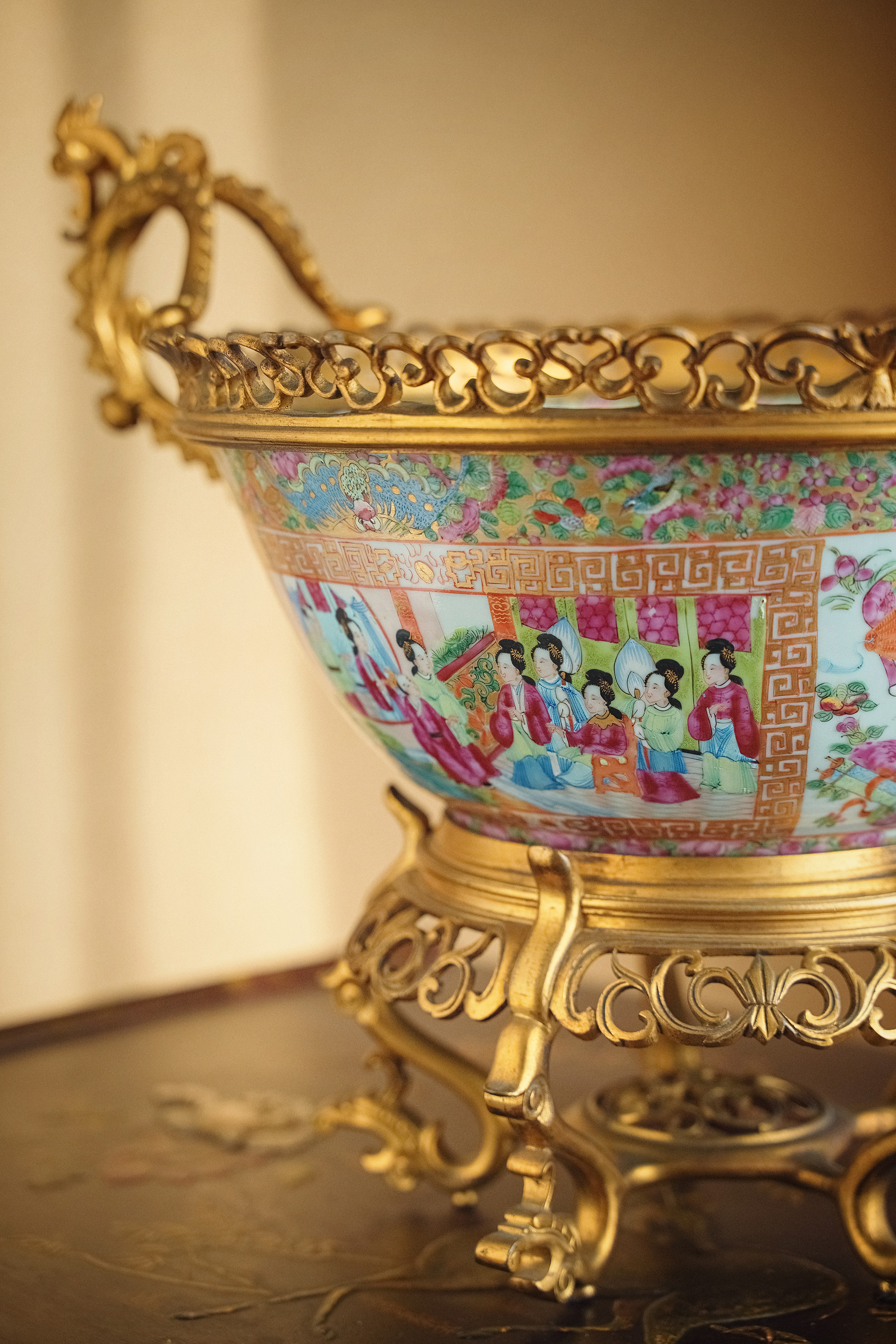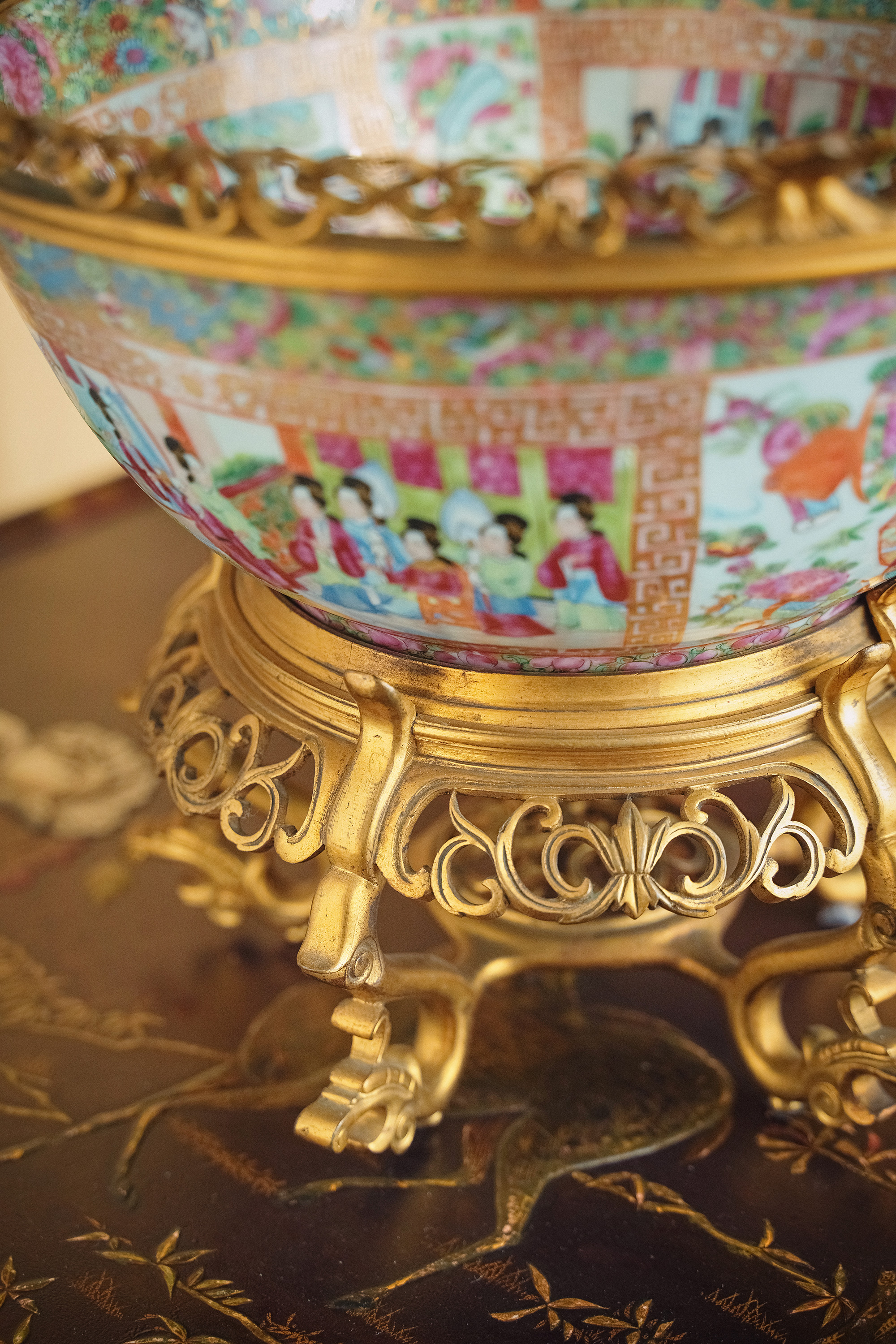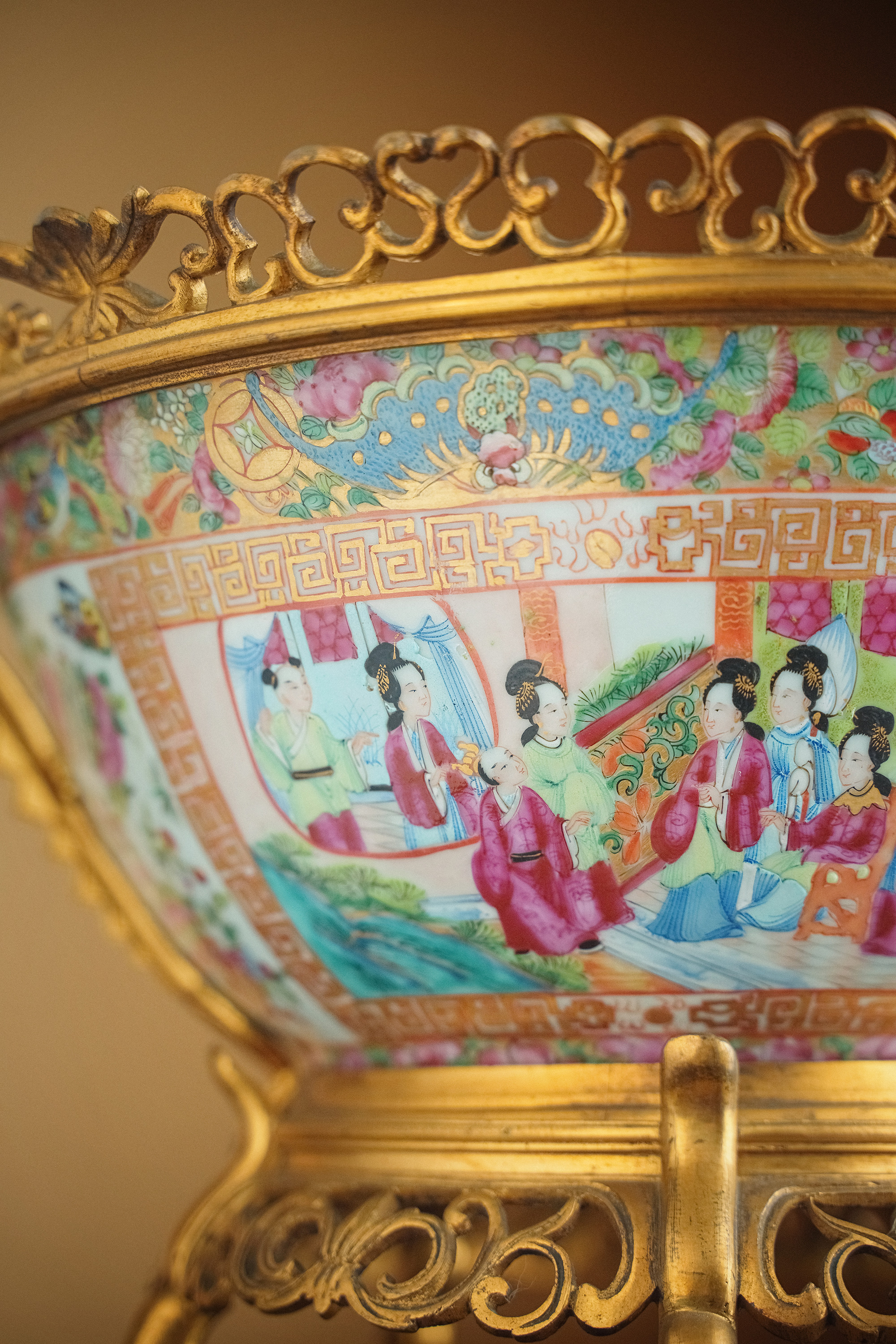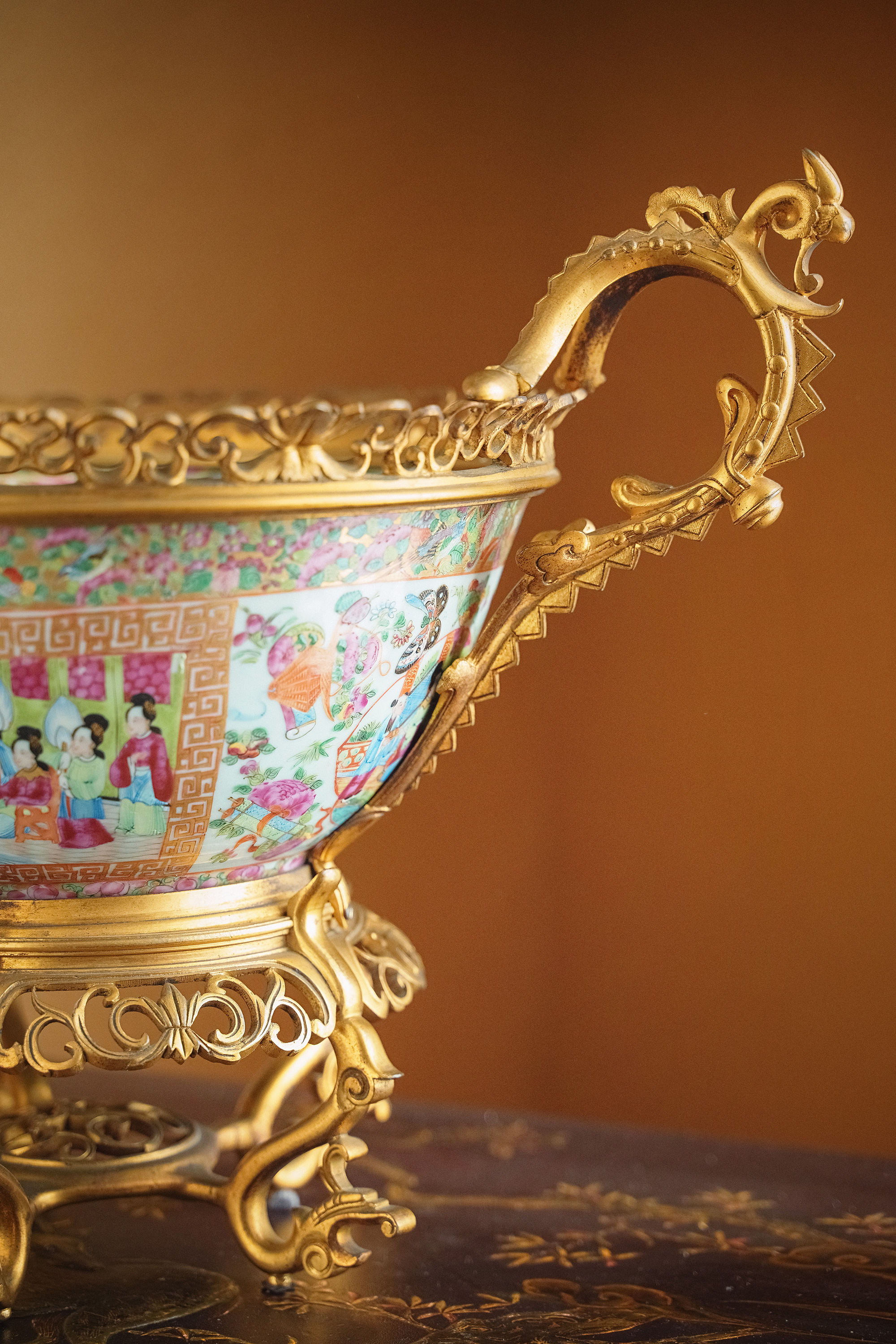 1890年代法国出品铜鎏金双耳及底座嵌传统园邸人物主题中国广彩瓷潘趣酒碗