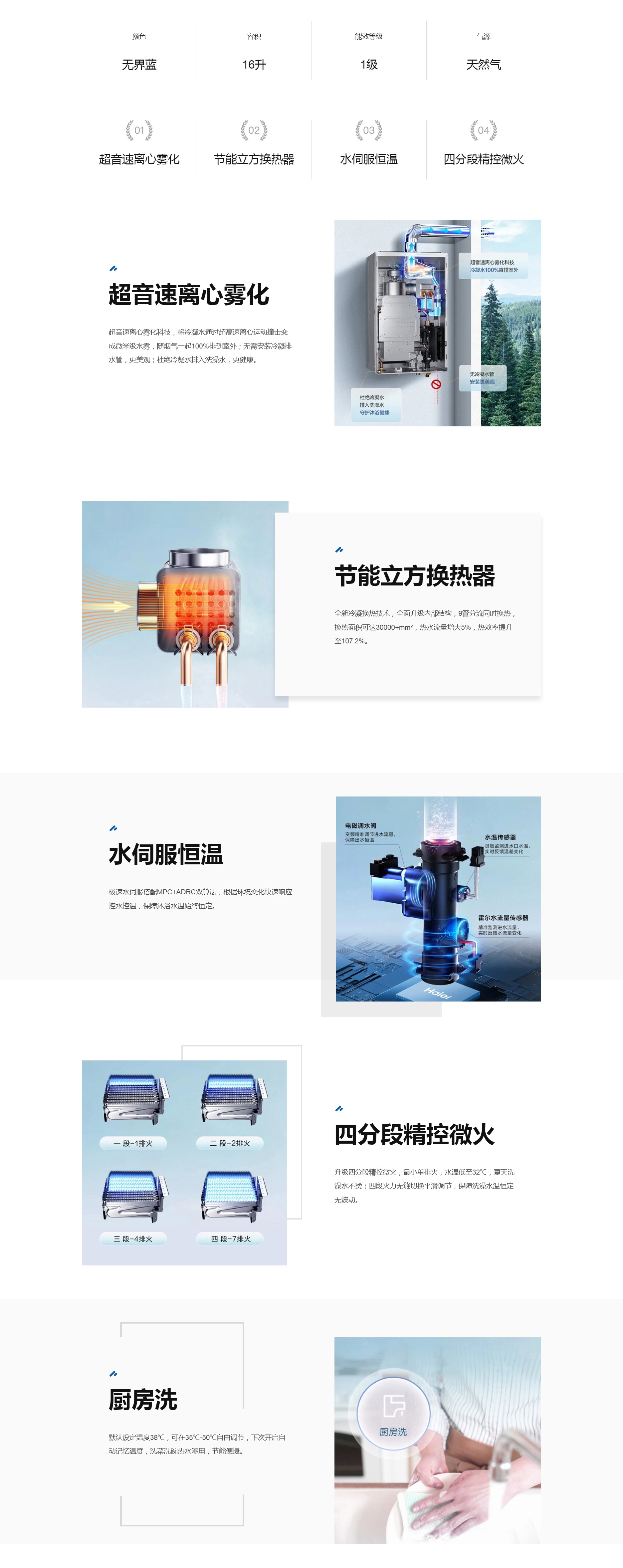 海尔 燃气热水器 JSLQ27-16E10DU1 16L 一级能效 天然气 电子脉冲点火 强排式排烟 鼓风增氧技术 防干烧保护 宽频水温调节 无界蓝