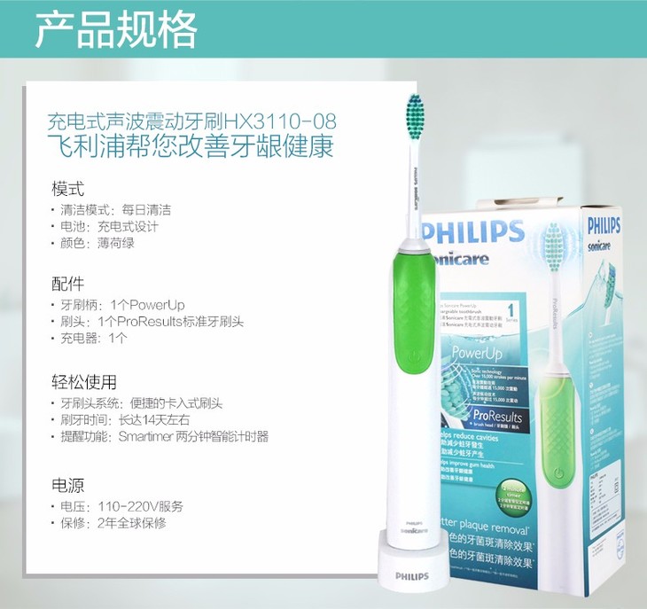 【一般贸易】PHILIPS/飞利浦 电动牙刷成人 充电式 HX3110
