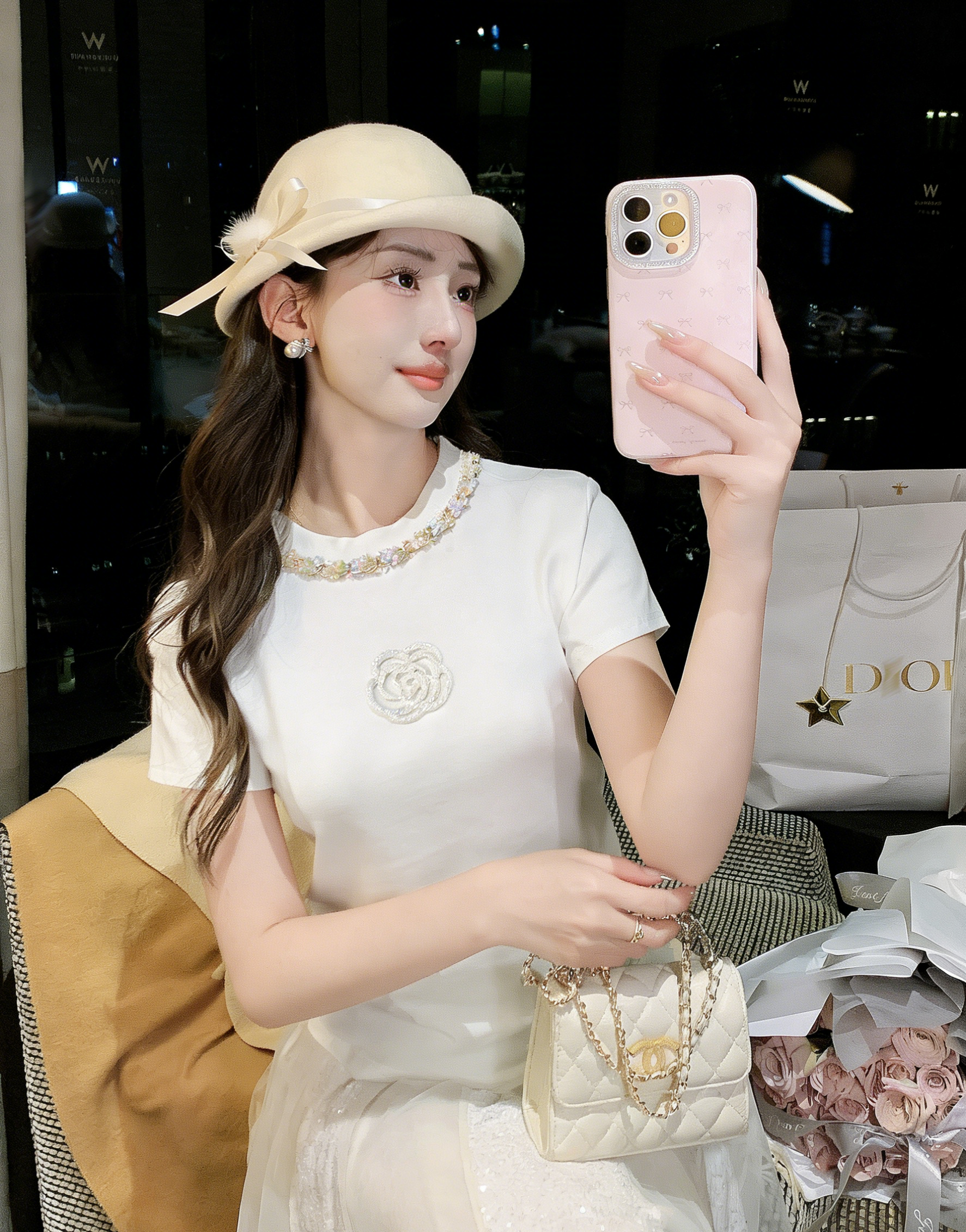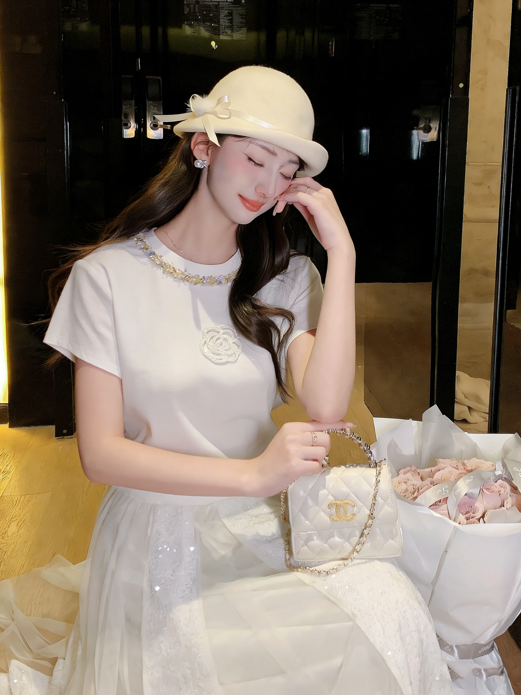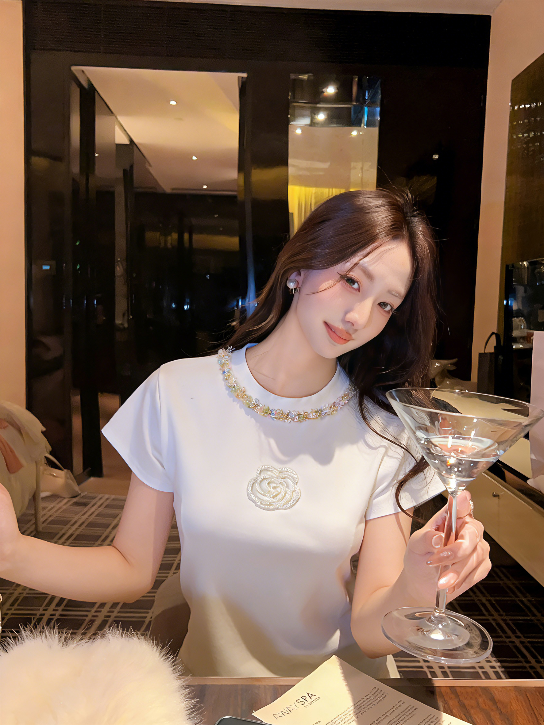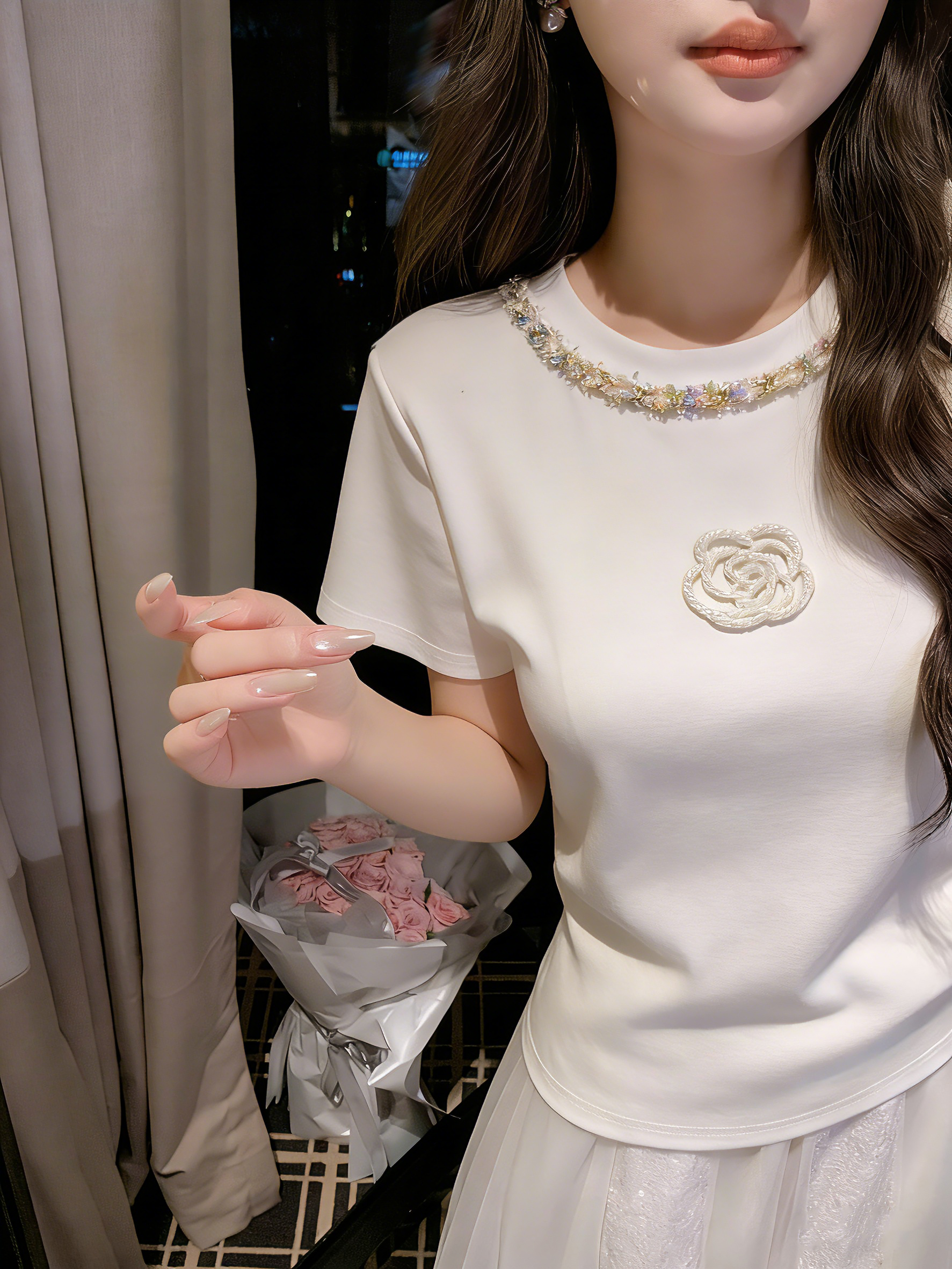 张心子【山茶栀意】圆领气质小香山茶花编织织带T恤上衣 U2603050