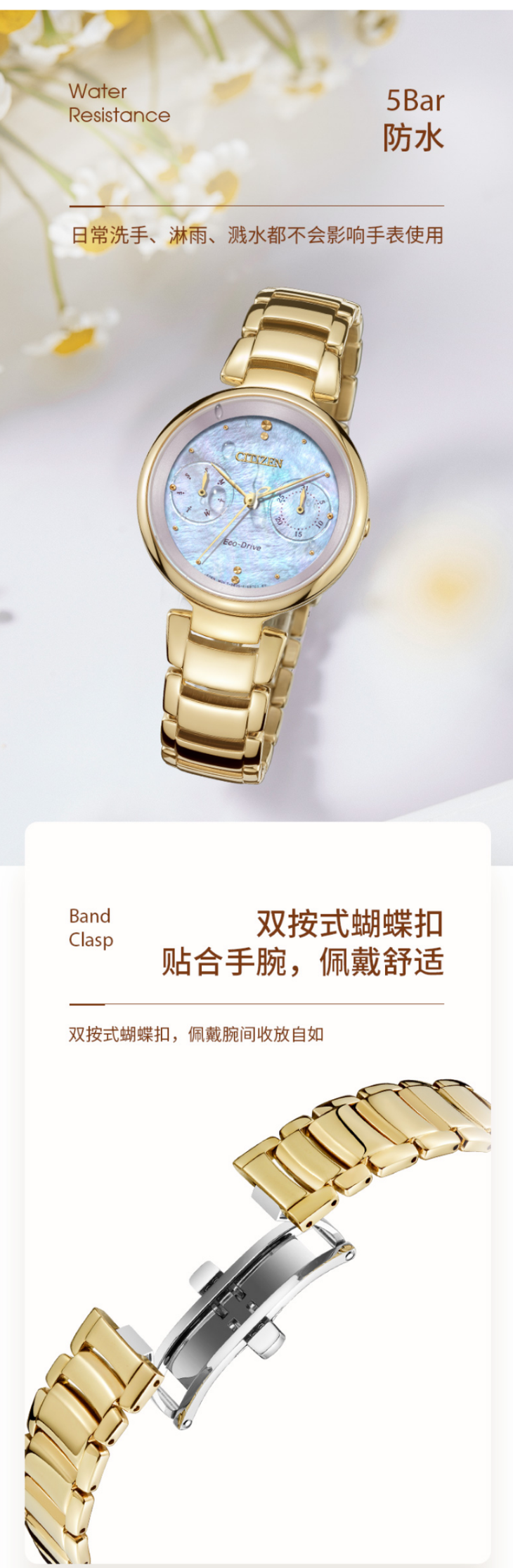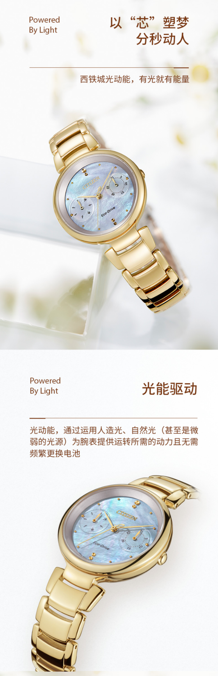 西铁城日本官方正品潮流时尚不锈钢镀玫瑰金色光动能女表FD1103-89Y