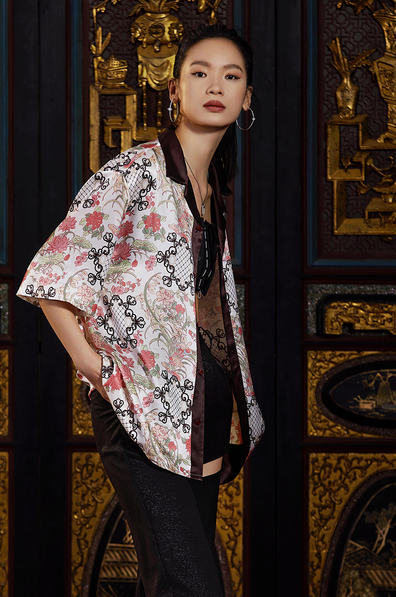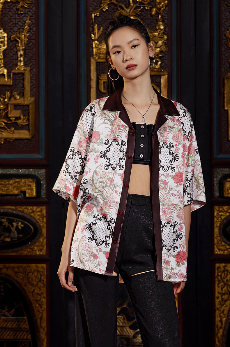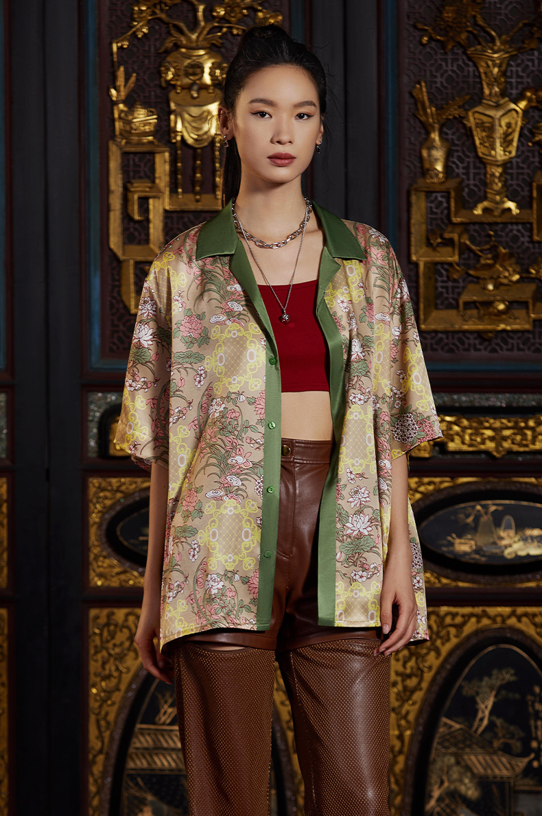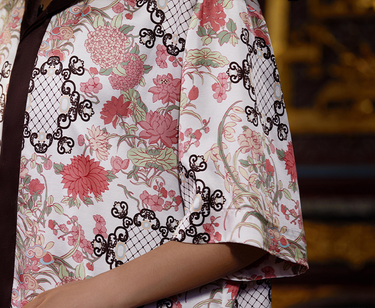 东方花园系列印花衬衫图案创作灵感来源于故宫藏品明代「周之冕百花图卷」中的花卉图案。中心部位图案来源于清代宫廷的木雕窗格图案,好似透过窗户观赏花园里的各色花卉争奇斗艳,独具东方特色。顾名思义“东方花园”。