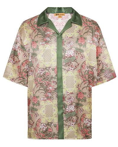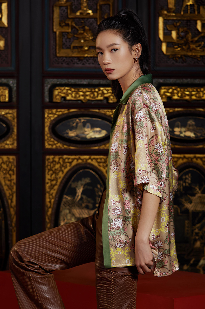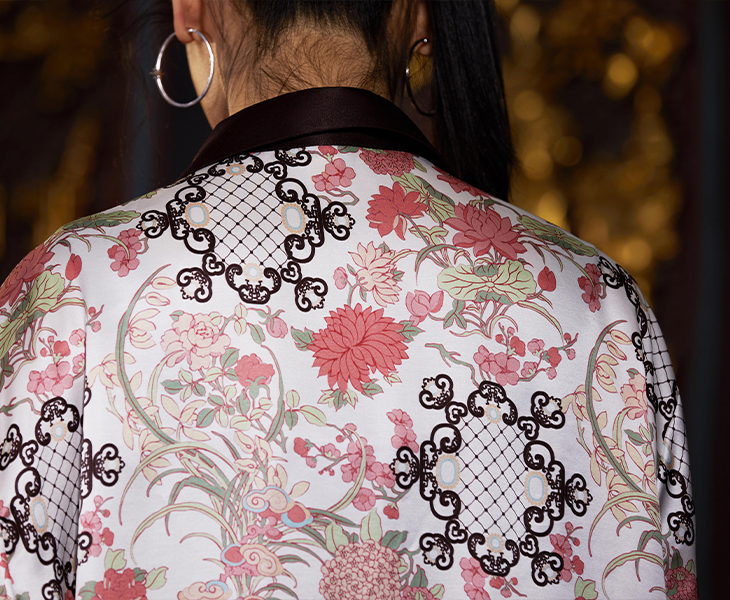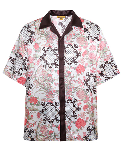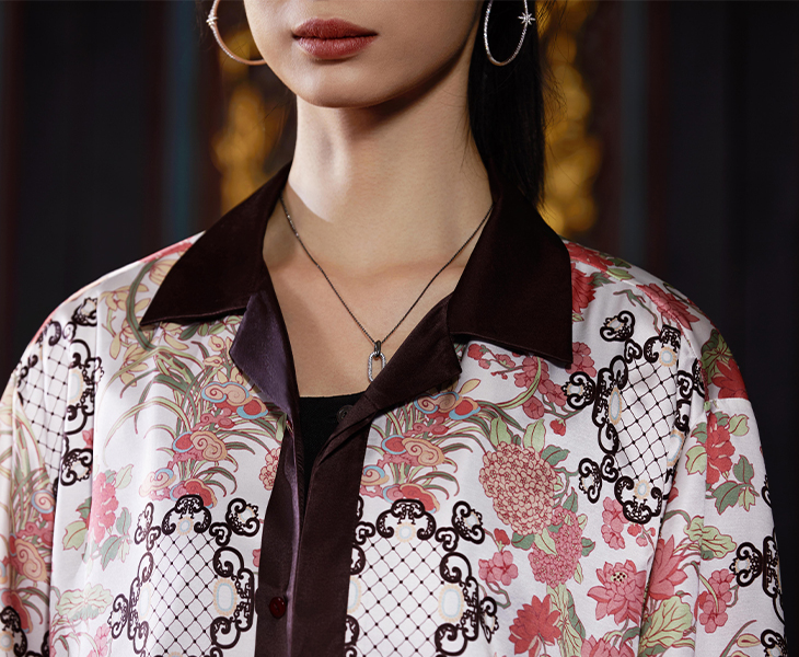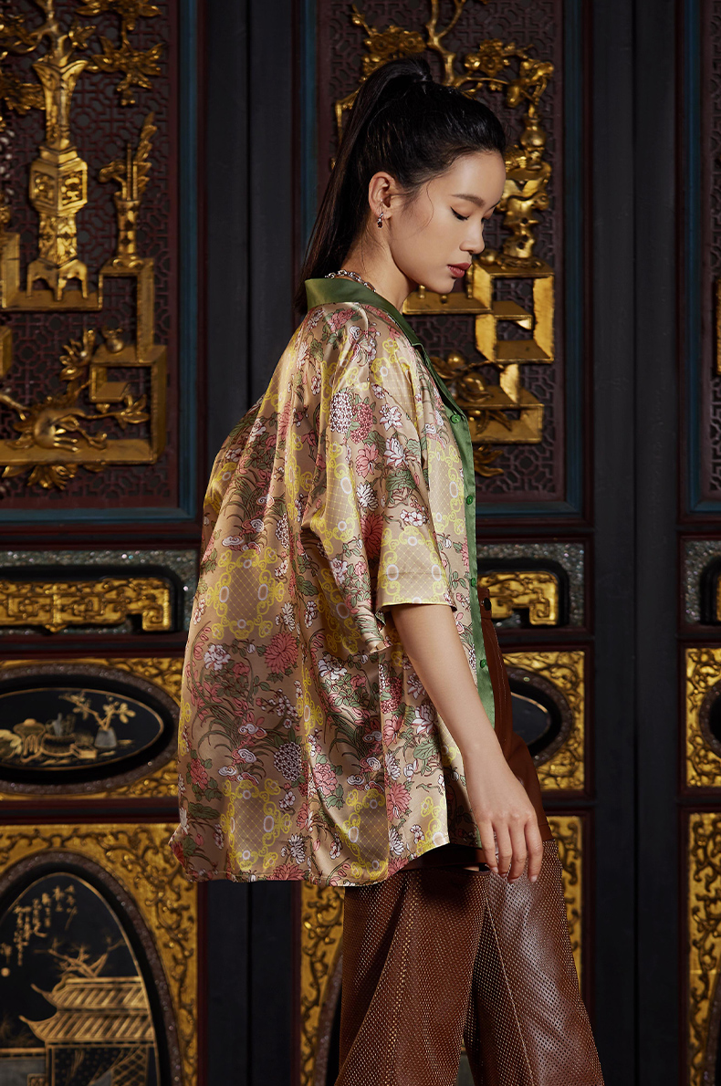 东方花园系列印花衬衫图案创作灵感来源于故宫藏品明代「周之冕百花图卷」中的花卉图案。中心部位图案来源于清代宫廷的木雕窗格图案,好似透过窗户观赏花园里的各色花卉争奇斗艳,独具东方特色。顾名思义“东方花园”。