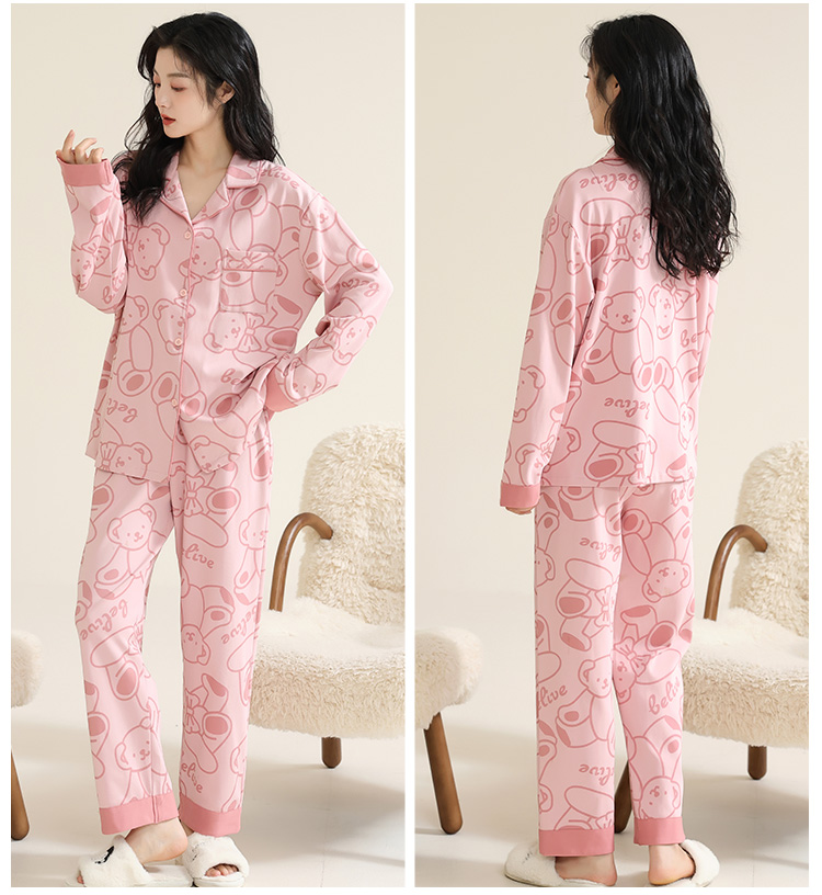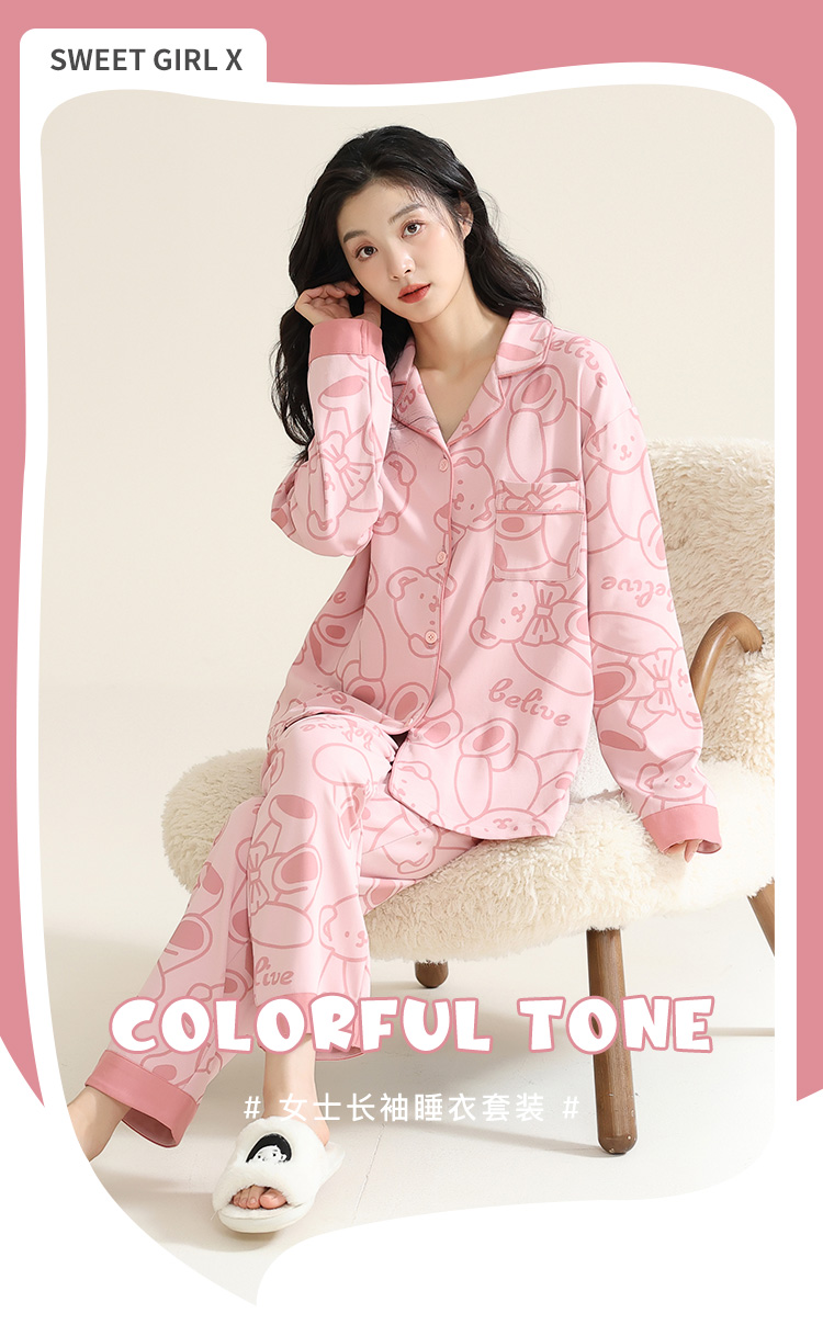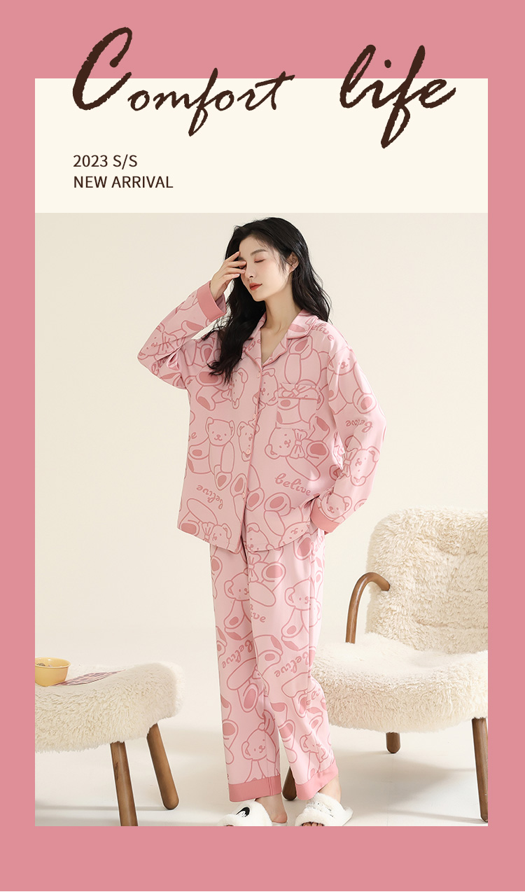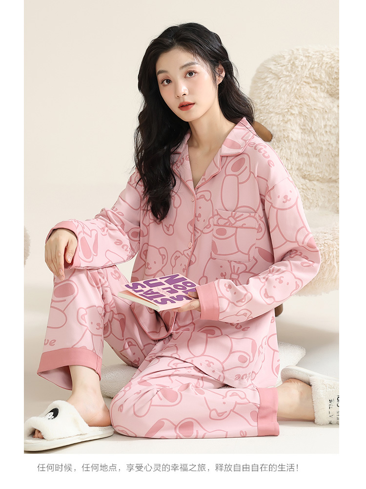 洁丽雅棉质女士大码翻领家居服个性印花舒适亲肤长袖长裤套装