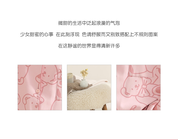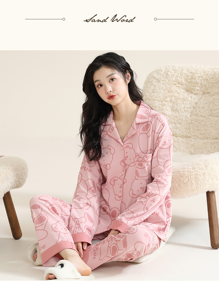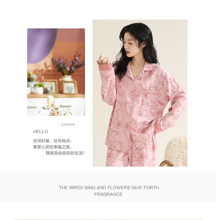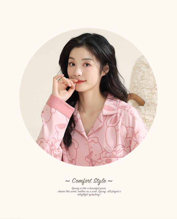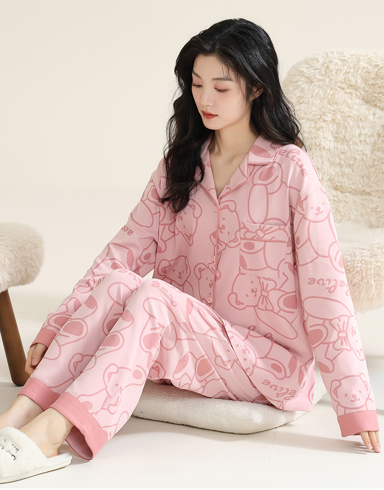 洁丽雅棉质女士大码翻领家居服个性印花舒适亲肤长袖长裤套装