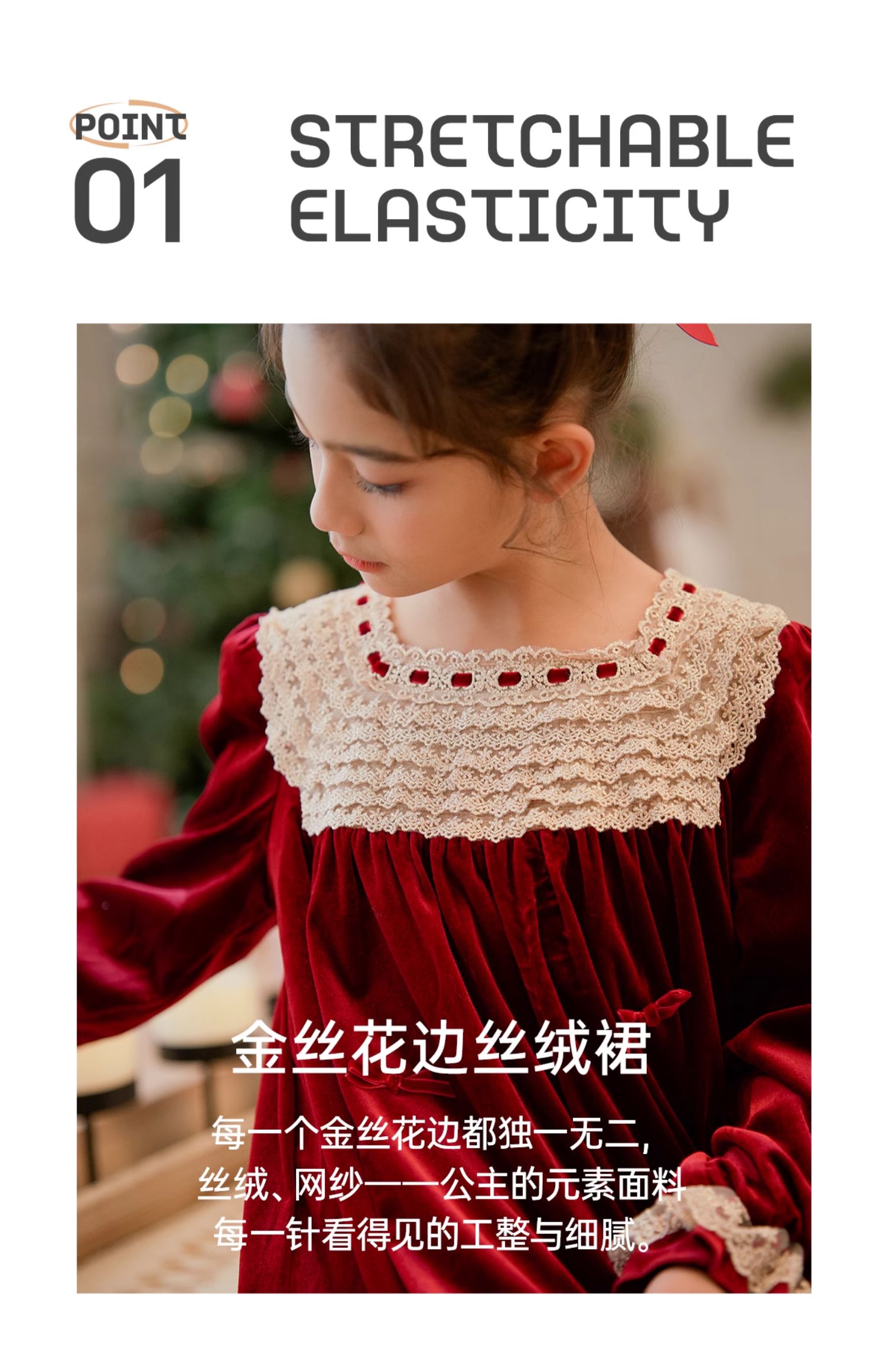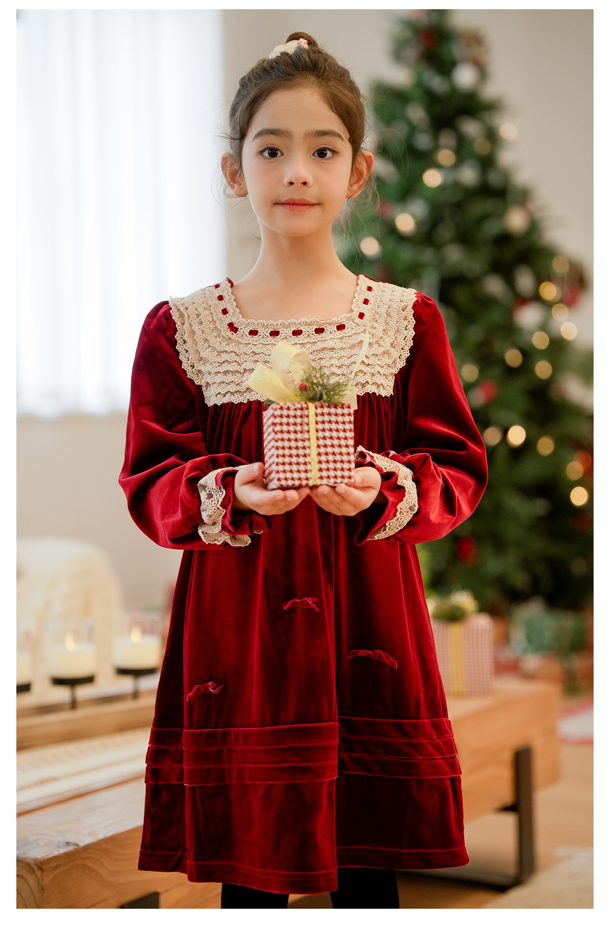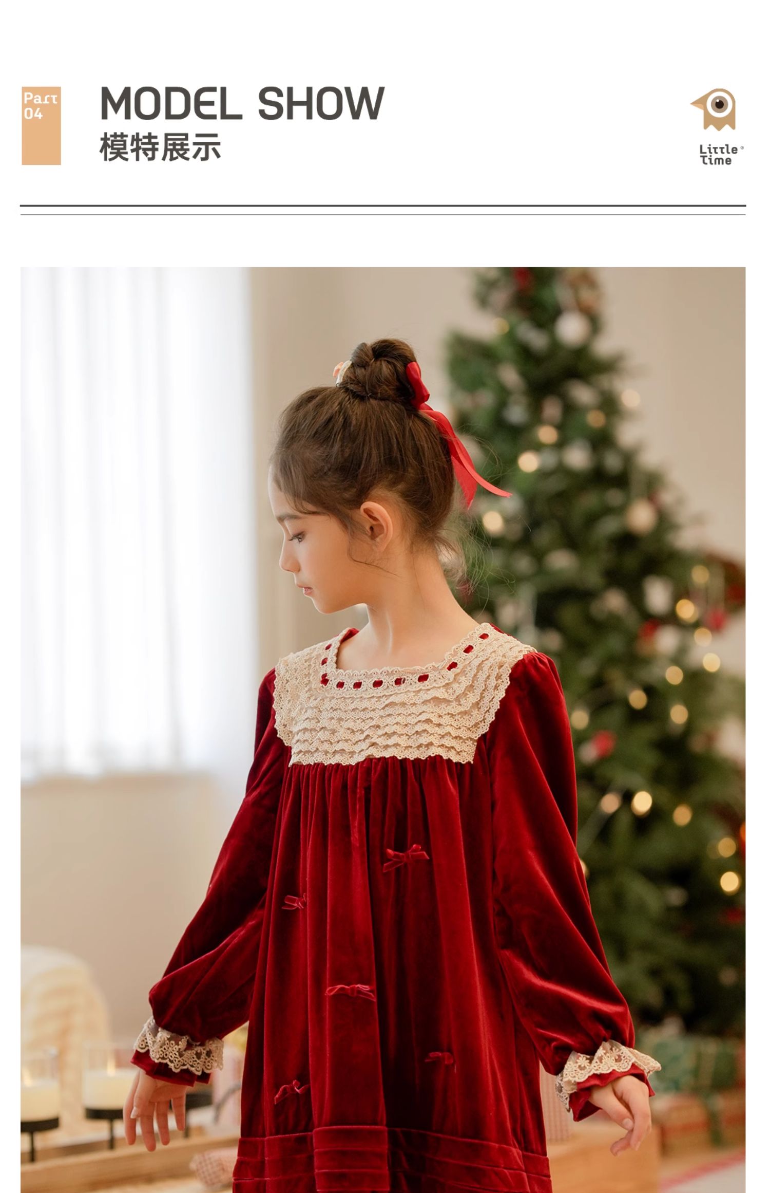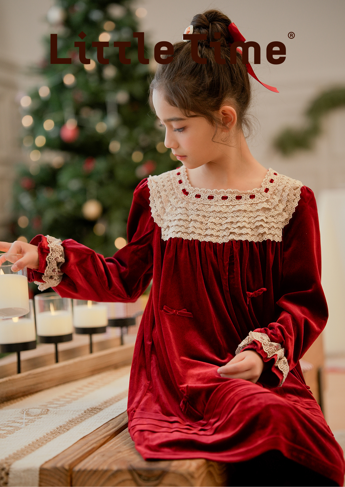 littletime女童酒红丝绒裙2024秋冬新款复古秋冬长袖公主连衣裙