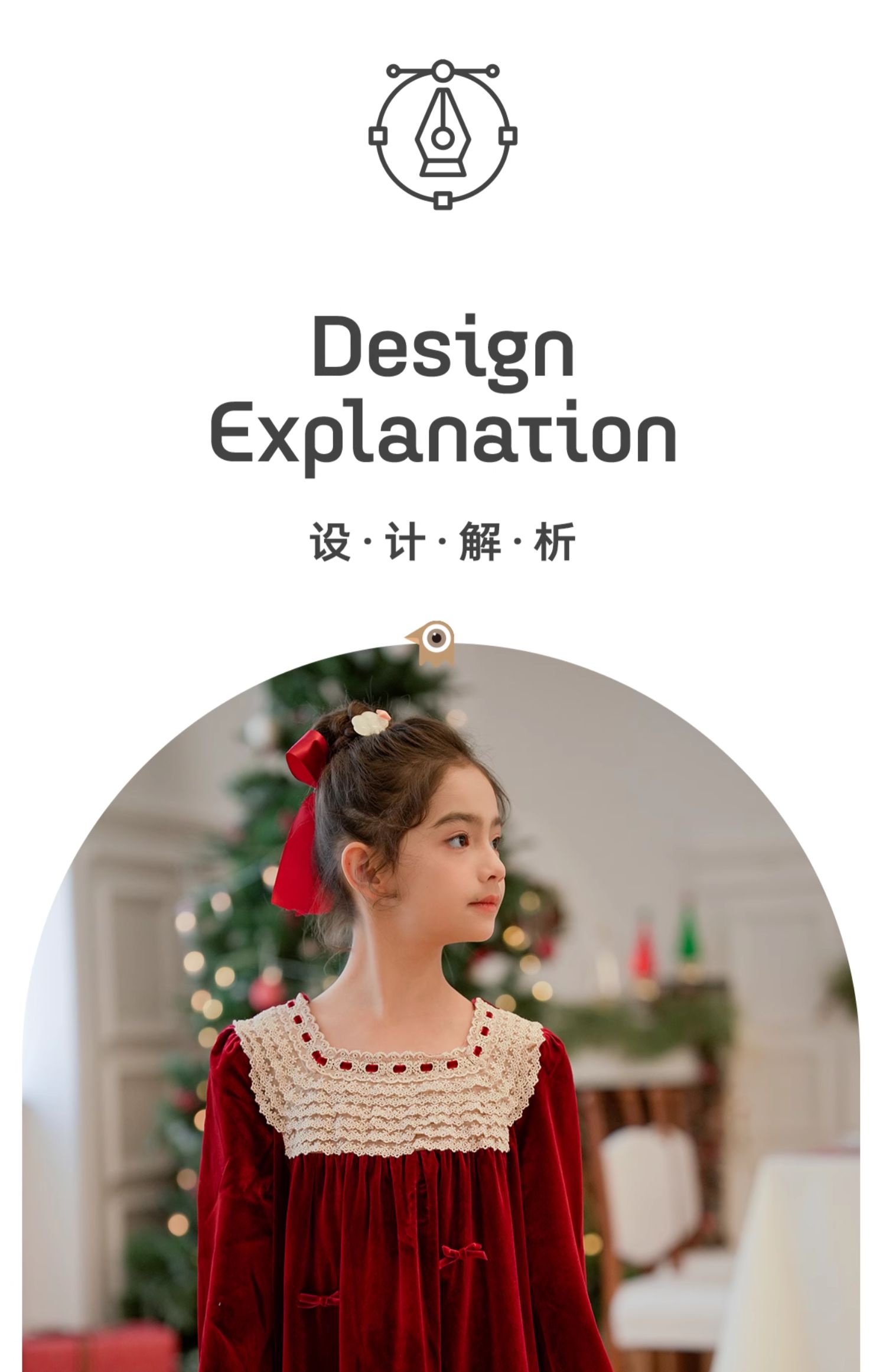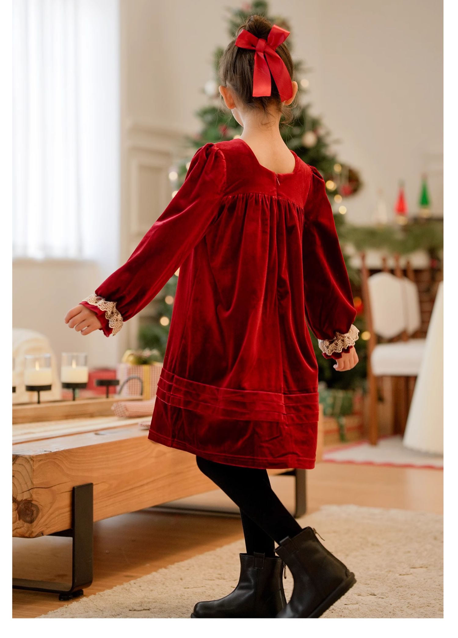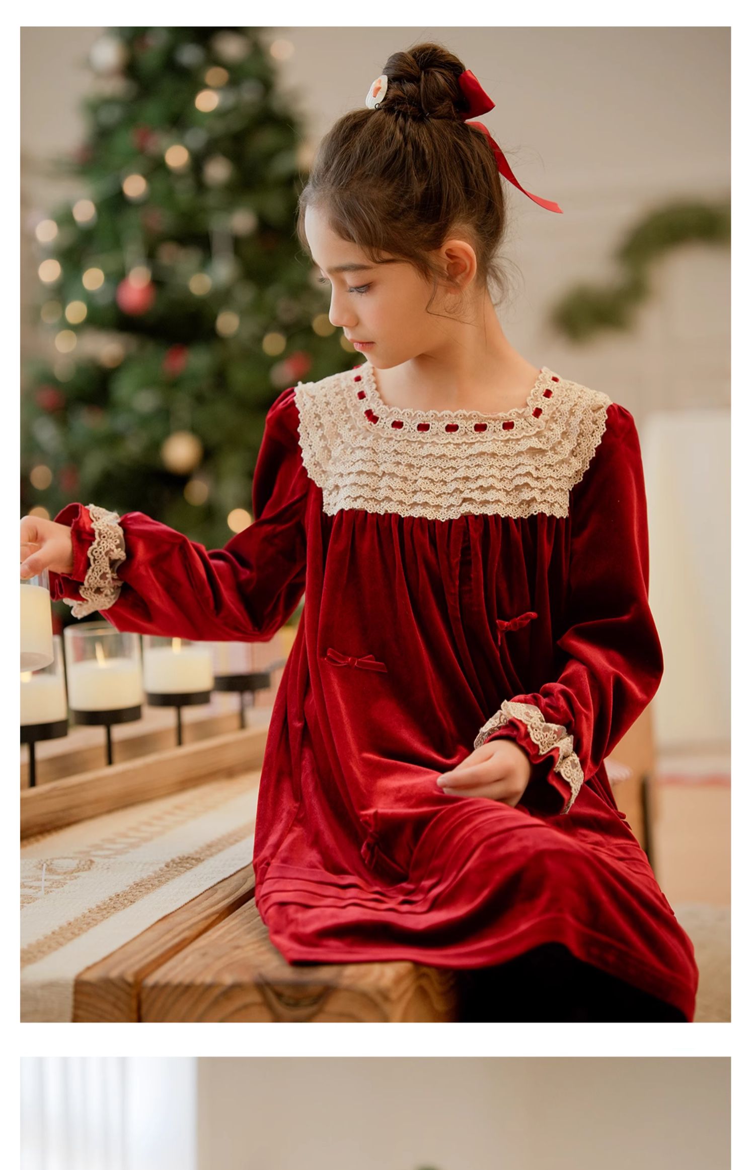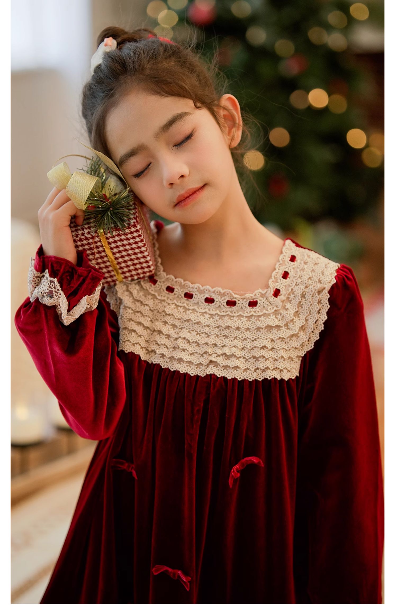 littletime女童酒红丝绒裙2024秋冬新款复古秋冬长袖公主连衣裙