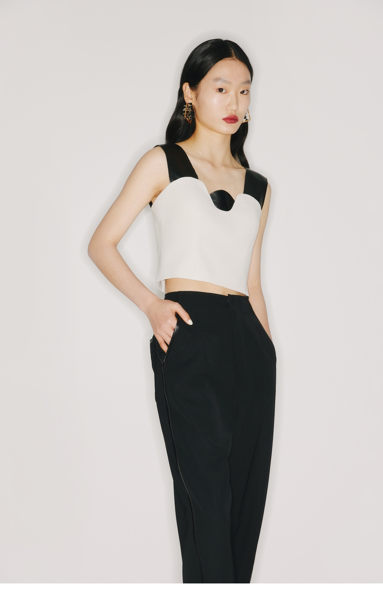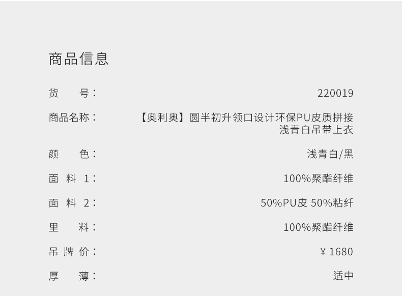 【奥利奥】圆半初升领口设计环保PU皮质拼接浅青白吊带上衣/220019