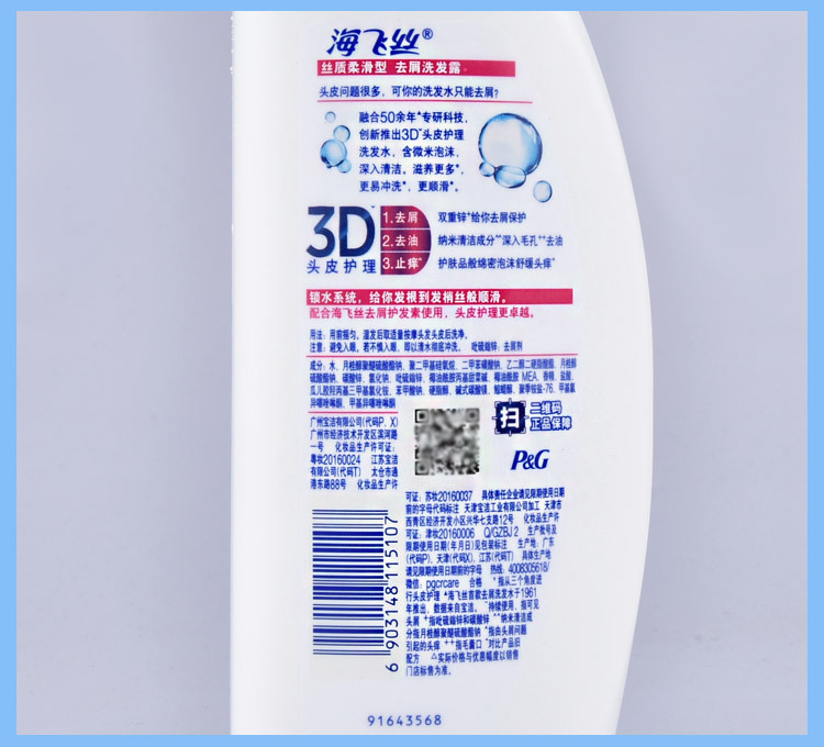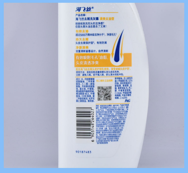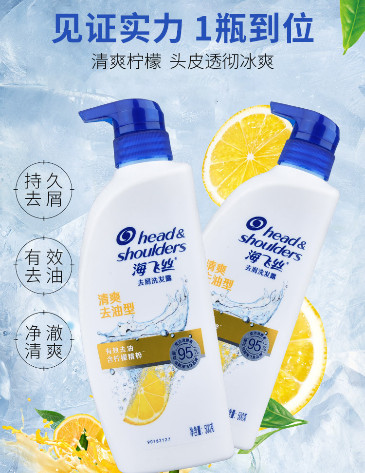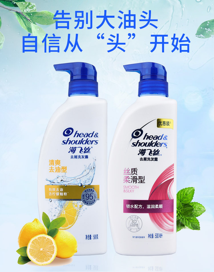海飞丝洗发水清爽去油去屑洗发露丝质柔滑洗头膏清洁头发护理500g