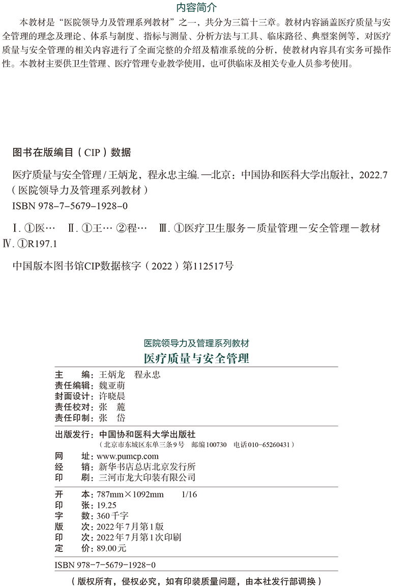 医疗质量与安全管理 协和医学院系列规划教材 供卫生管理医疗管理专业使用 王炳龙程永忠 中国协和医科大学出版9787567919280