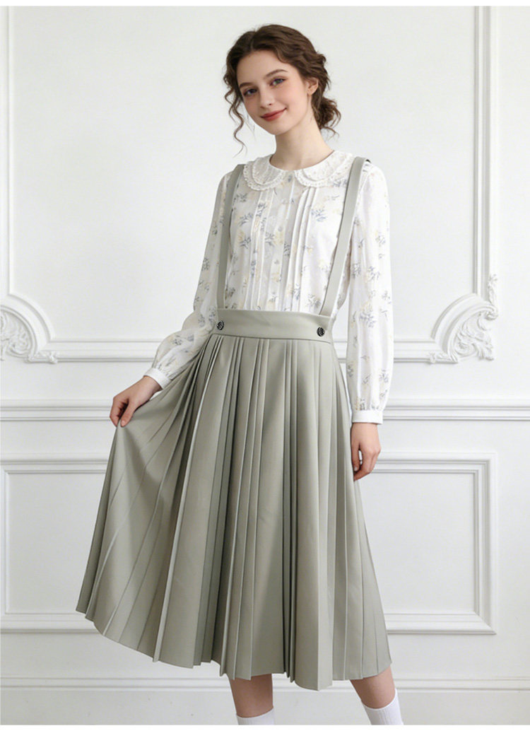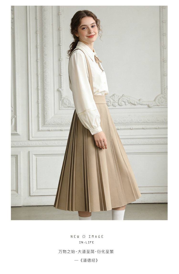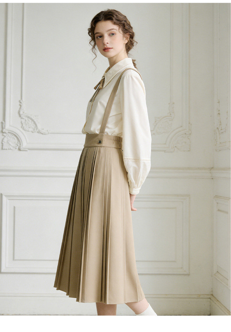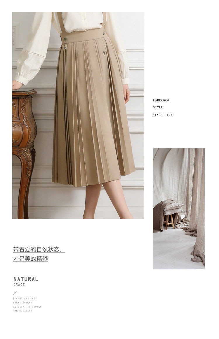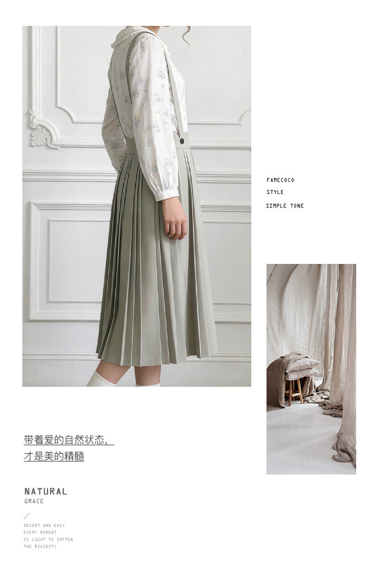 Famecoco减龄文艺宽松A字背带裙纯色松紧腰百褶半身裙FAB1FE003