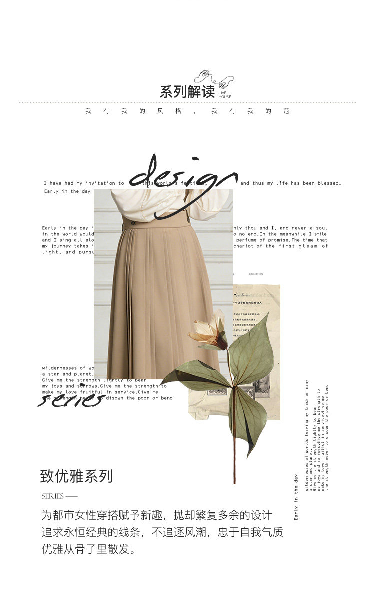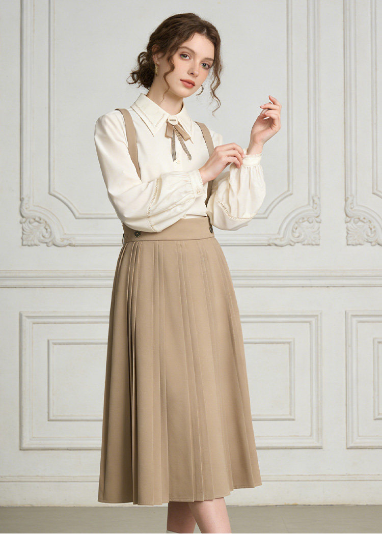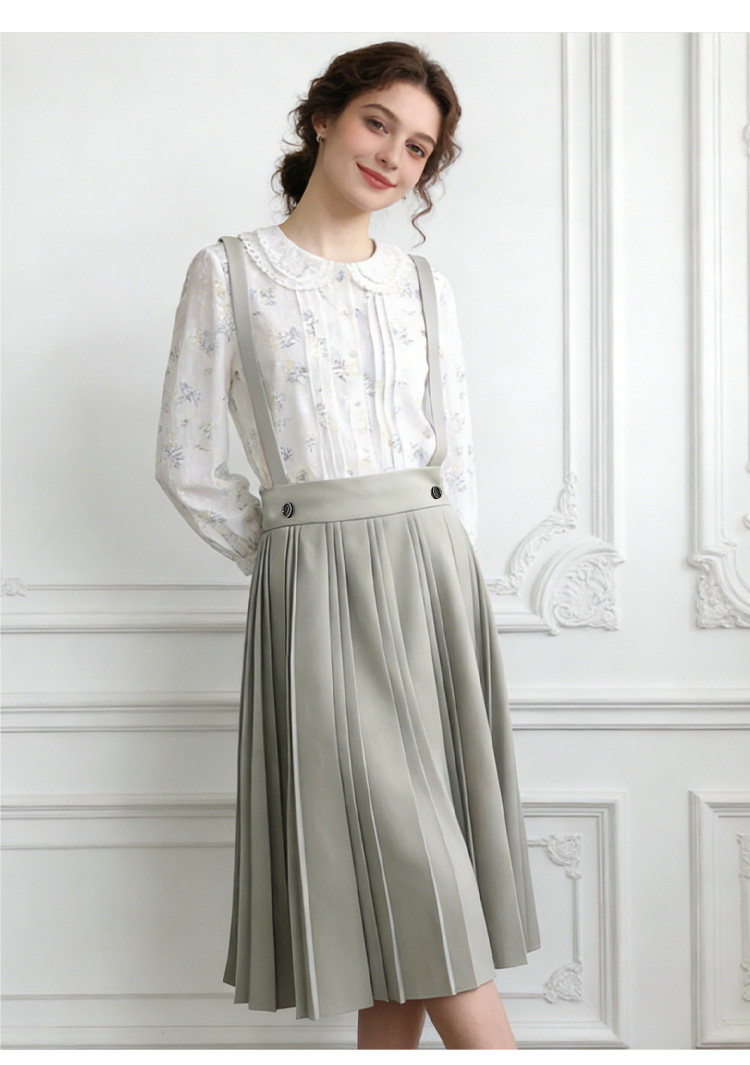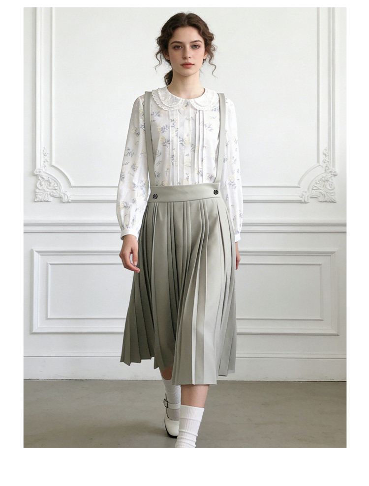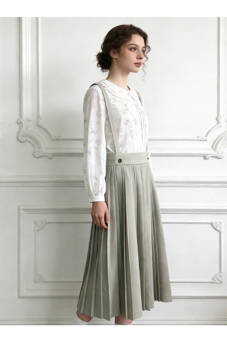 Famecoco减龄文艺宽松A字背带裙纯色松紧腰百褶半身裙FAB1FE003