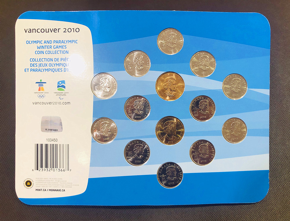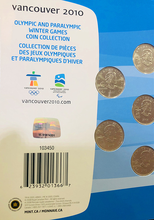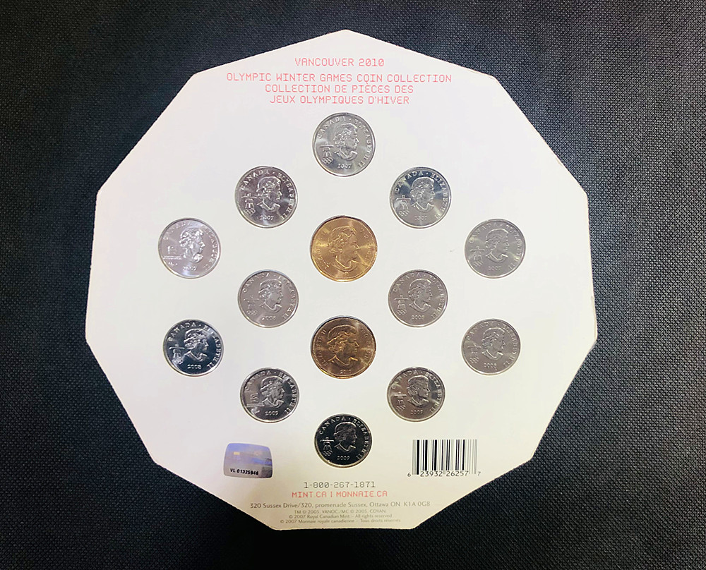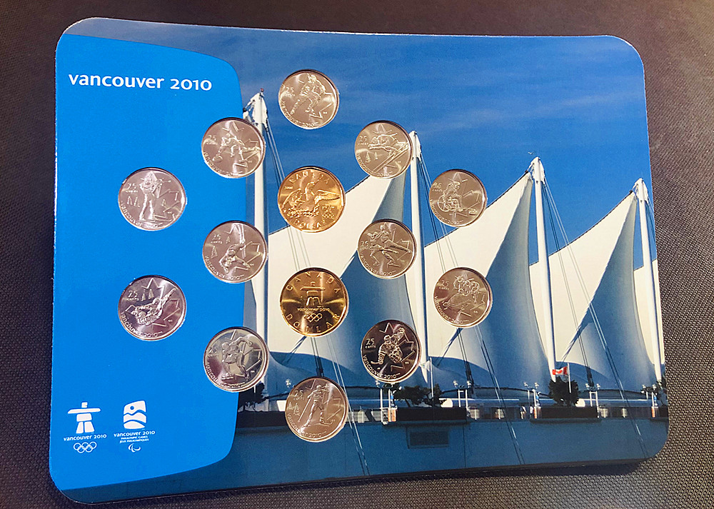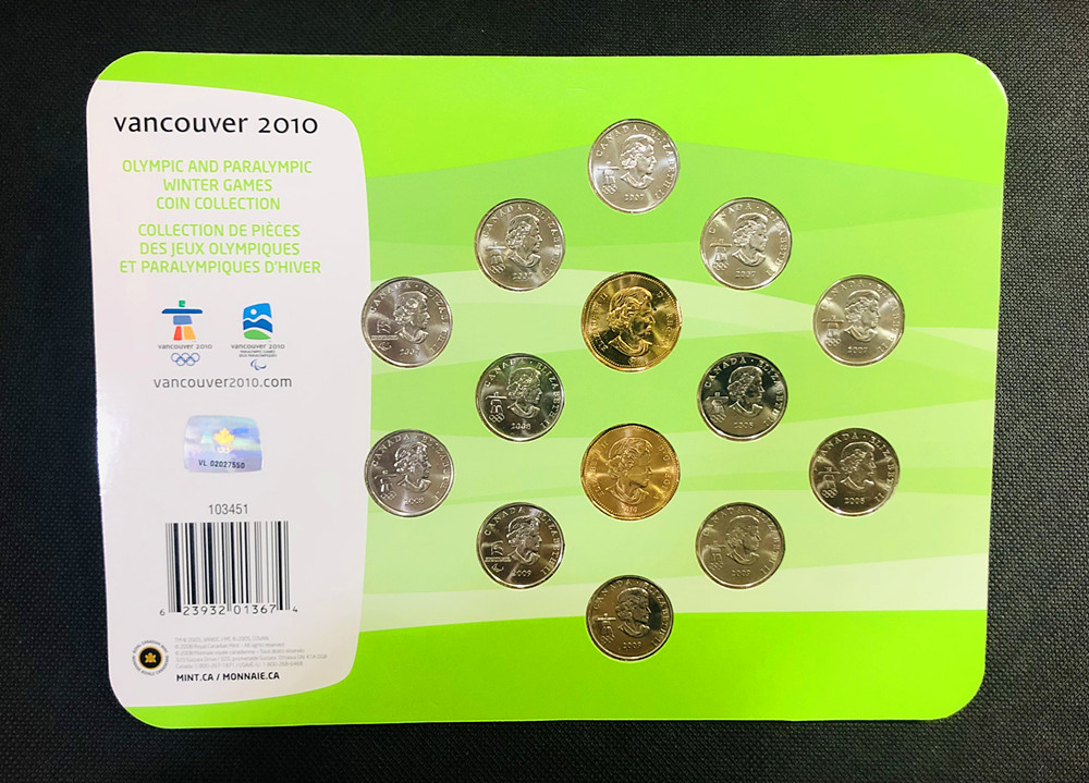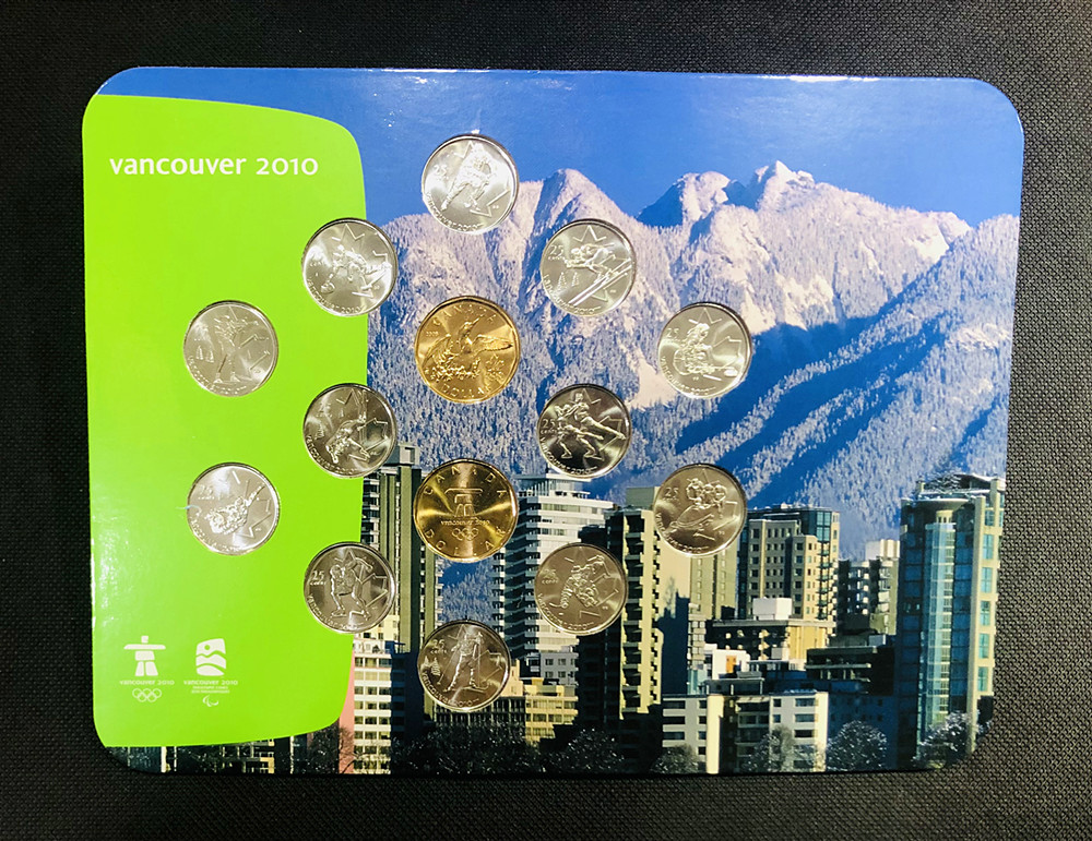 加拿大作为2010年温哥华冬奥会主办国特别发行25分1元面额流通纪念币。该套纪念币包含全部2010冬奥会12枚25分纪念币和2枚幸运朗尼(1加元面额)流通币。