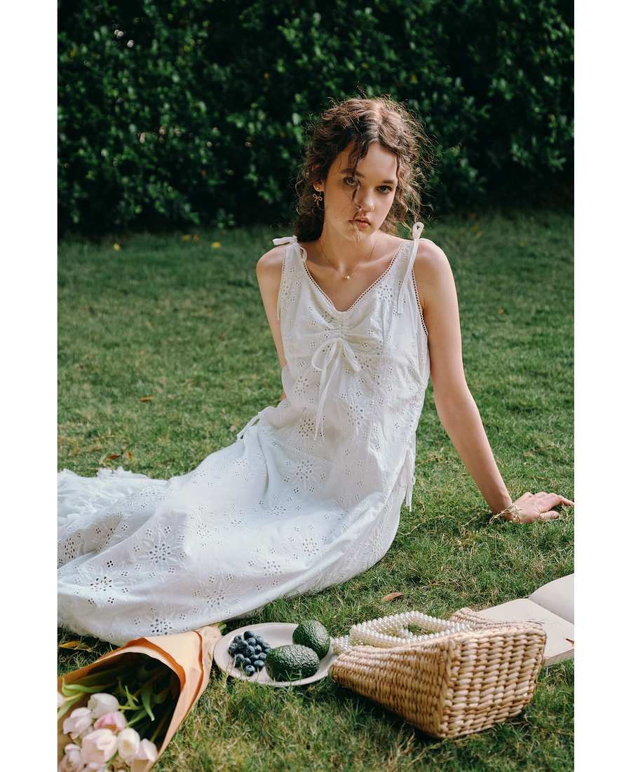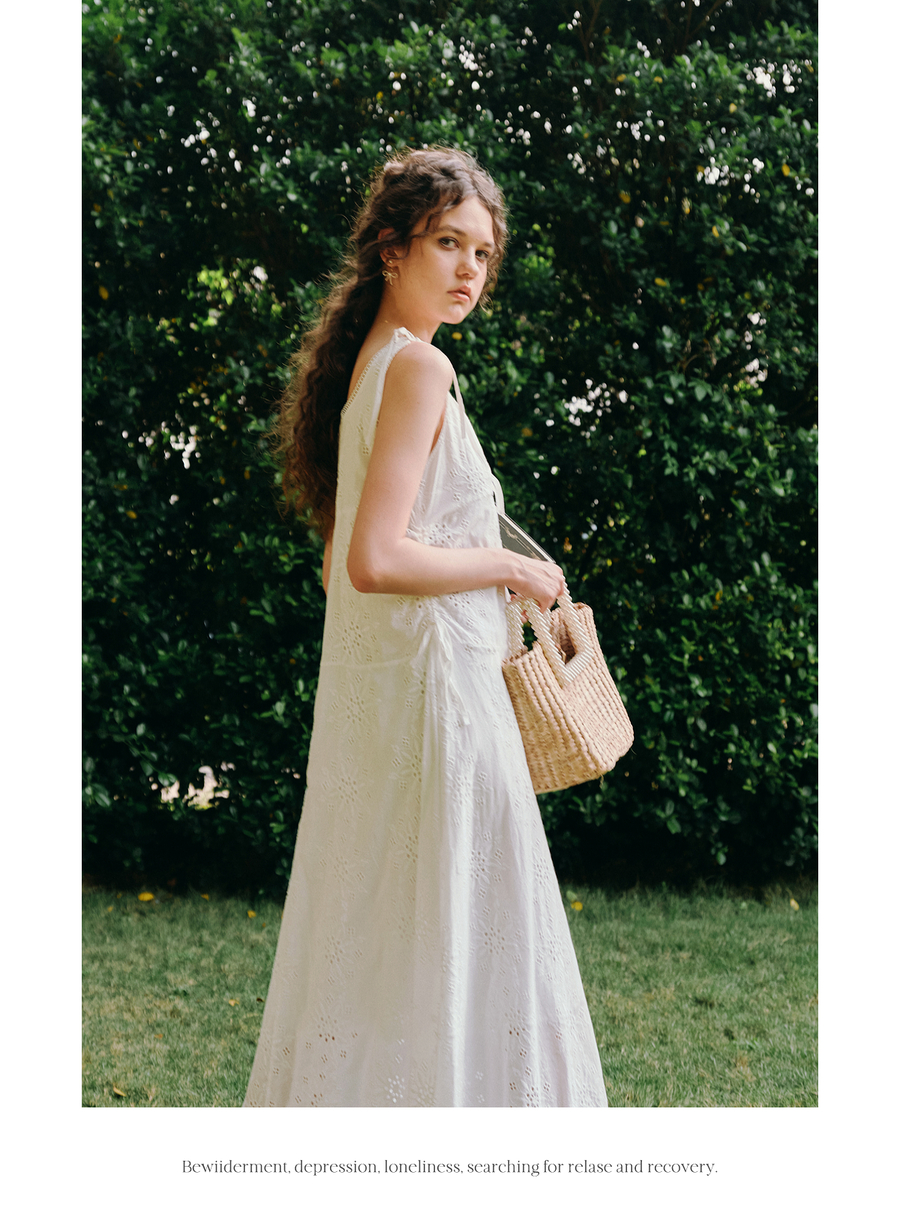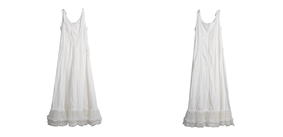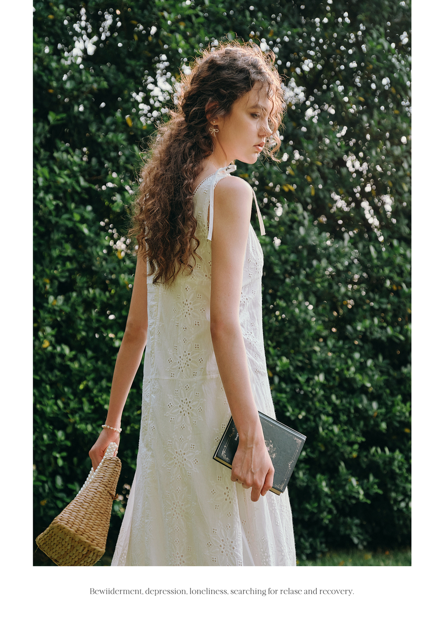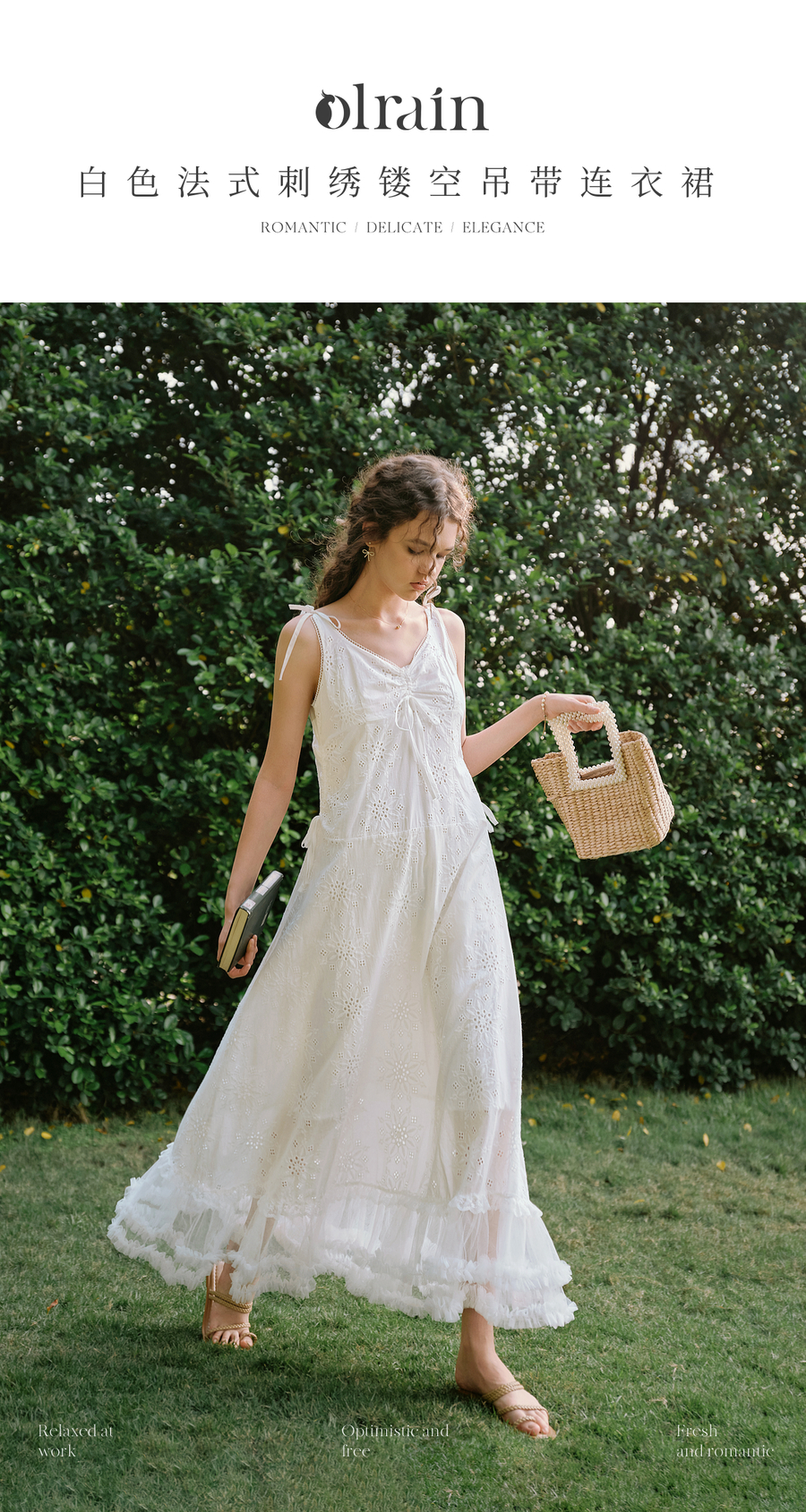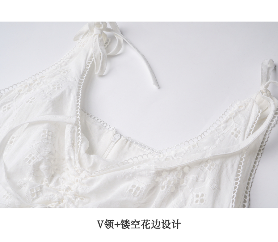 OLrain欧芮儿白色法式刺绣镂空吊带连衣裙女夏季2025新款无袖长裙