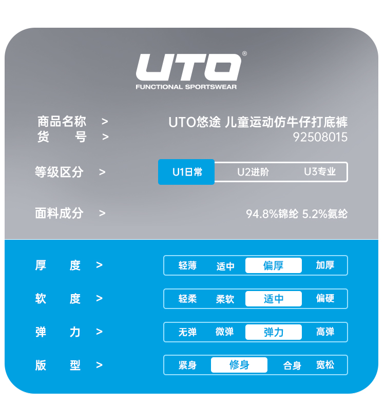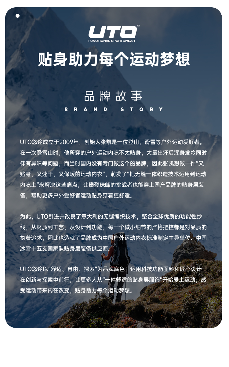 UTO悠途潜心于贴身运动装备的研发、设计和生产。从纤维到组织,从设计到工艺,在无缝贴身运动装备领域,树立国内标杆。 UTO着力于品牌互联网化,不断采集大量运动数据,为跑步、健身、滑雪等不同类型的运动爱