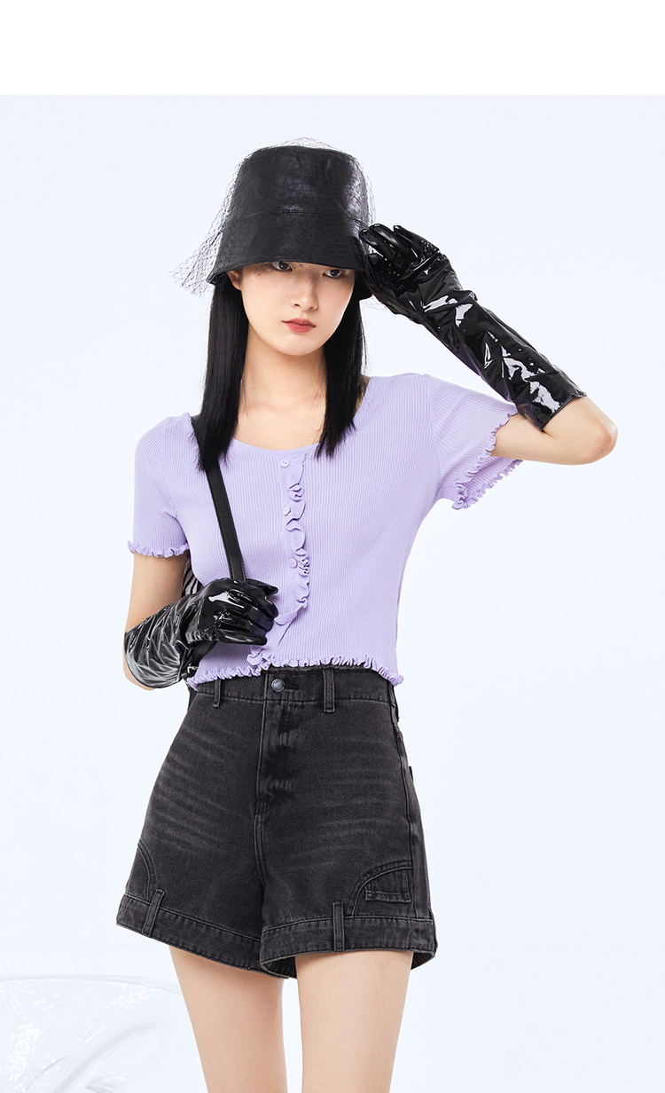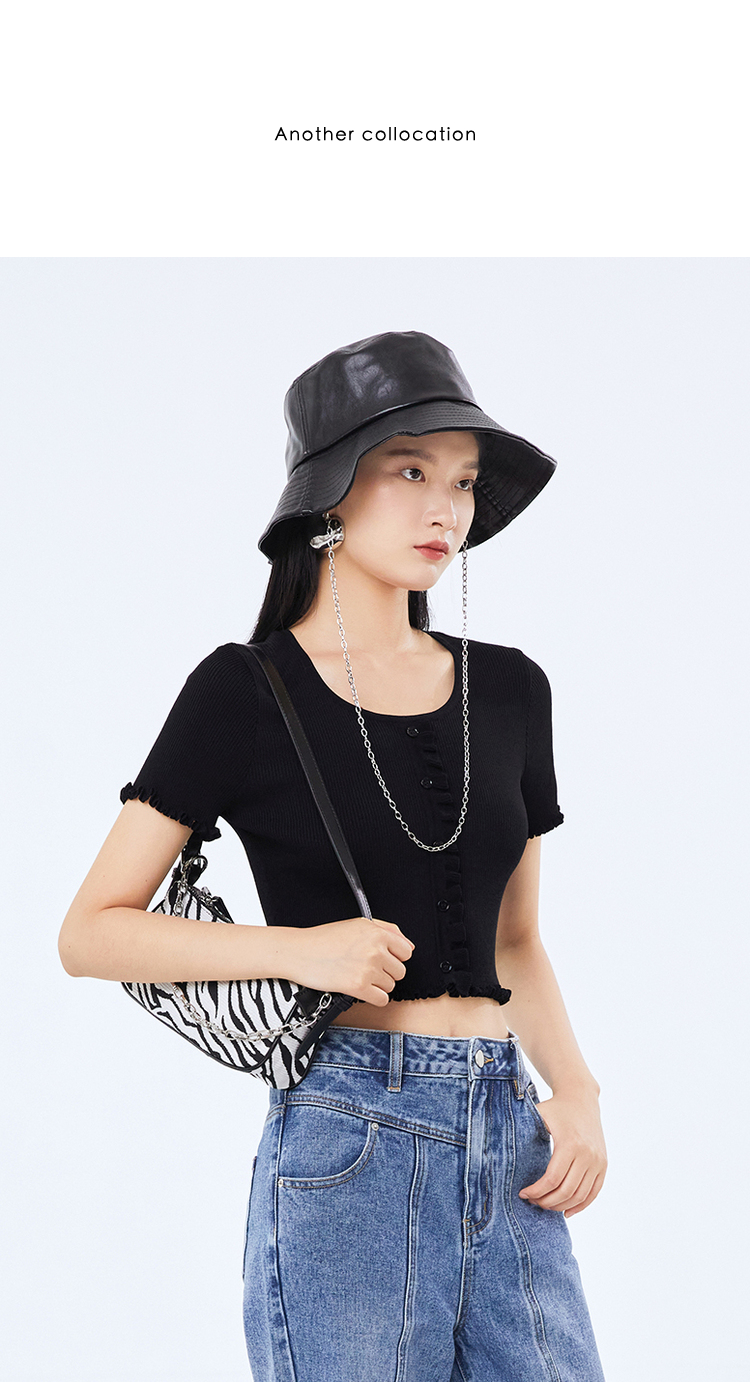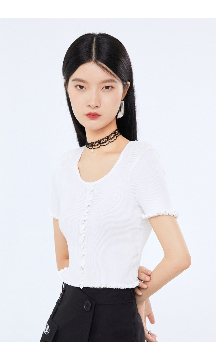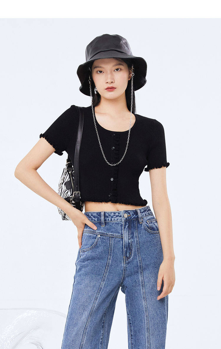 NEELLY纳俪商场同款2022秋季新款圆领针织衫女甜美木耳边短款上衣N22074A04402