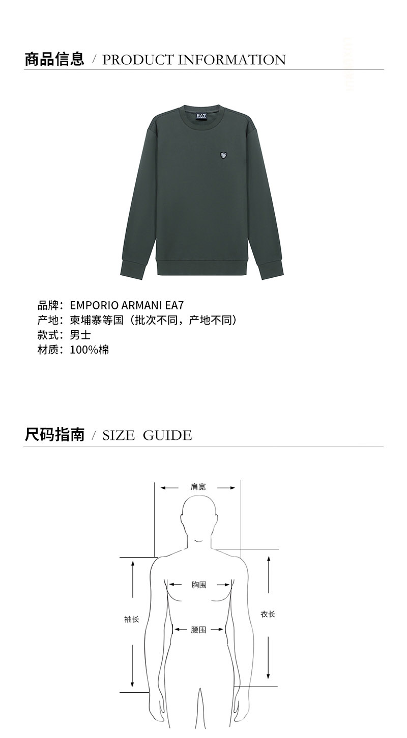 品牌:EA7/EA7 产地:柬埔寨等国(批次不同,产地不同) 款式:男士 颜色:无烟煤色 材质:100%棉 备注:批次不同,货品略有差异,以实物为准