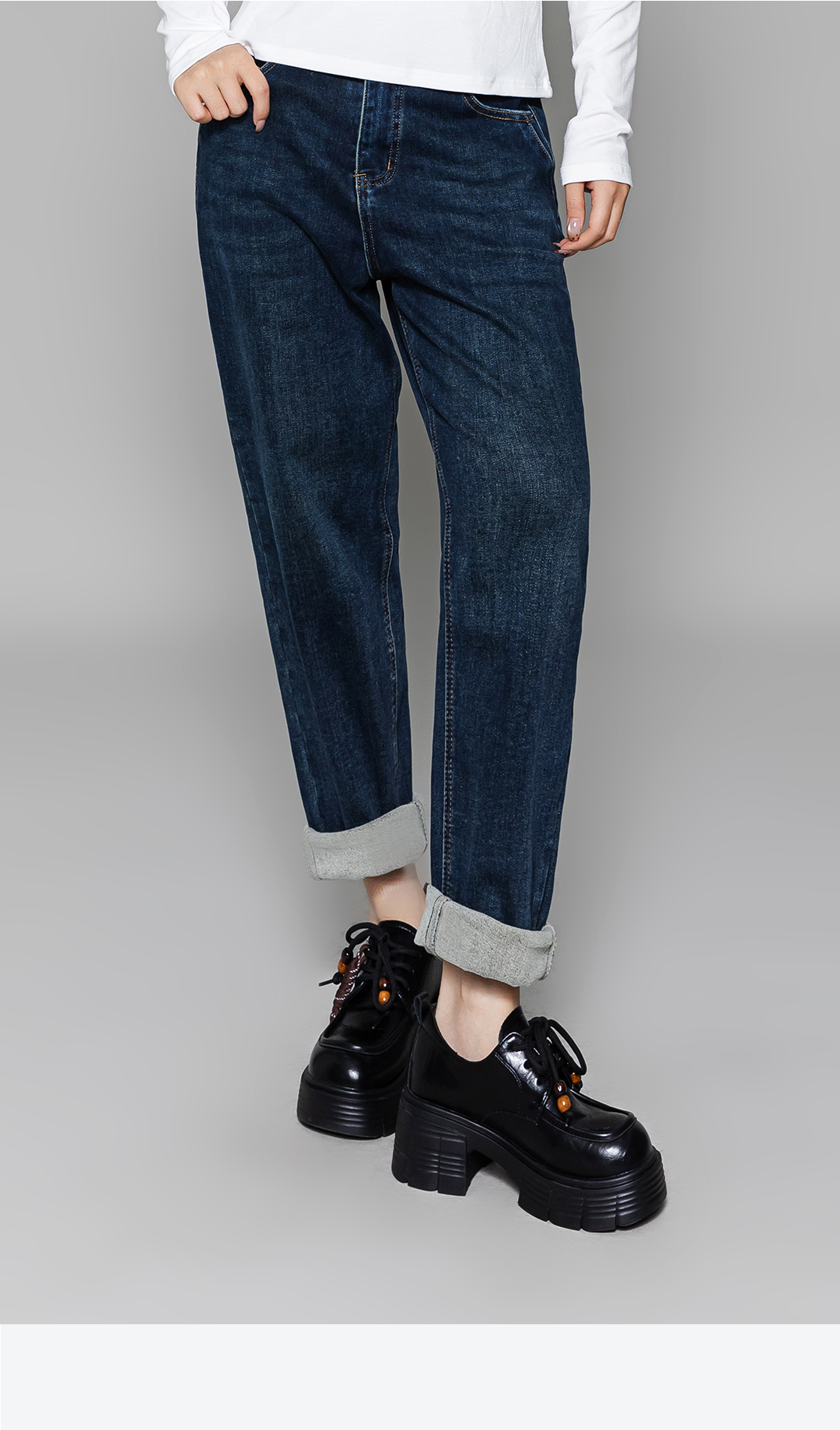 冬上新保暖复古穿搭必备高腰显瘦显腿直深蓝加绒卷边牛仔裤3254024