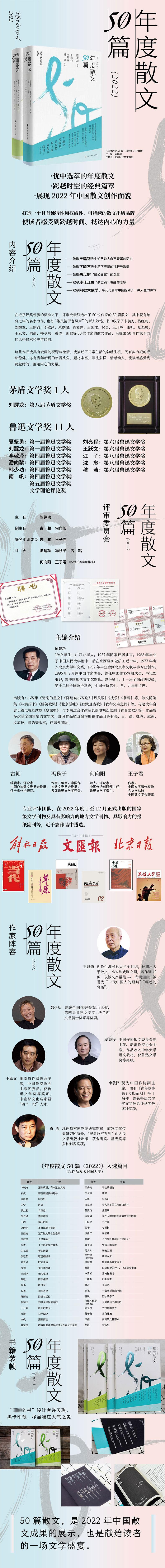 《年度散文50篇(2022)②》所有篇目由专家评审会“推举”“评选”而出,评审会由中国作协副主席陈建功、古耜、何向阳等文学界知名作家、评论家、编辑家组成。从2022年30余家权威报刊中,评选出50篇有影响力的散文结集。入选作品题材多样,兼及散文各体裁的样式,注重情感真切,个性表达,艺术新颖,尤为注重作品的经典价值——情真而不装,性灵而不饰,境新而不炫,文美而不噪。这50篇散文的选取,展示了2022年散文的成果,也体现了对散文走向突破的思考与期待,相信相当多的入选篇目经得起岁月的淘洗。散文集读来让人沉浸,如同享用一场文学的盛宴。