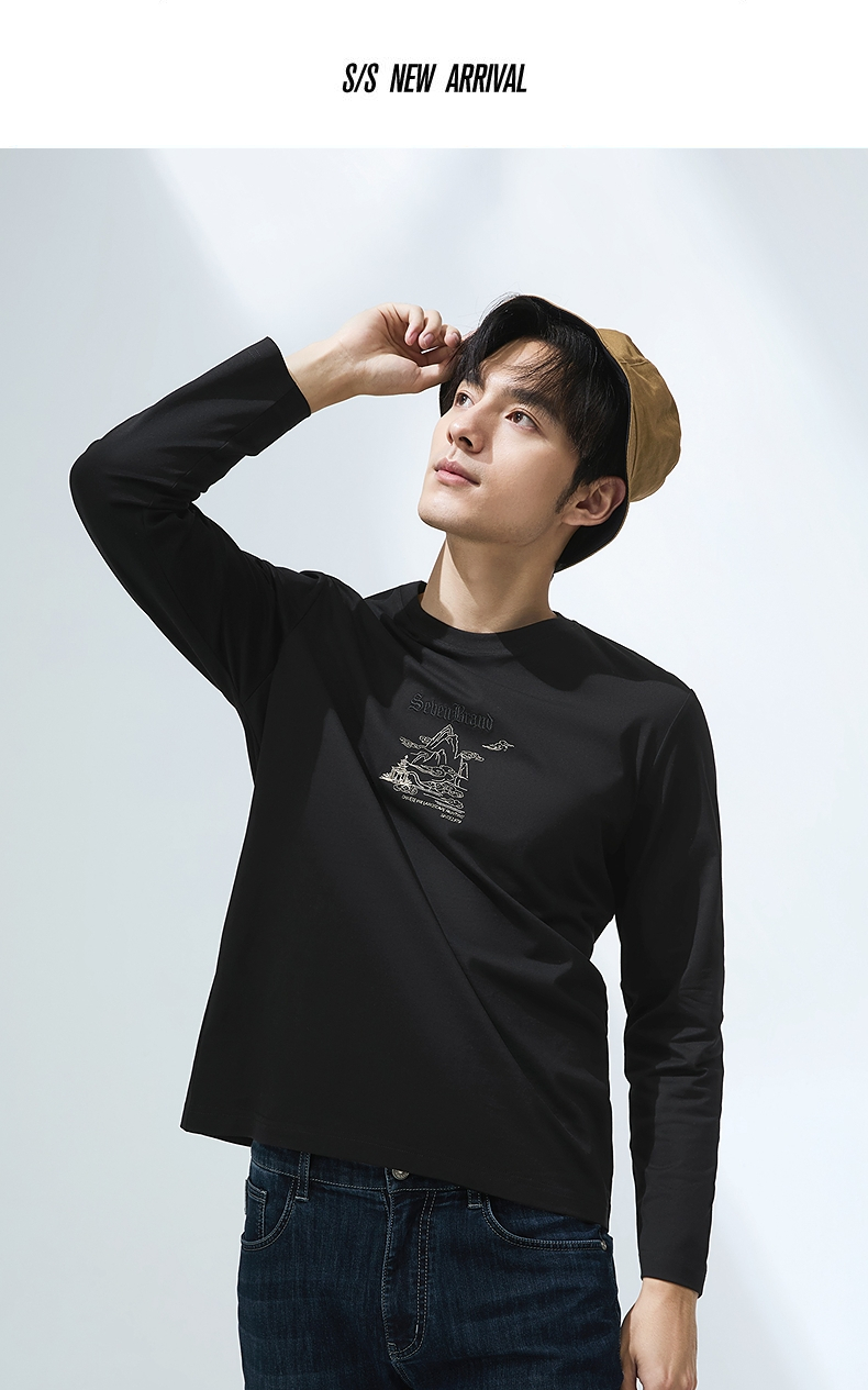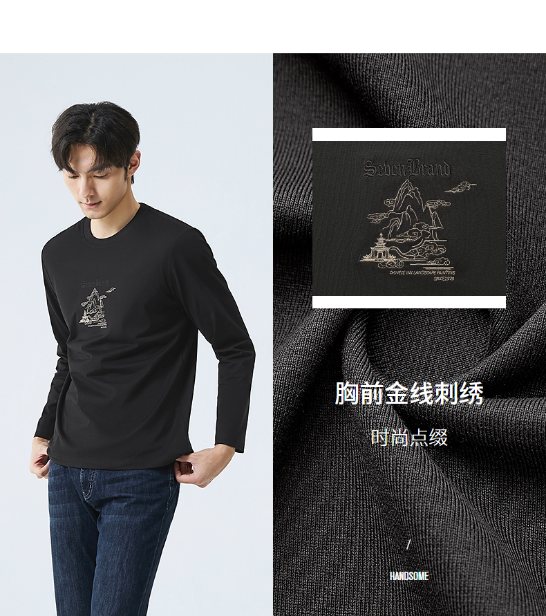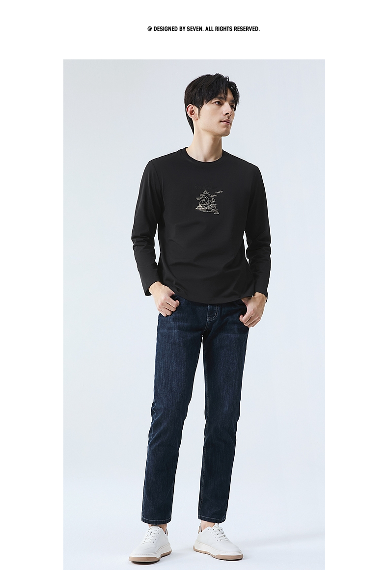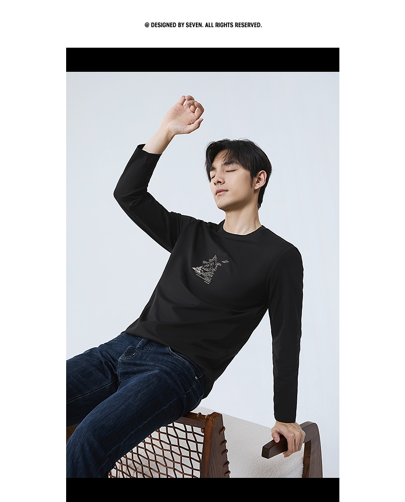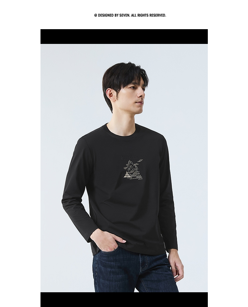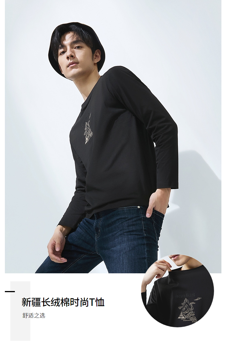 【新疆长绒棉】柒牌长袖男T恤2025春季新款休闲百搭黑色圆领上衣128T71850