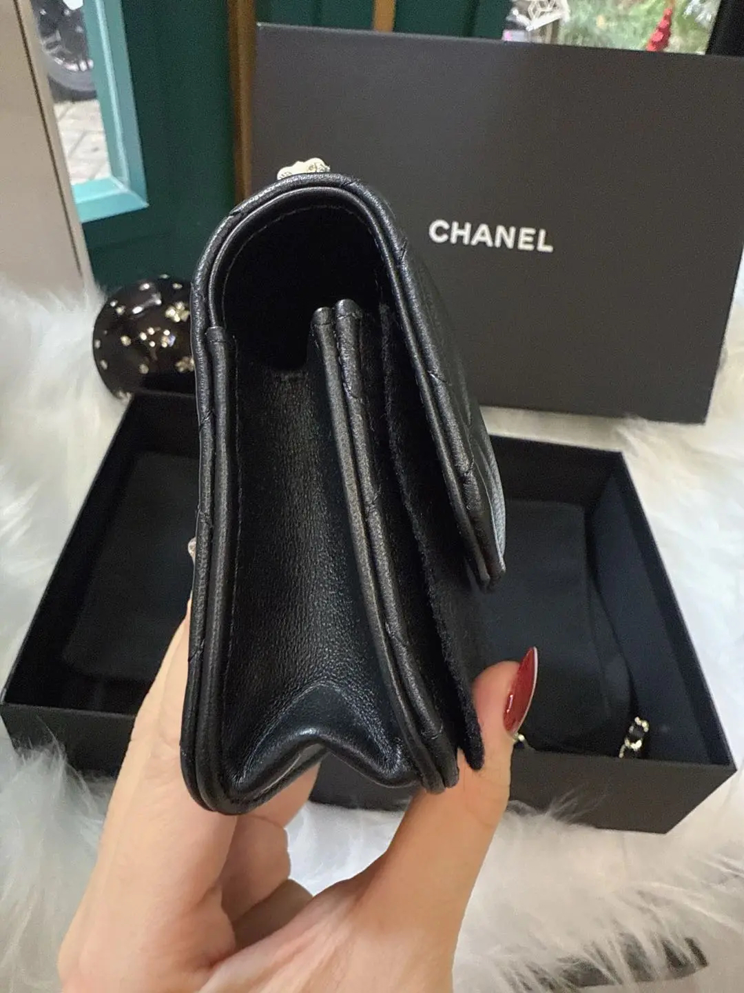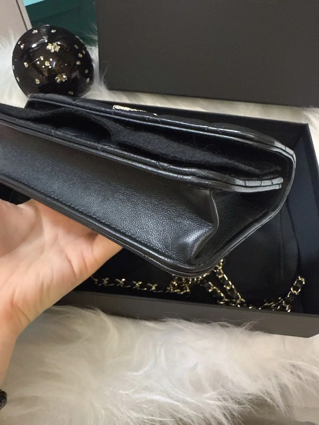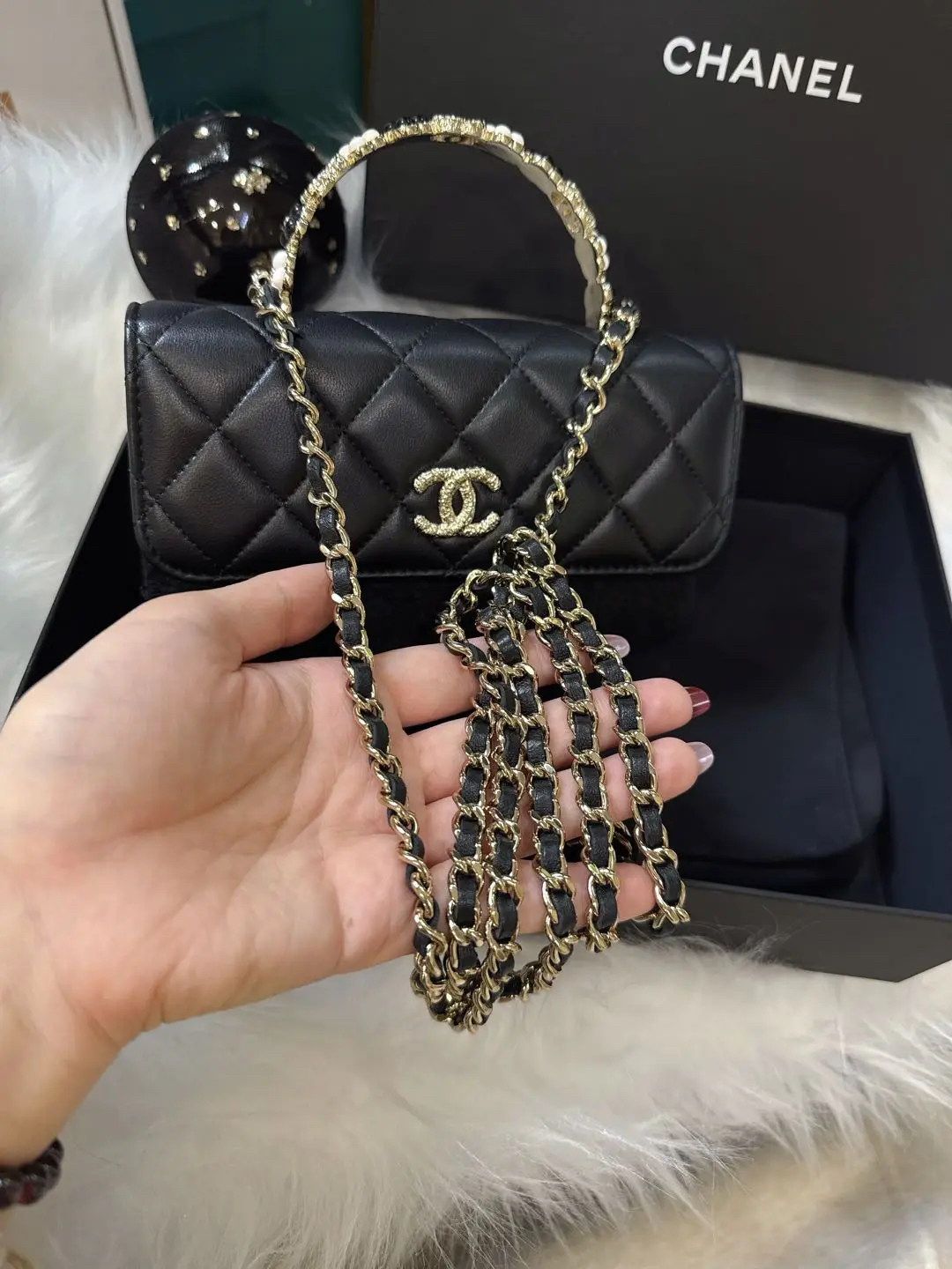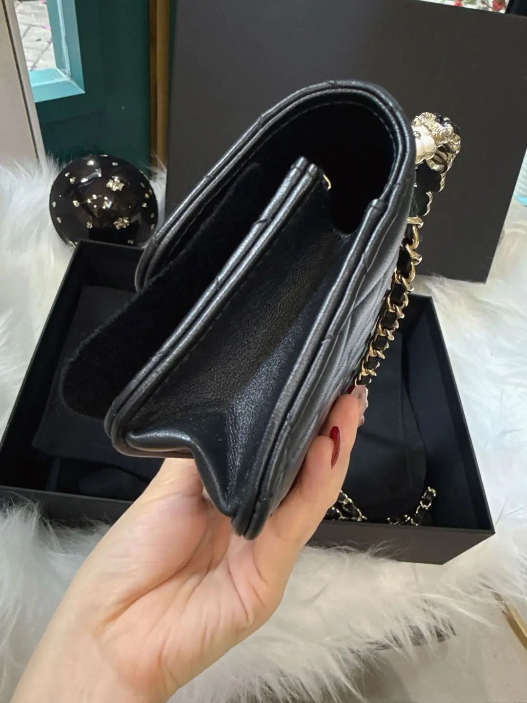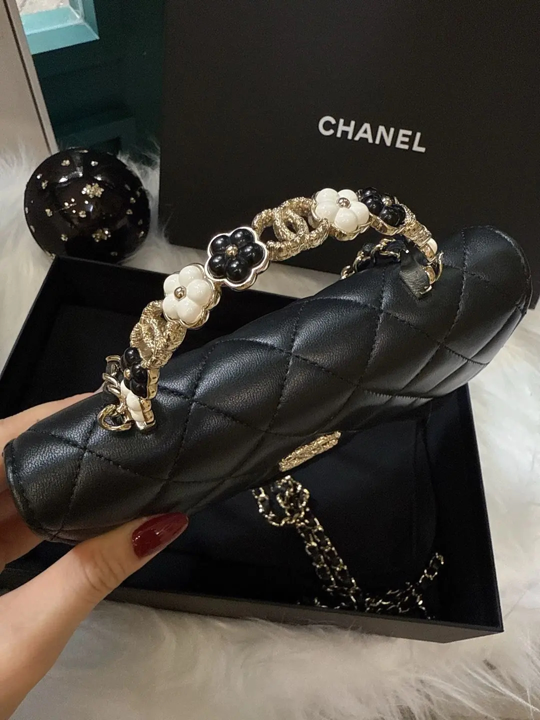 【商品详情】正品二手 Chanel 23k 山茶花手柄 woc 羊皮 手提包👜98新 19*12 新钢标 配件:说明书 防尘袋 盒子。精致女孩必入