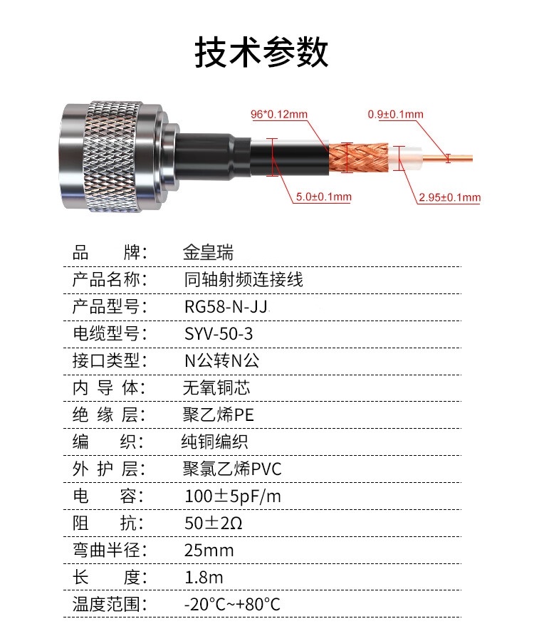 商品名称:同轴射频线 BNC公转BNC公转接线 RG58同轴线SYV50-3跳线馈线 BNCJ-BNCJ JHR-RG58-BNC-JJ
