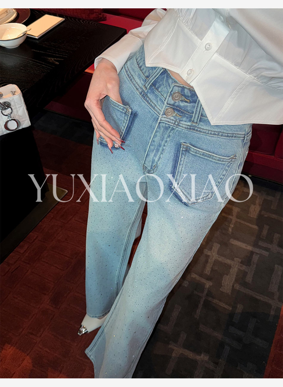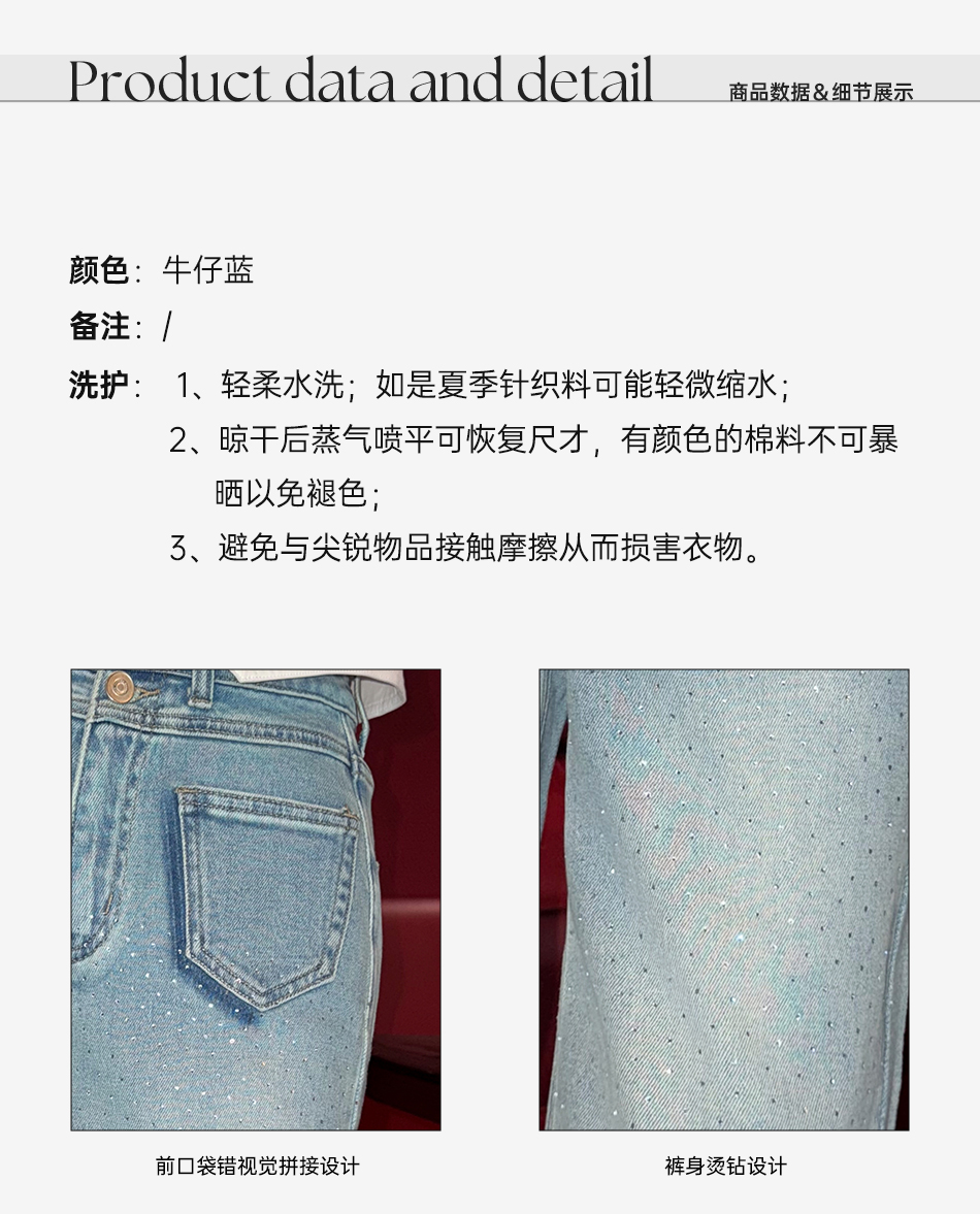 余潇潇【都市之星】时尚百搭拼接烫钻设计酵素水洗做旧直筒牛仔裤