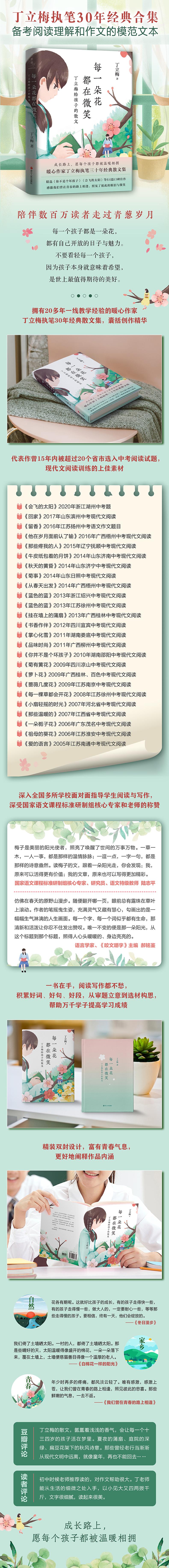 《每一朵花都在微笑:丁立梅给孩子的散文》是丁立梅执笔三十年经典散文集合,收入了《会飞的太阳》《幽幽七里香》《留香》《秋天的黄昏》等诸多入选中考语文试题的文章。丁立梅的文章多记录日常生活的小场景、小事件,能从小人物身上发现人性光芒。其温暖、明亮、清新、隽永的风格非常适合学生和青少年的阅读,在语言、文眼、标题、意境等方面都有独到之处,让学生能通过阅读,提高对日常生活的关注,增强自己的文章阅读能力,培养自然而然的写作力。每一个孩子都是一朵花,都有自己开放的日子与魅力。不要看轻每一个孩子,因为孩子本身就意味着希望,是世上最值得期待的美好。