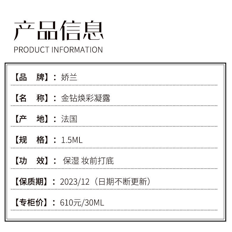 【爆款超低价预售 急单慎拍】五片价 娇兰金钻焕彩凝露1.5ml小样 金箔隔离妆前乳试用装 专柜