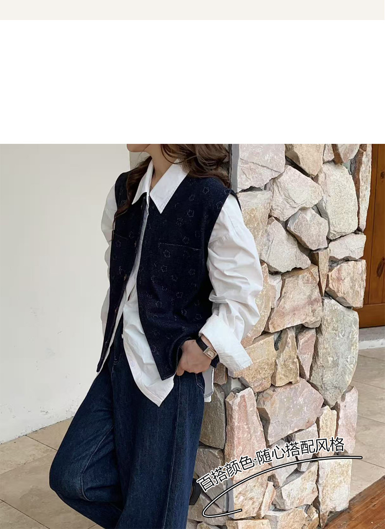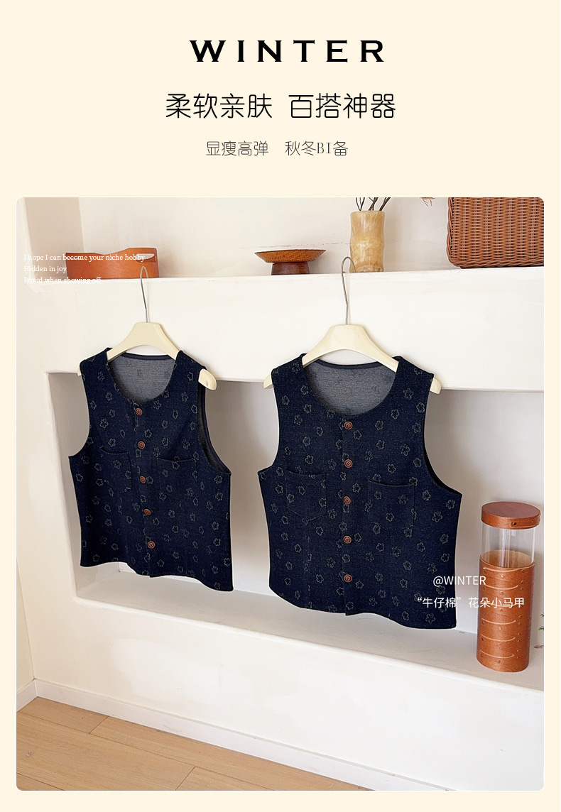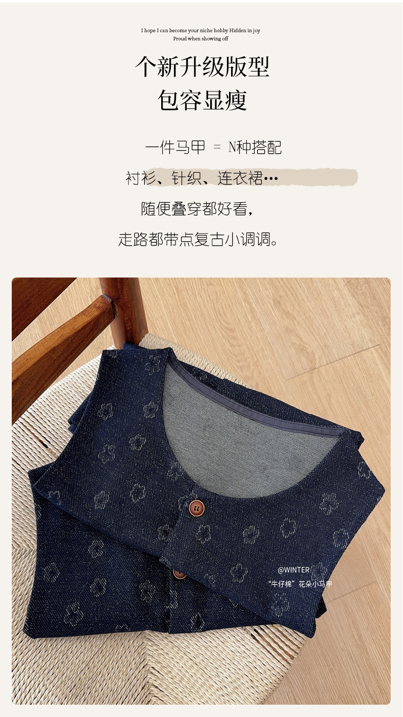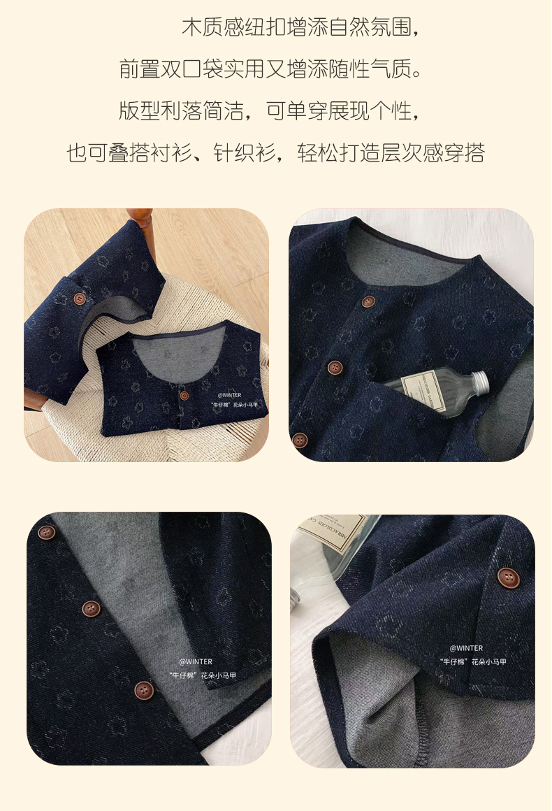 LUOQIQI牛仔花牛仔马甲 木质色纽扣+双口袋 细节感满满 小花纹低调又精致 复古耐看不过时