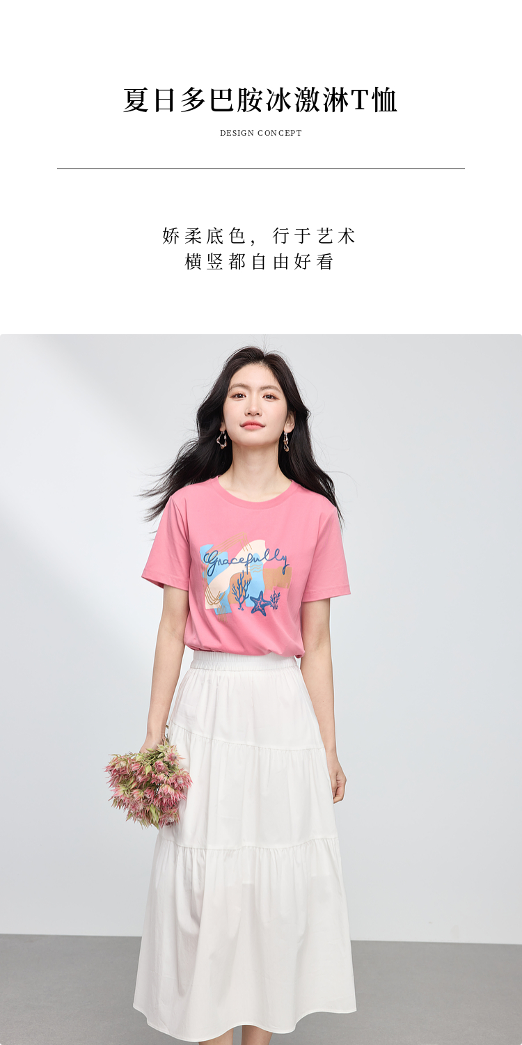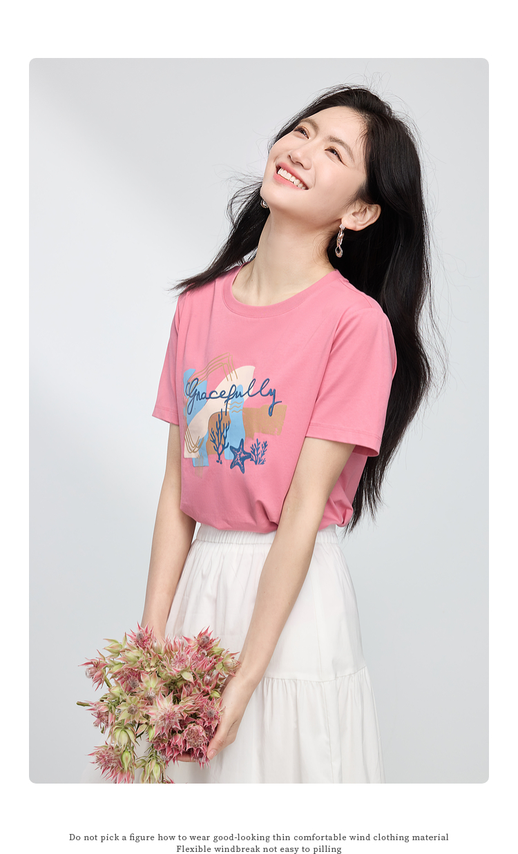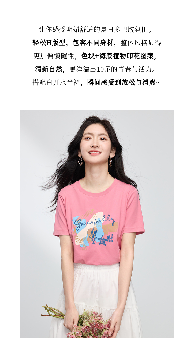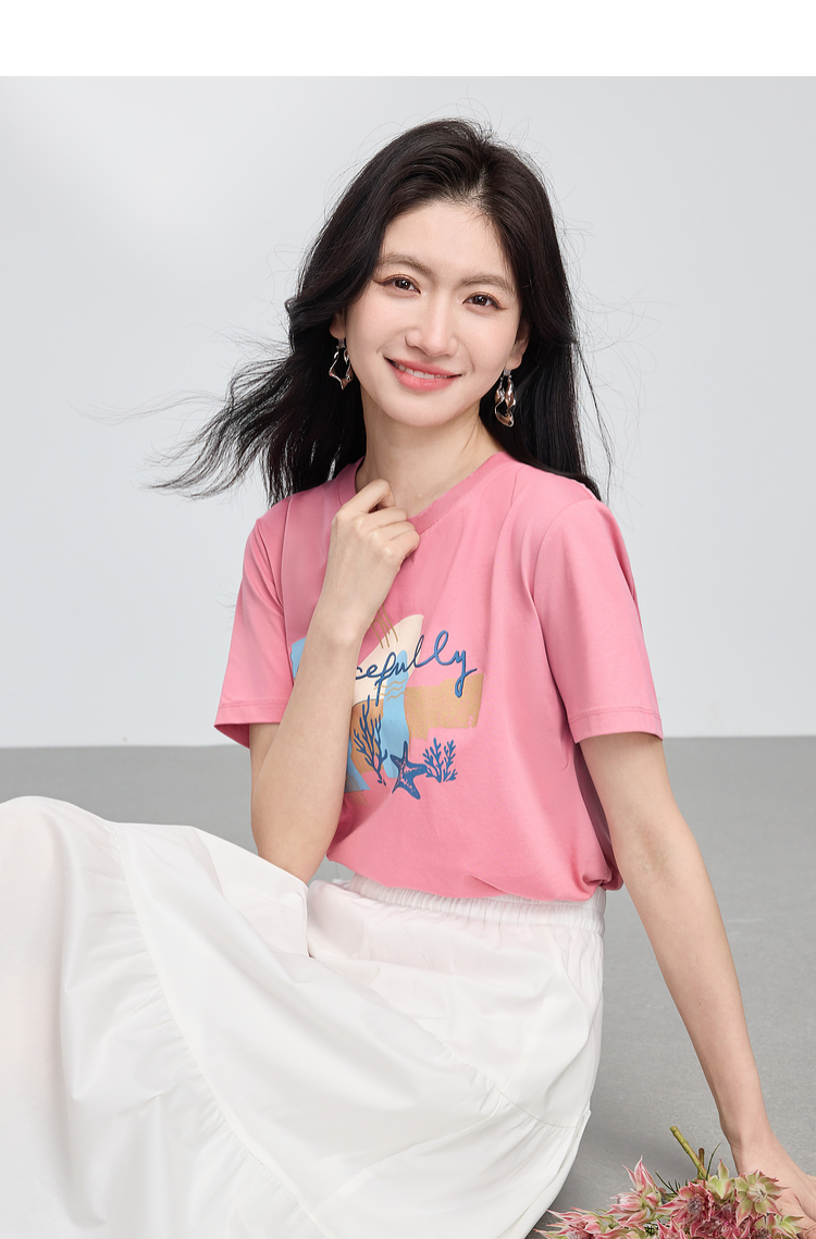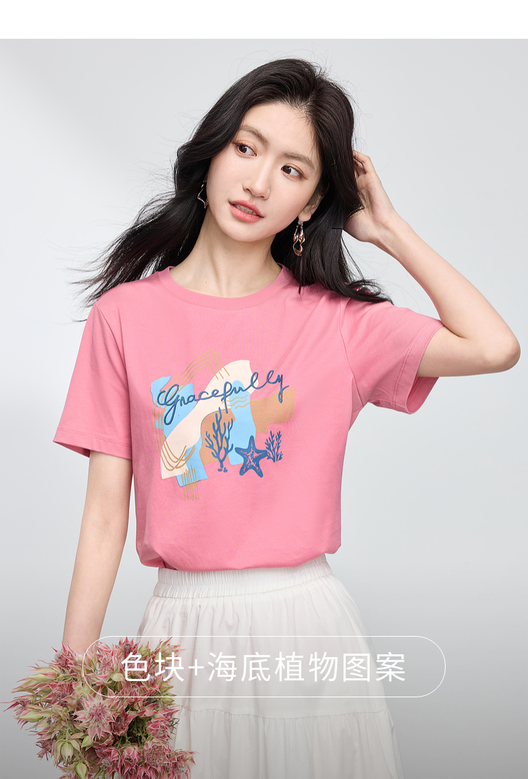 【专属特价】熙世界休闲印花体恤上衣女2025夏季新款时尚流行粉色短袖T恤正肩